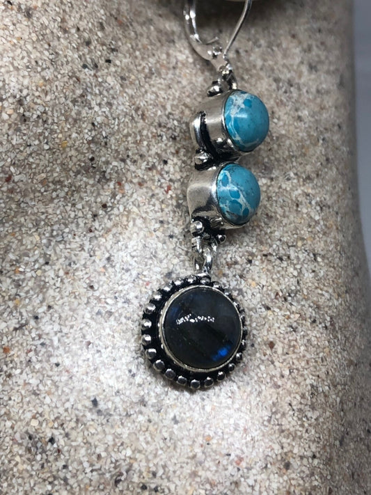 Vintage Handmade Sterling Silver Genuine Deep Blue turquoise Larimar and Labradorite Earrings
