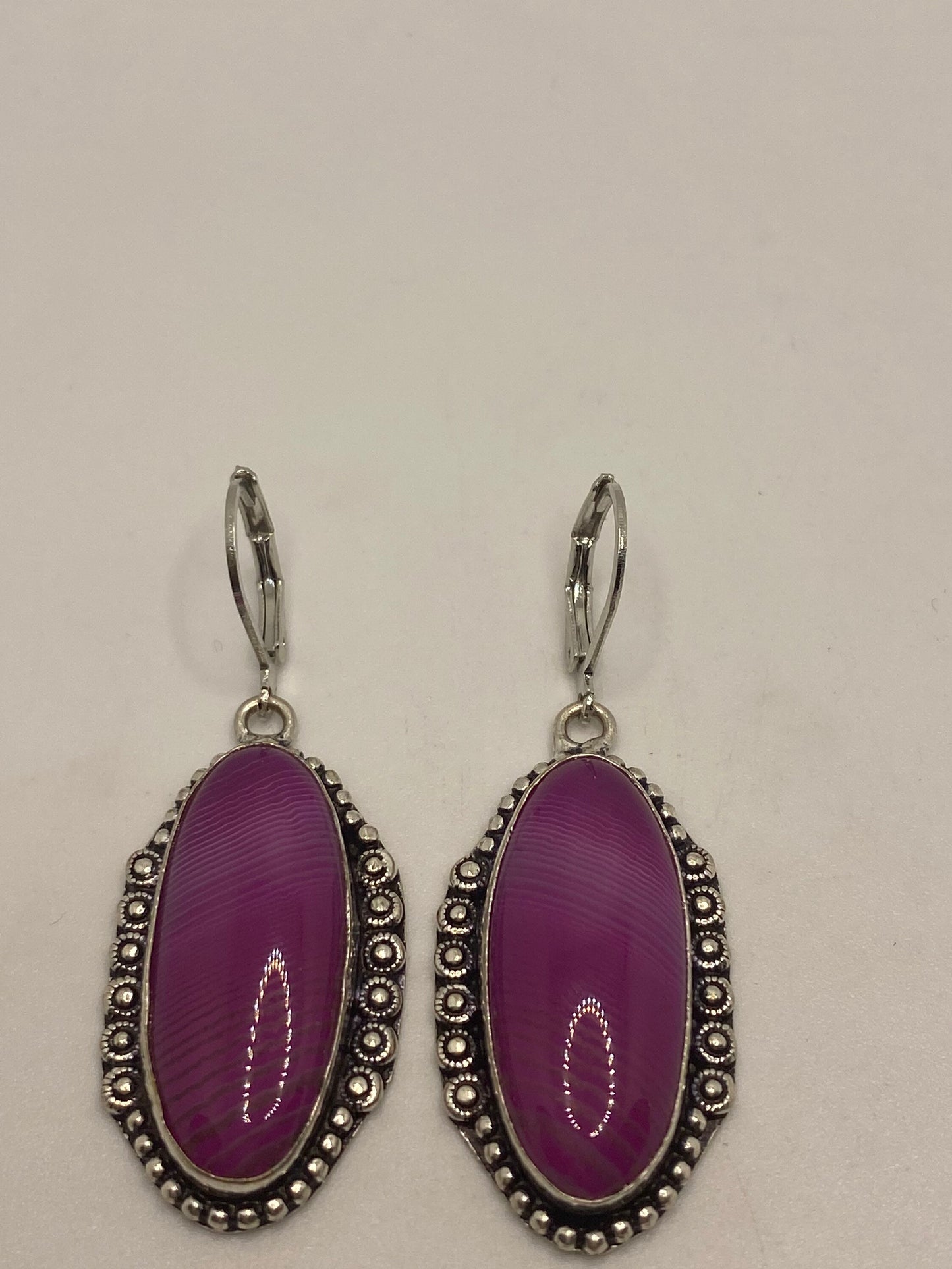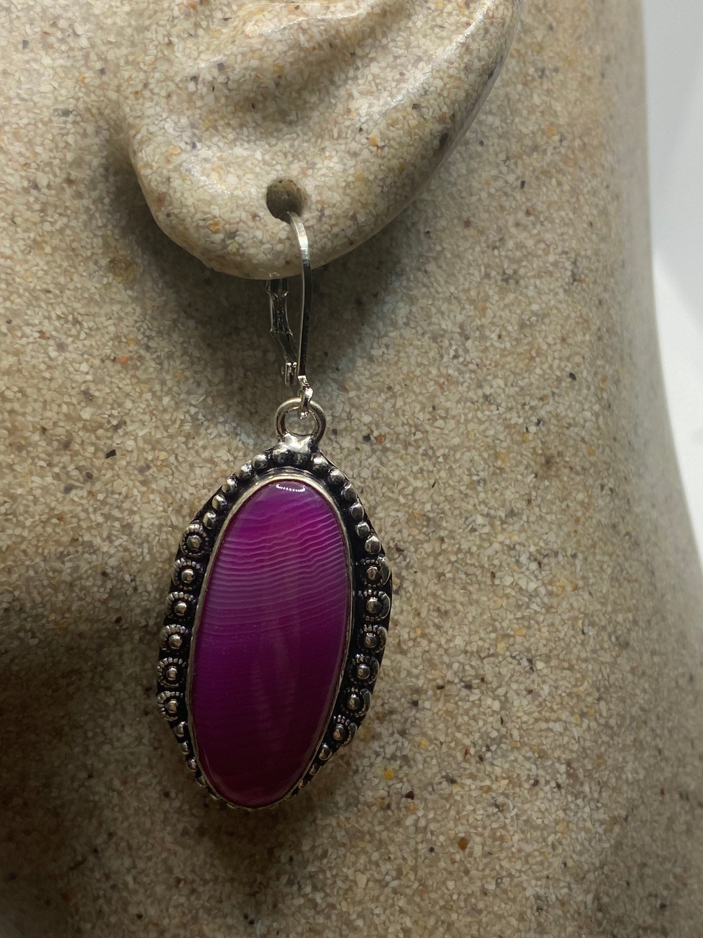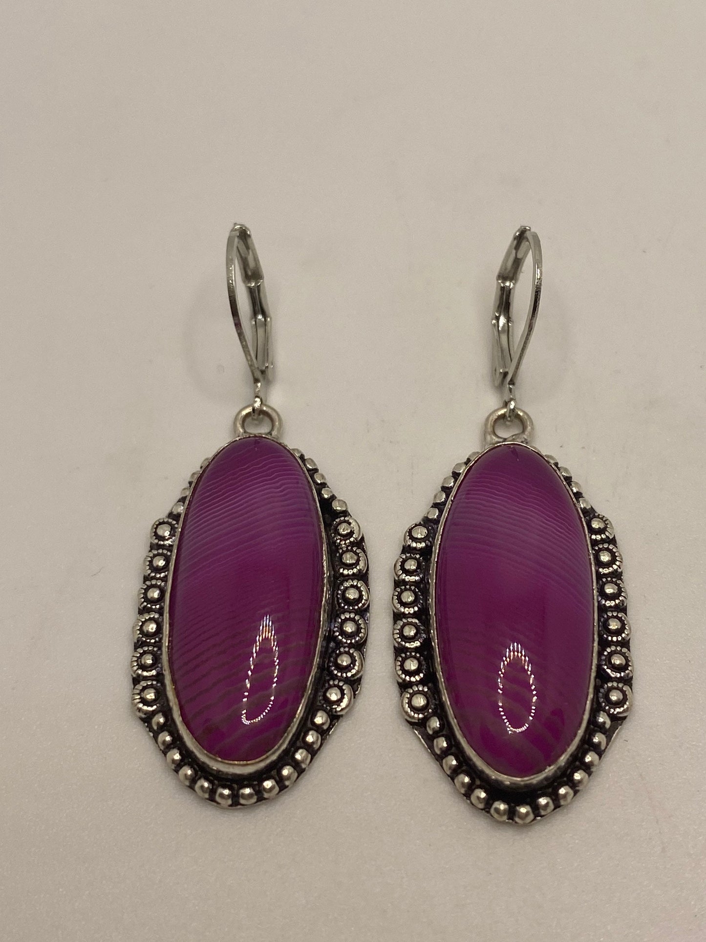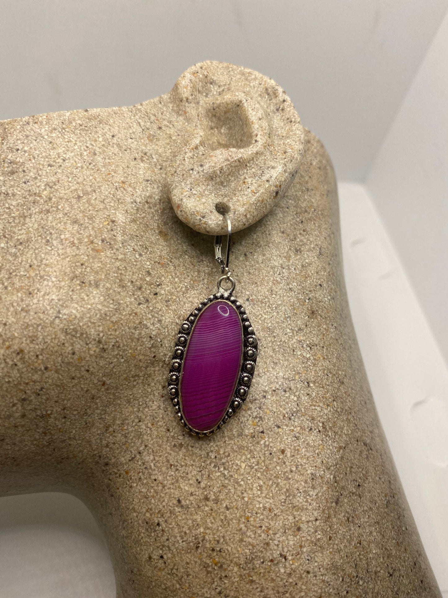 Antique Vintage Purple Banded agate Silver Dangle Earrings