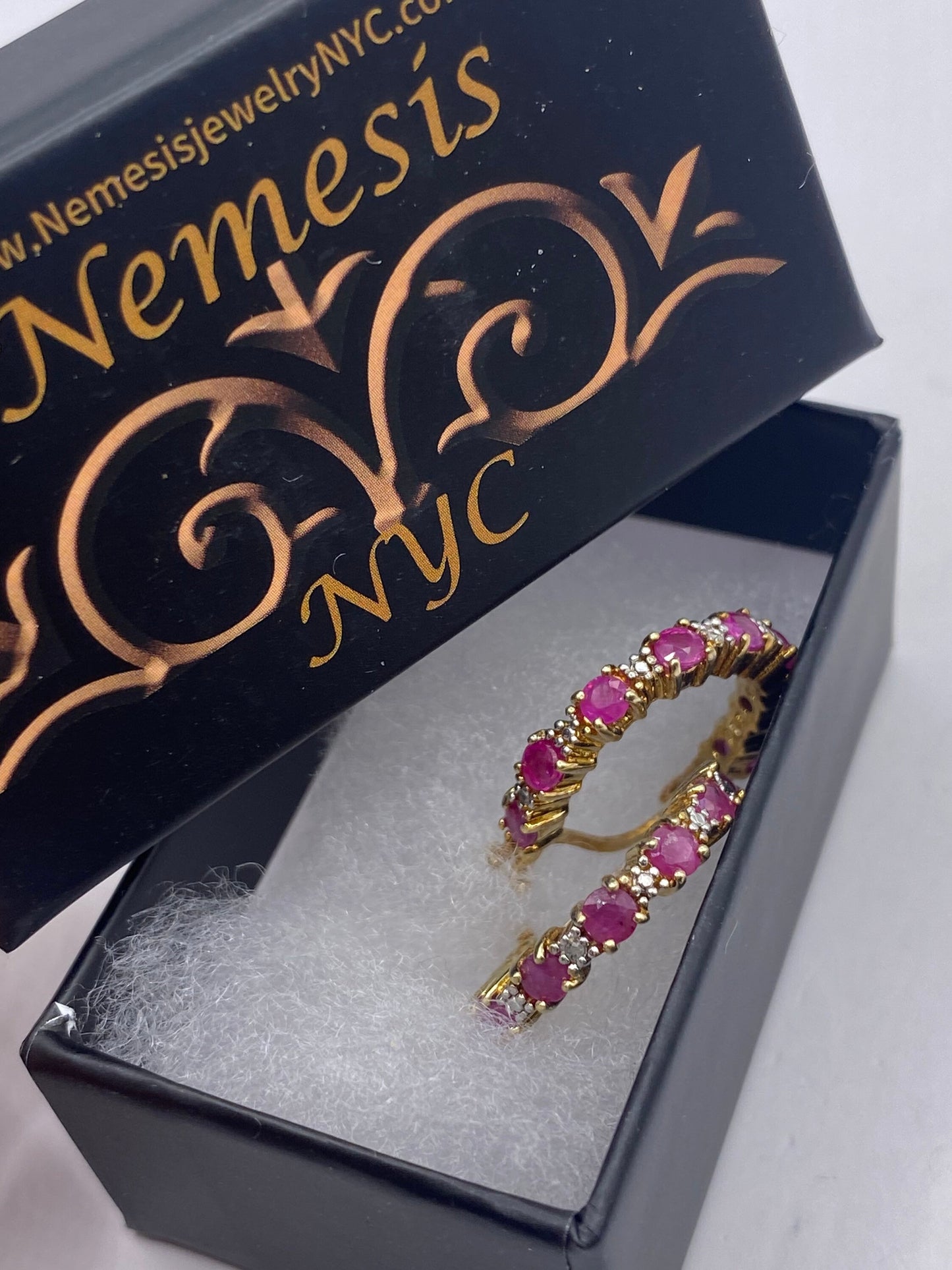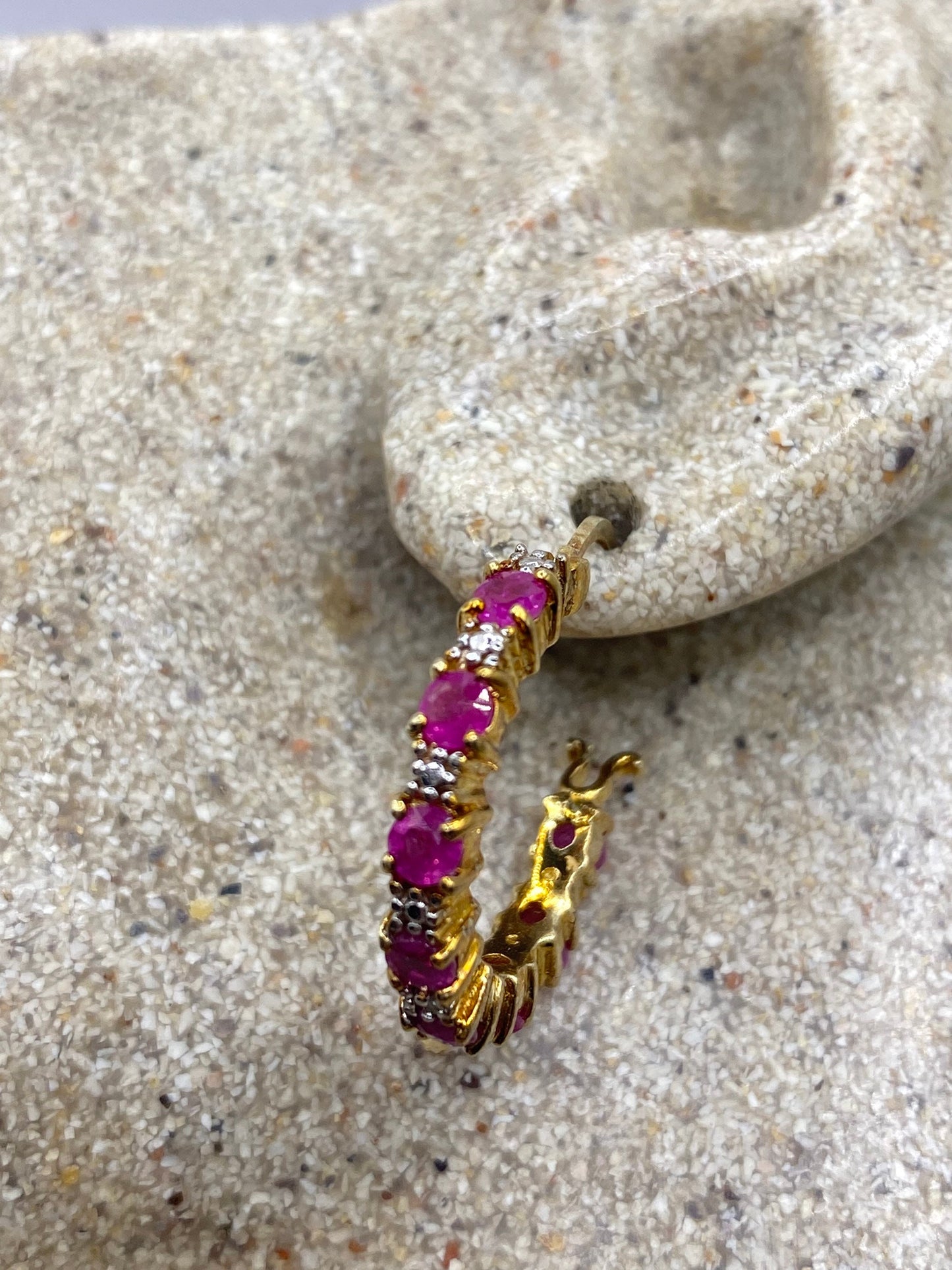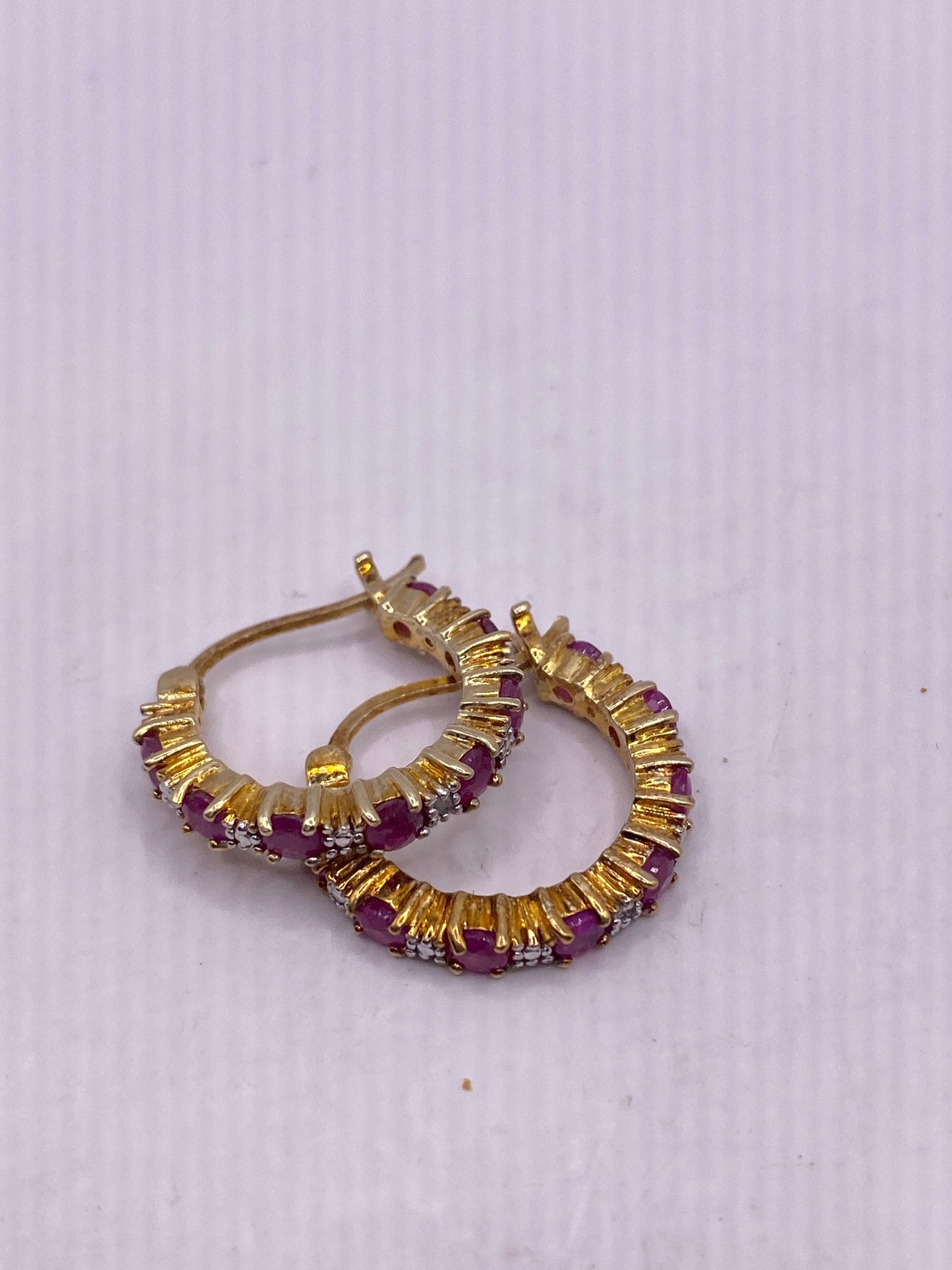 Vintage 925 Sterling Silver Deep Pink Ruby Diamond Hoop Earrings
