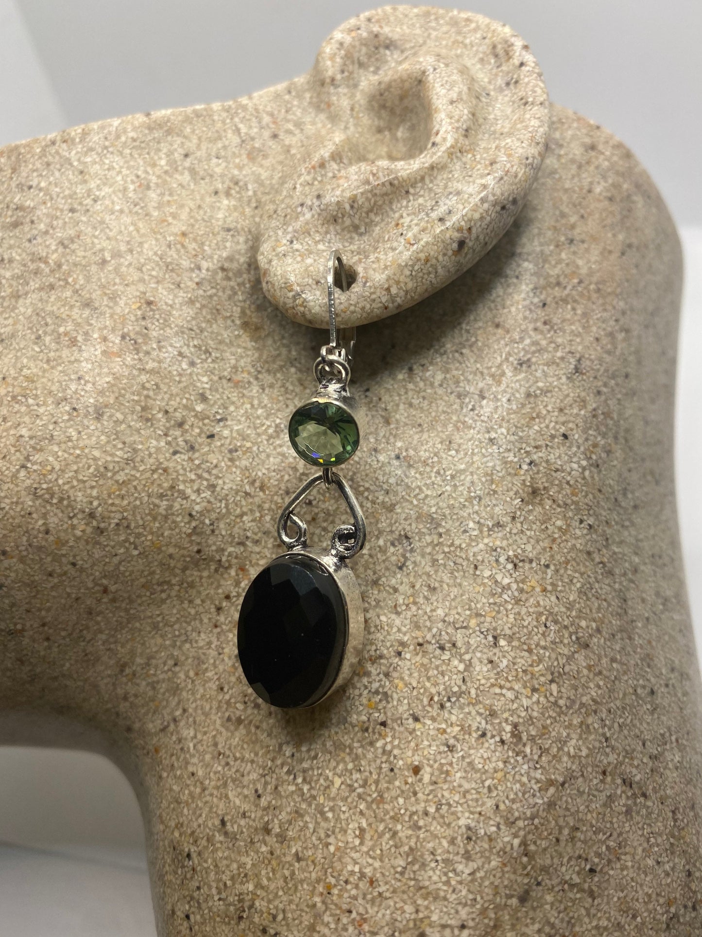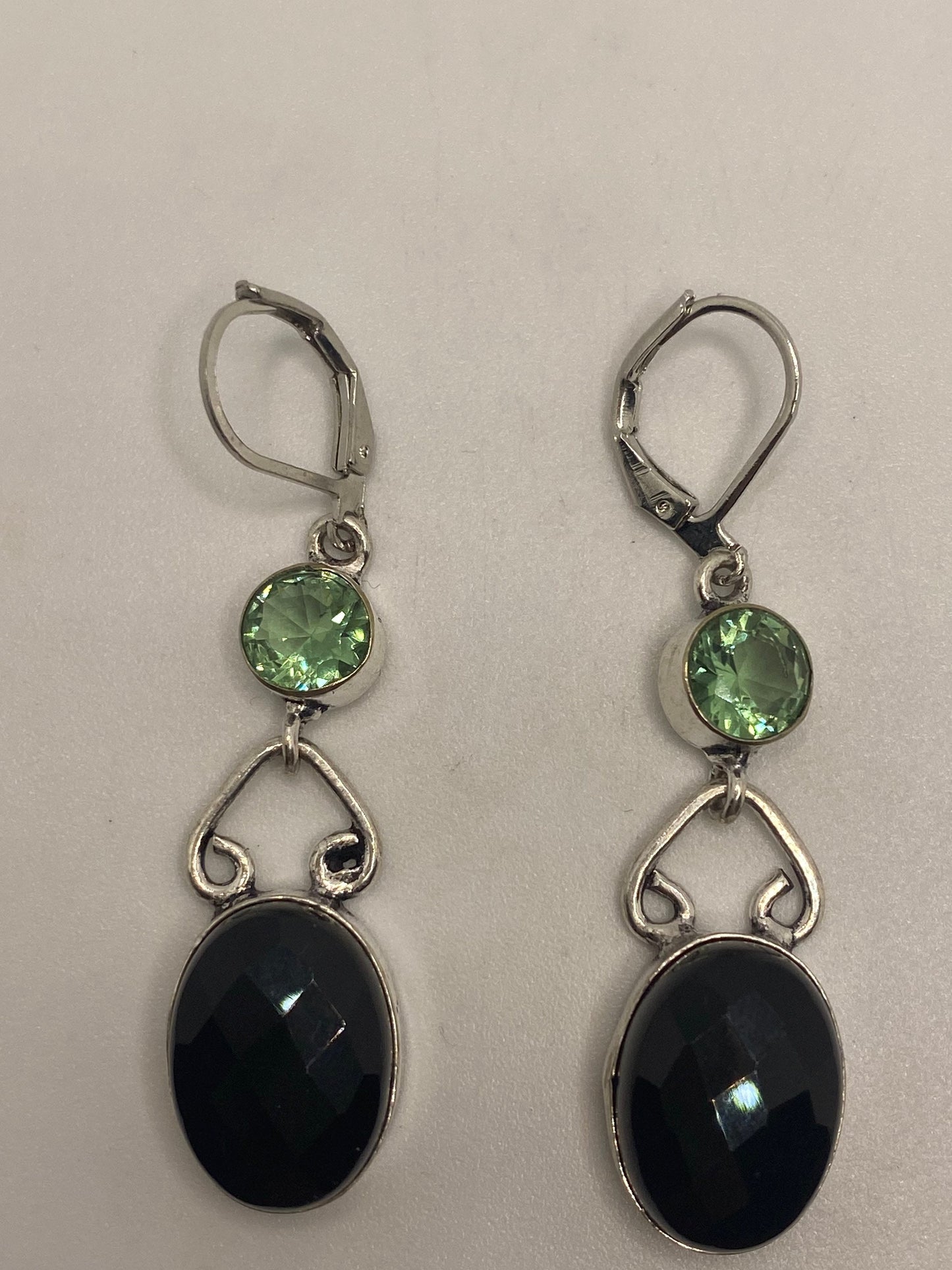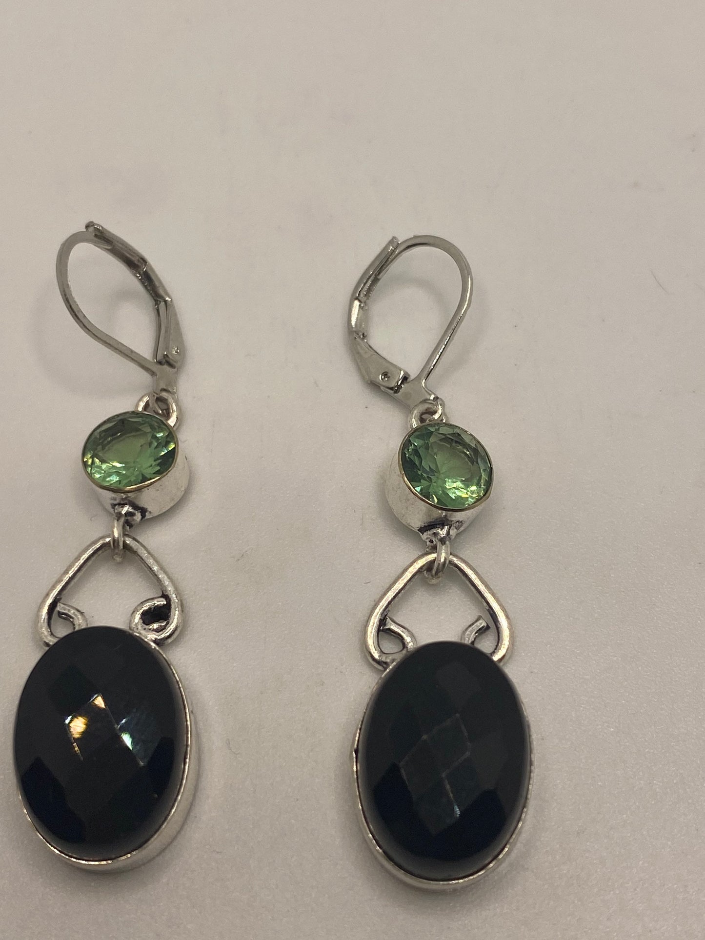 Vintage Black Onyx Green Peridot Earrings 925 Sterling Silver Deco Dangle Chandelier