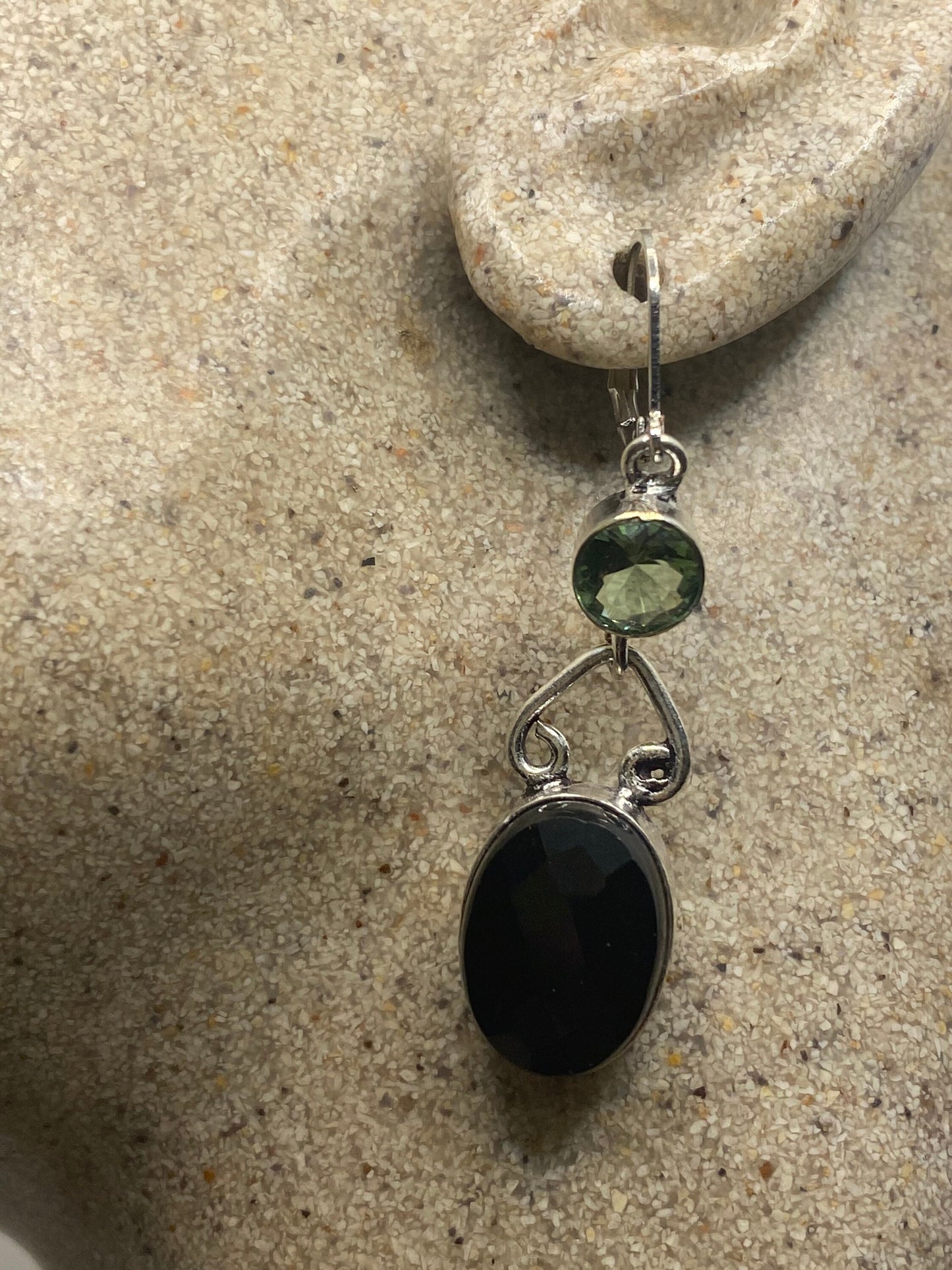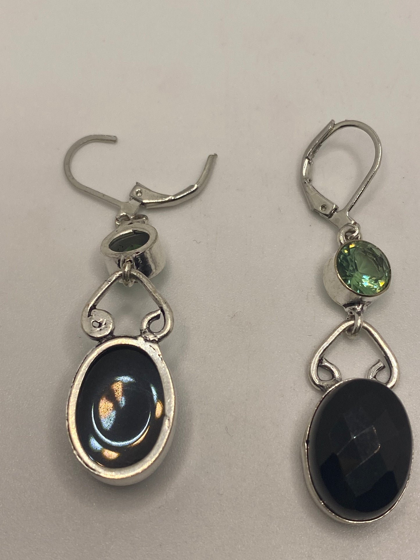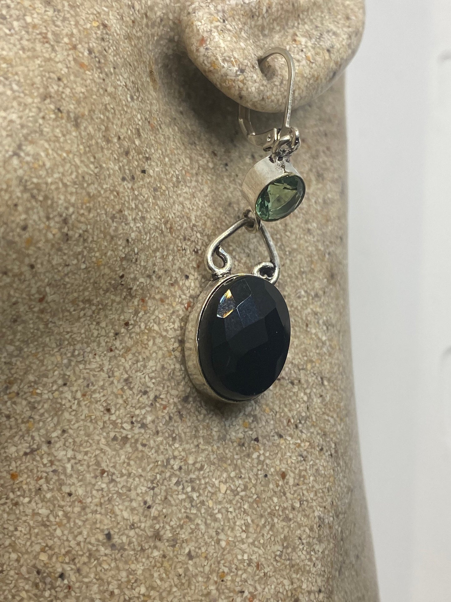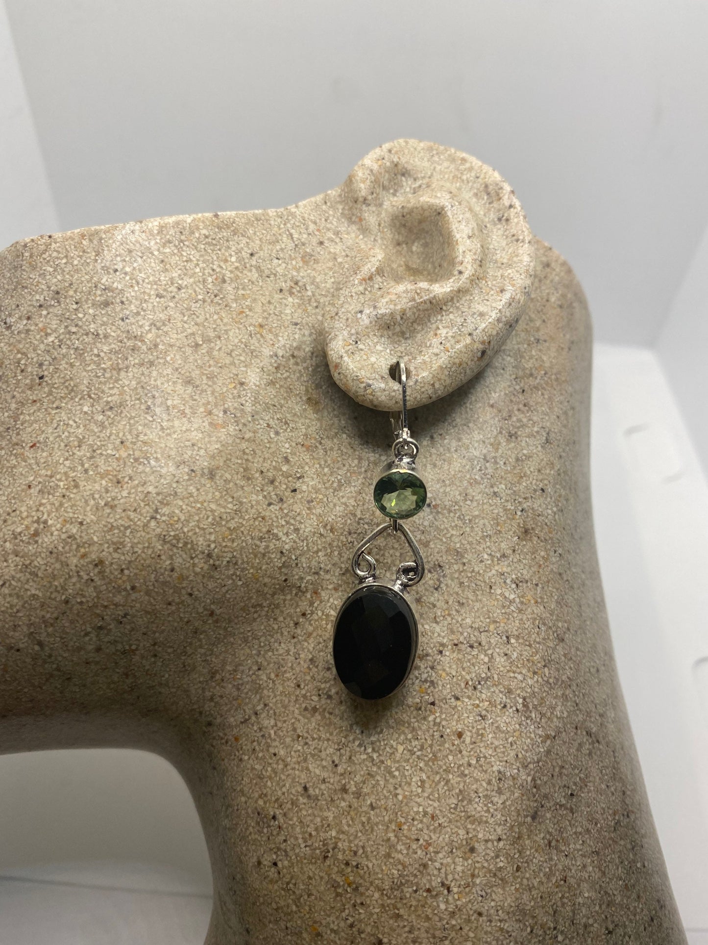 Vintage Black Onyx Green Peridot Earrings 925 Sterling Silver Deco Dangle Chandelier
