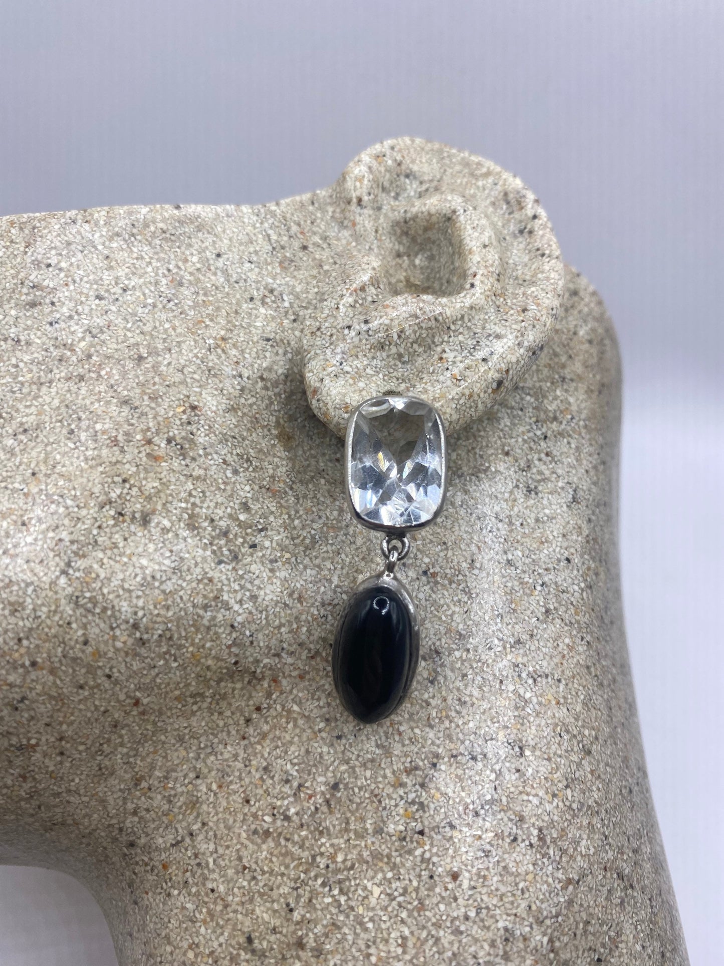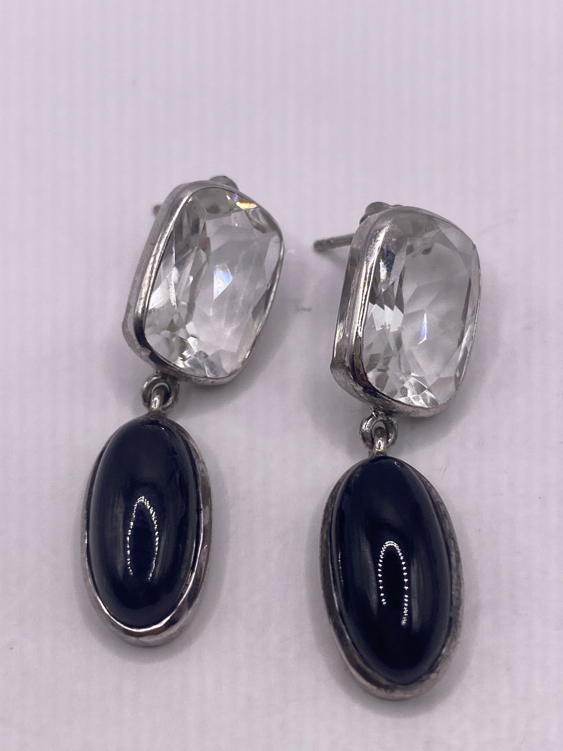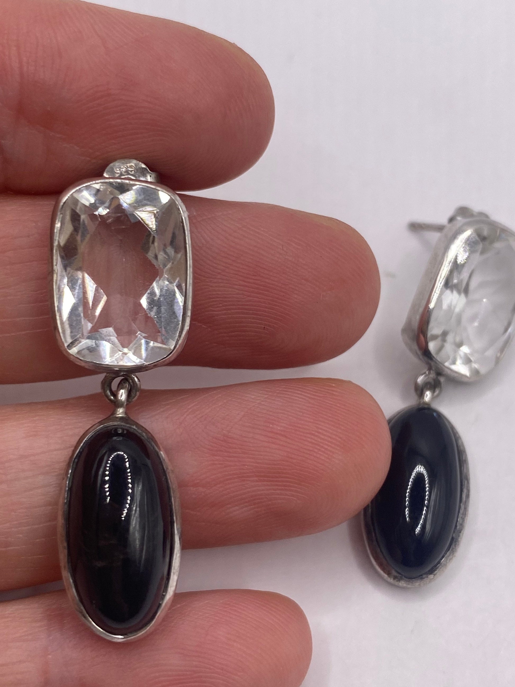 Vintage Black onyx white sapphire earring 925 Sterling Silver Deco dangle chandelier