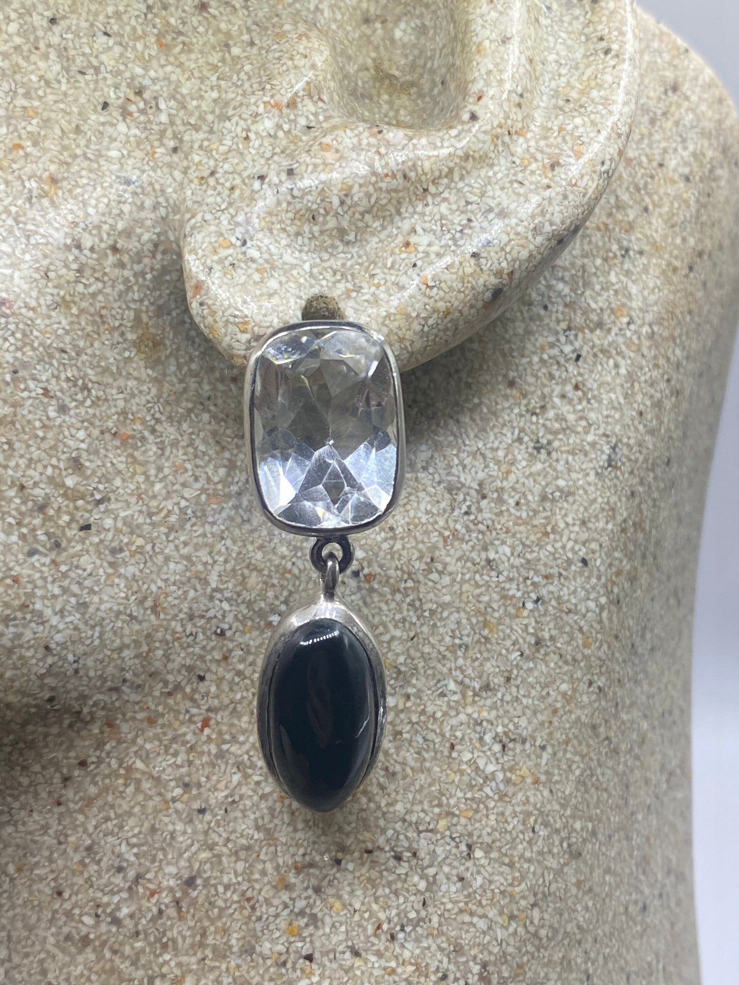 Vintage Black Onyx White Topaz Earring 925 Sterling Silver Deco Dangle Chandelier