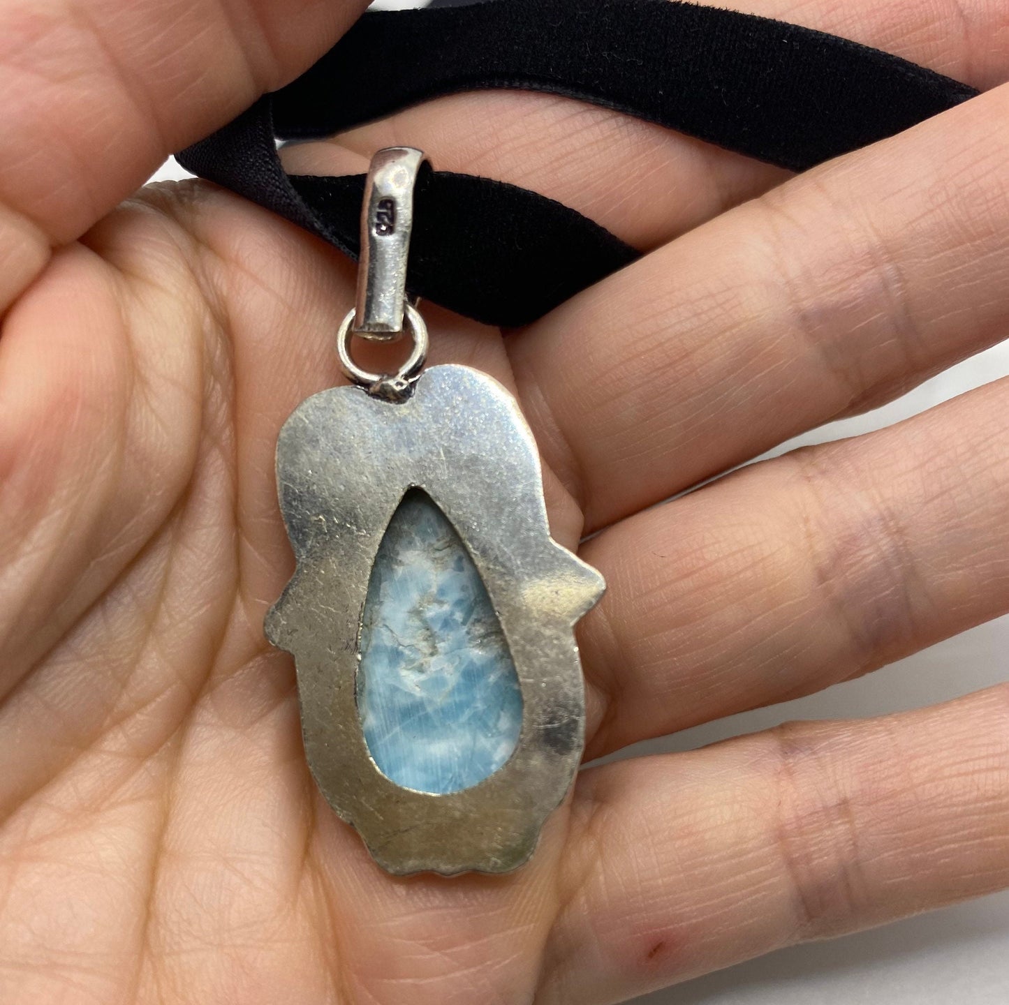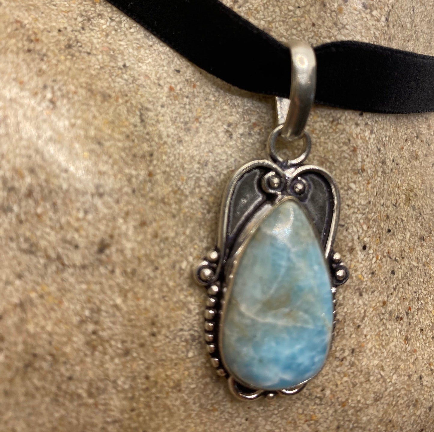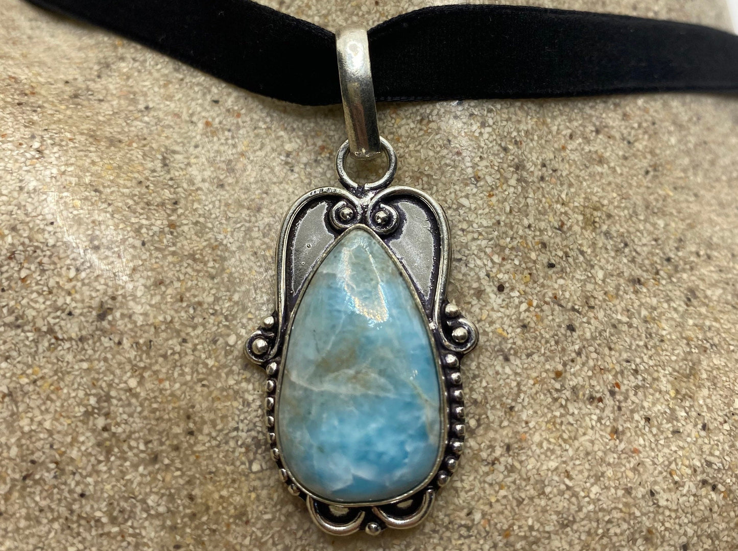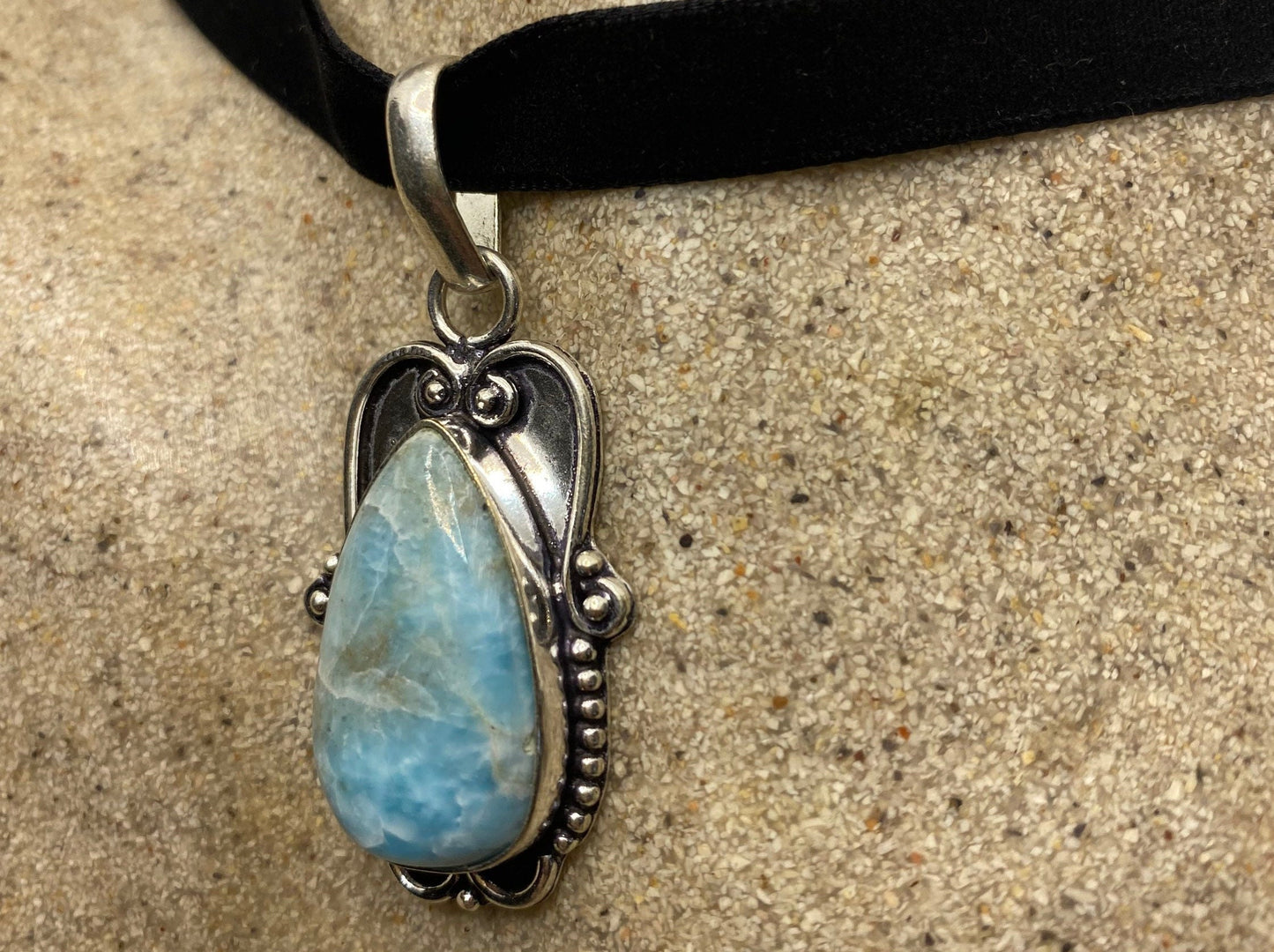 Vintage Blue Larimar Black Velvet Ribbon Choker Necklace