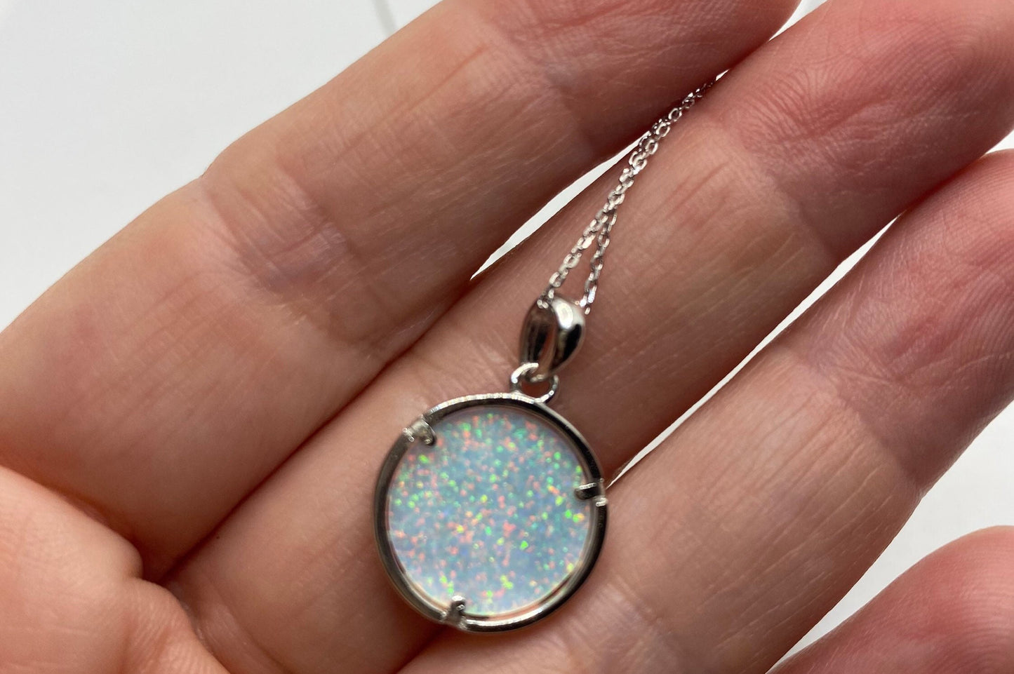 The fire opal dangles about a half inch and hangs from a 925 chain 16-18 in long