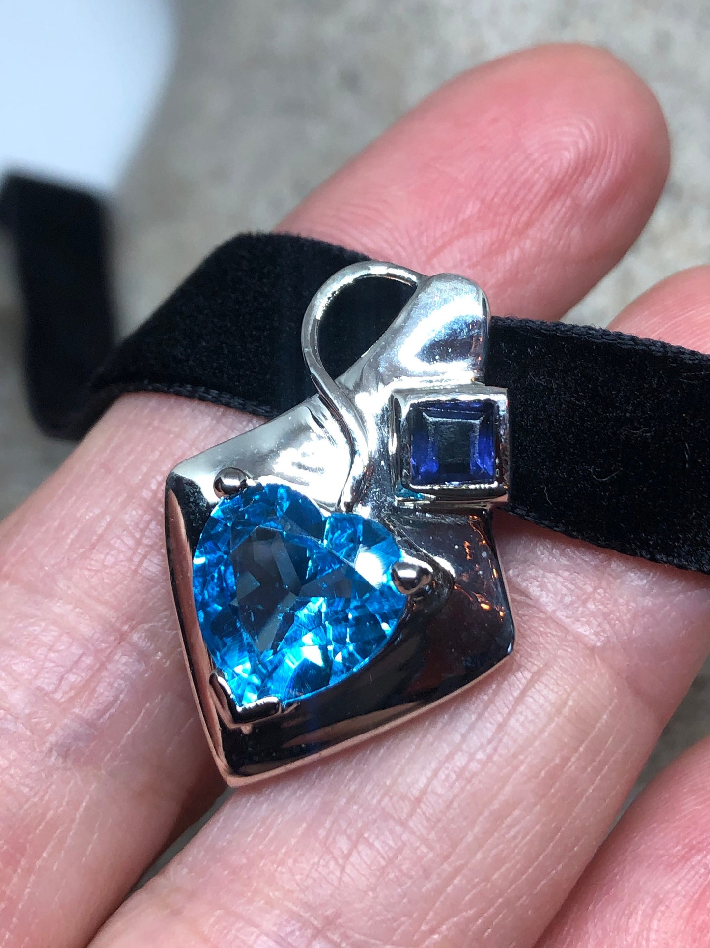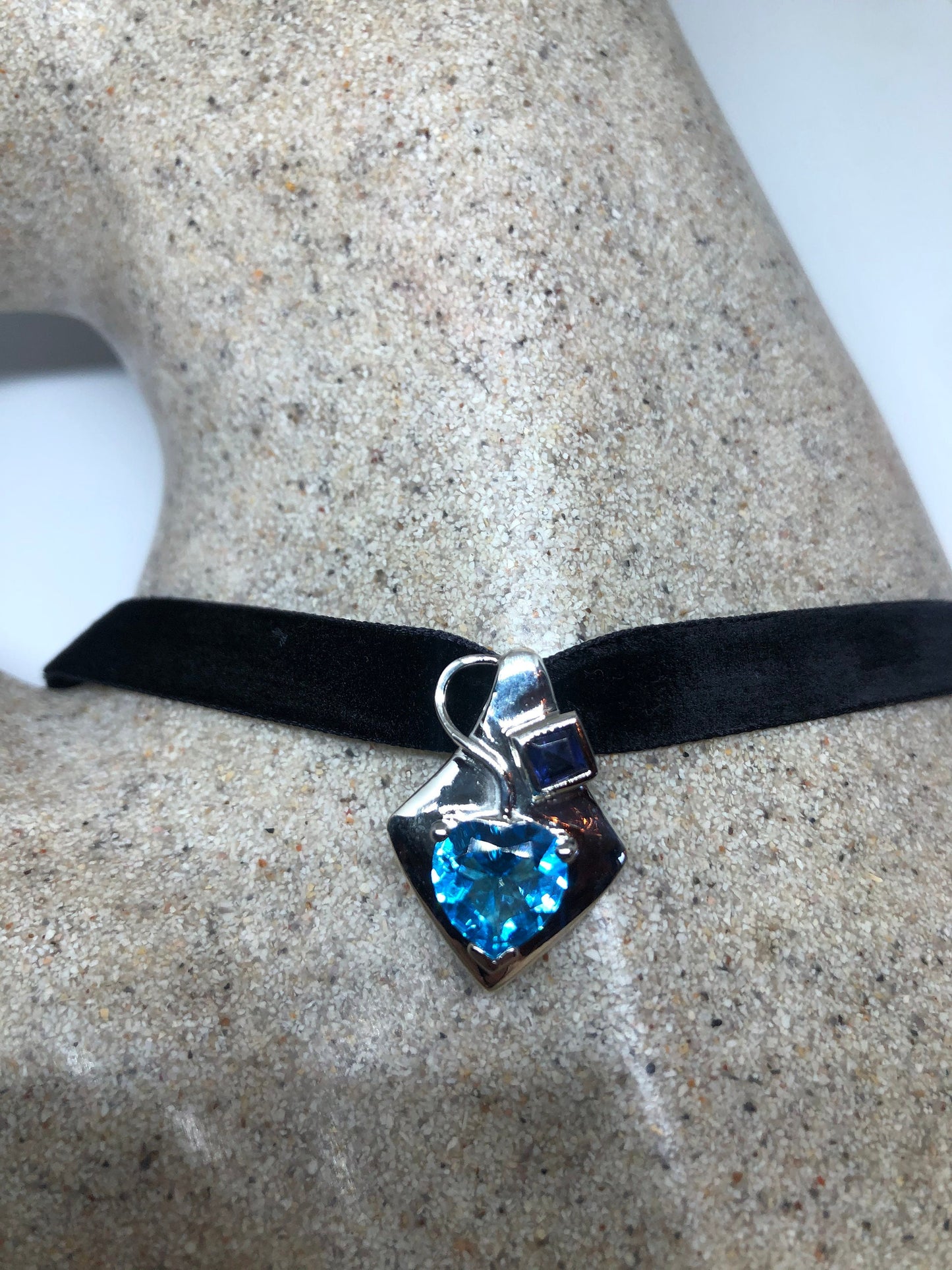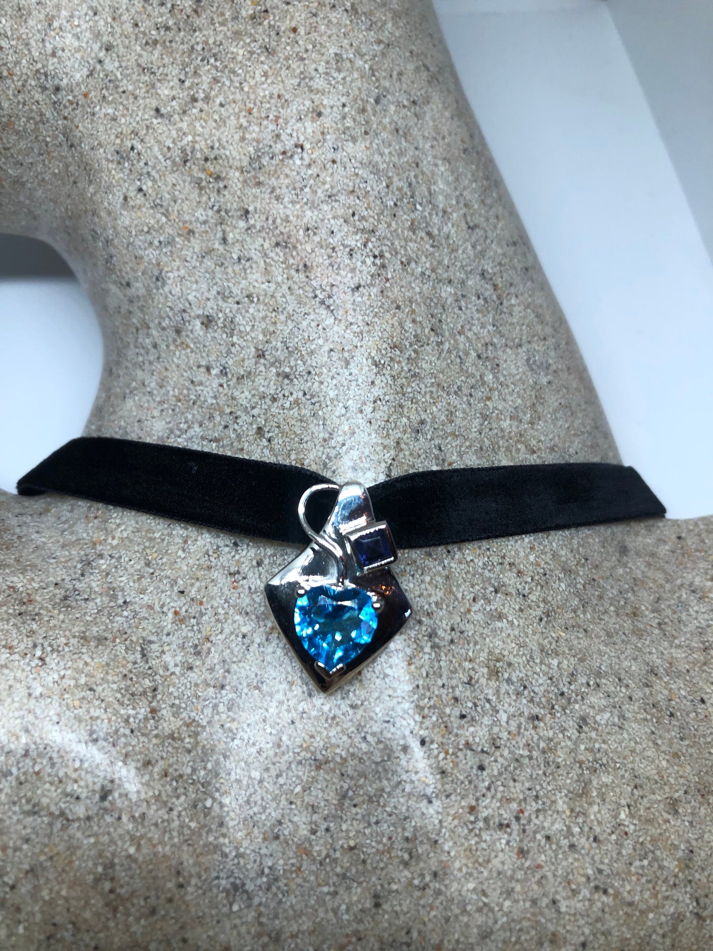 Vintage Genuine Blue Topaz 925 Sterling Silver Deco Choker Necklace Pendant