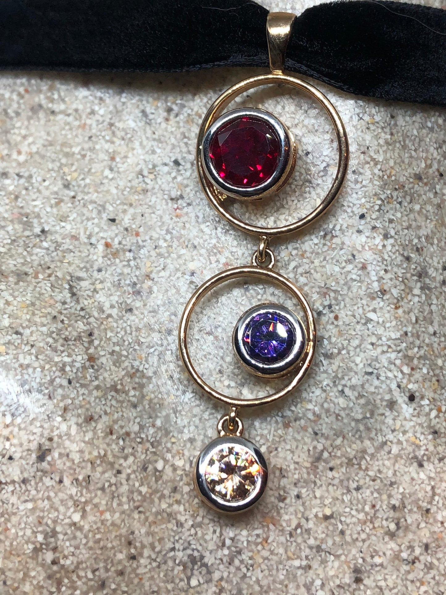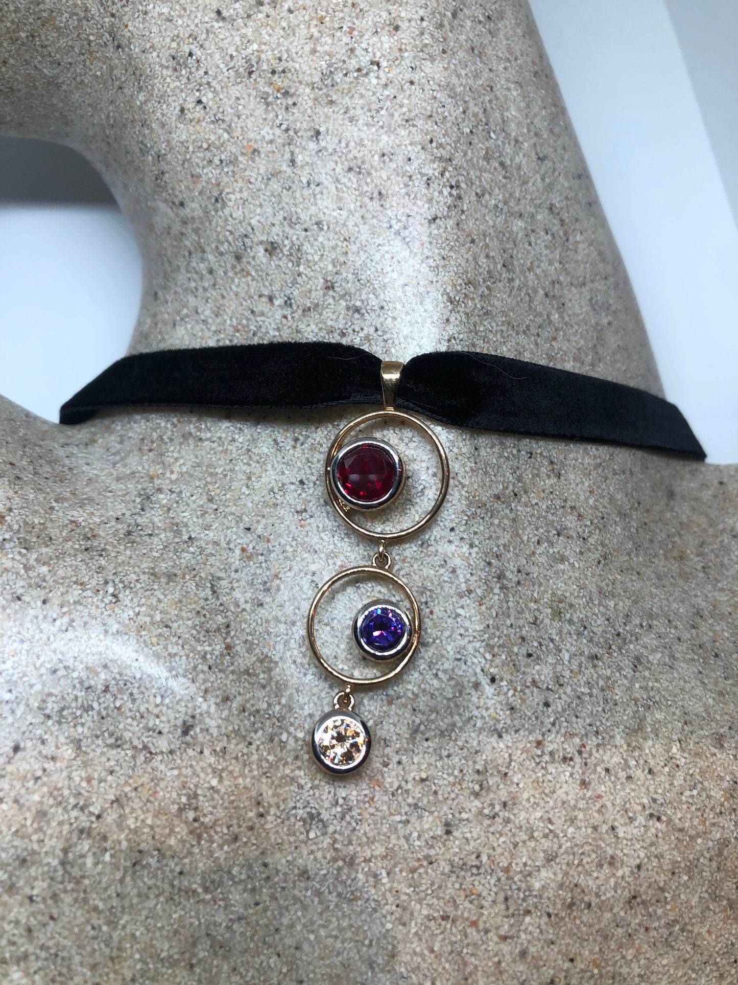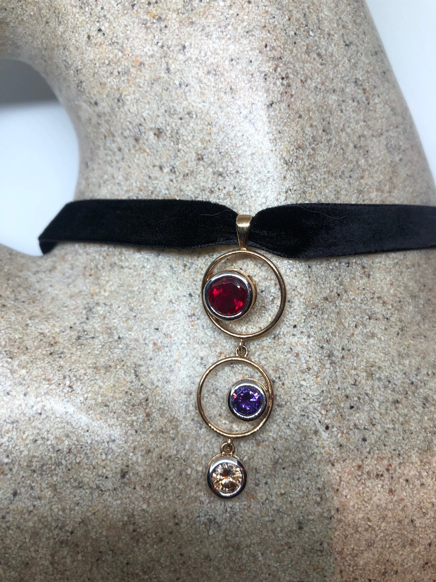 Hung on an adjustable velvet ribbon, can be worn on a chain.