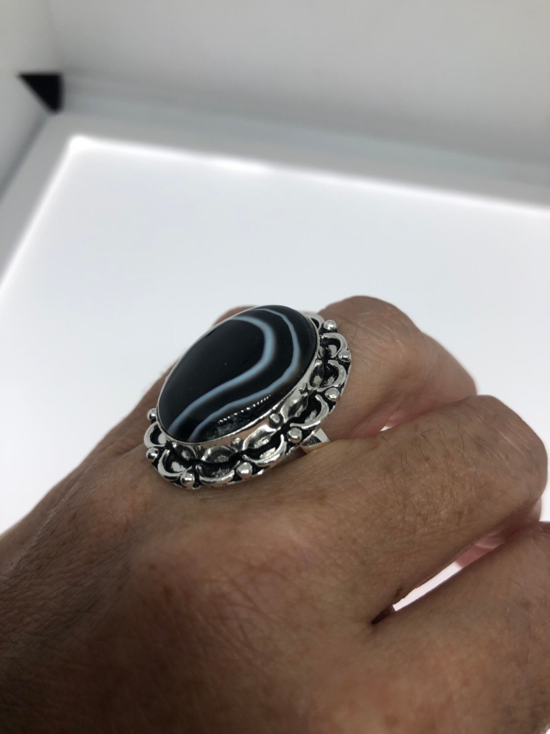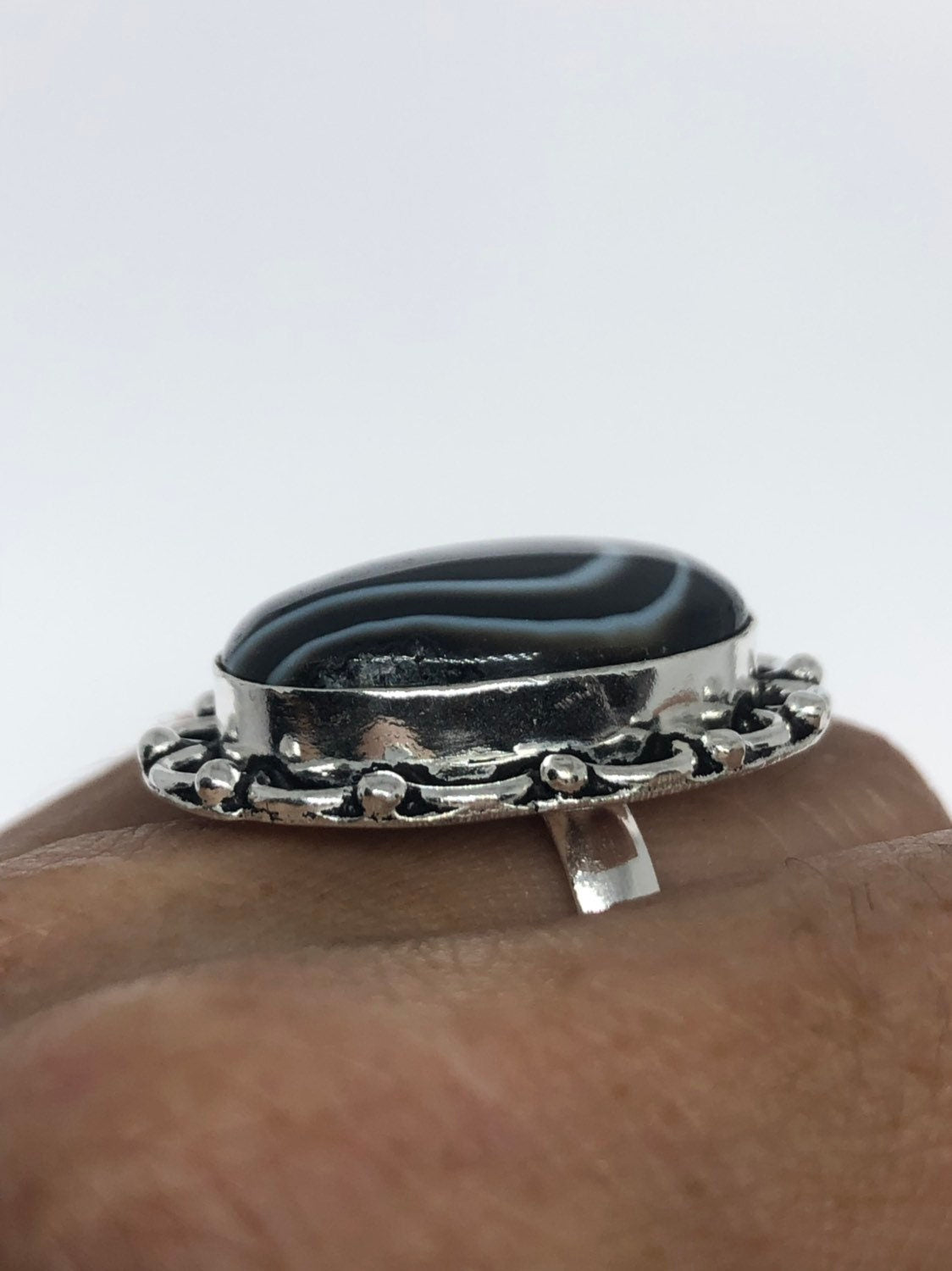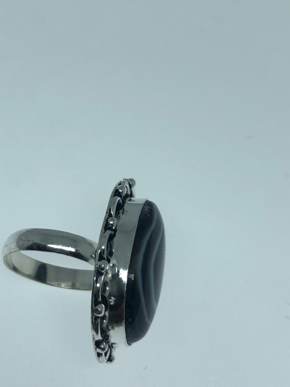 Vintage Handmade Black and White agate White Bronze Silver Gothic Ring