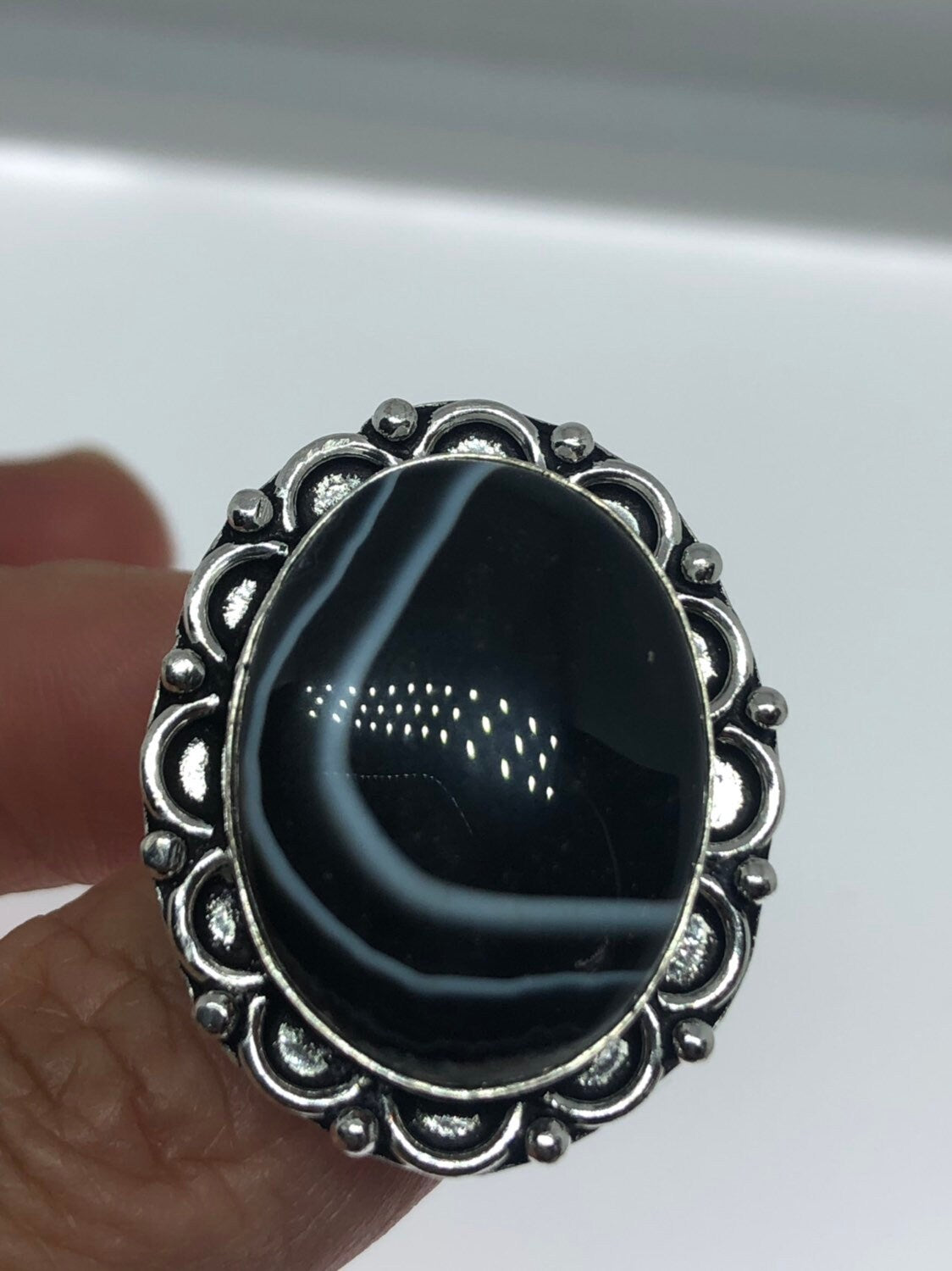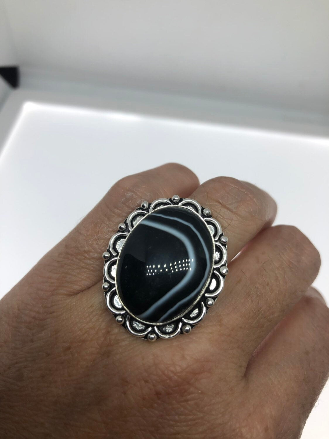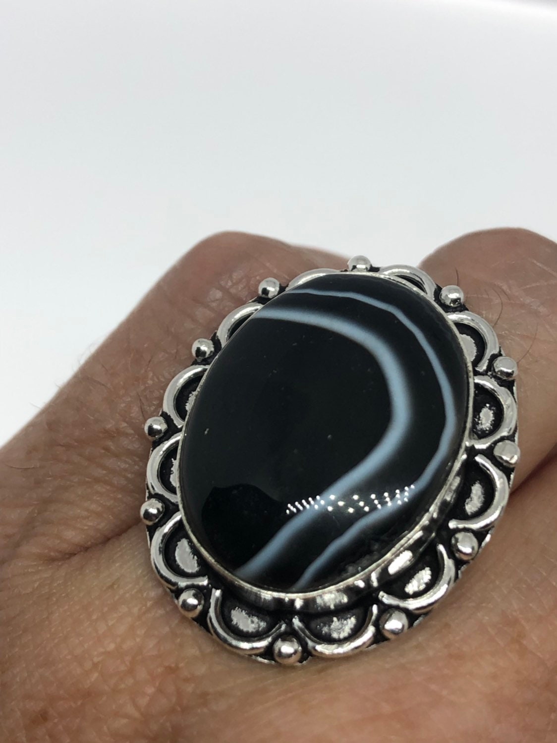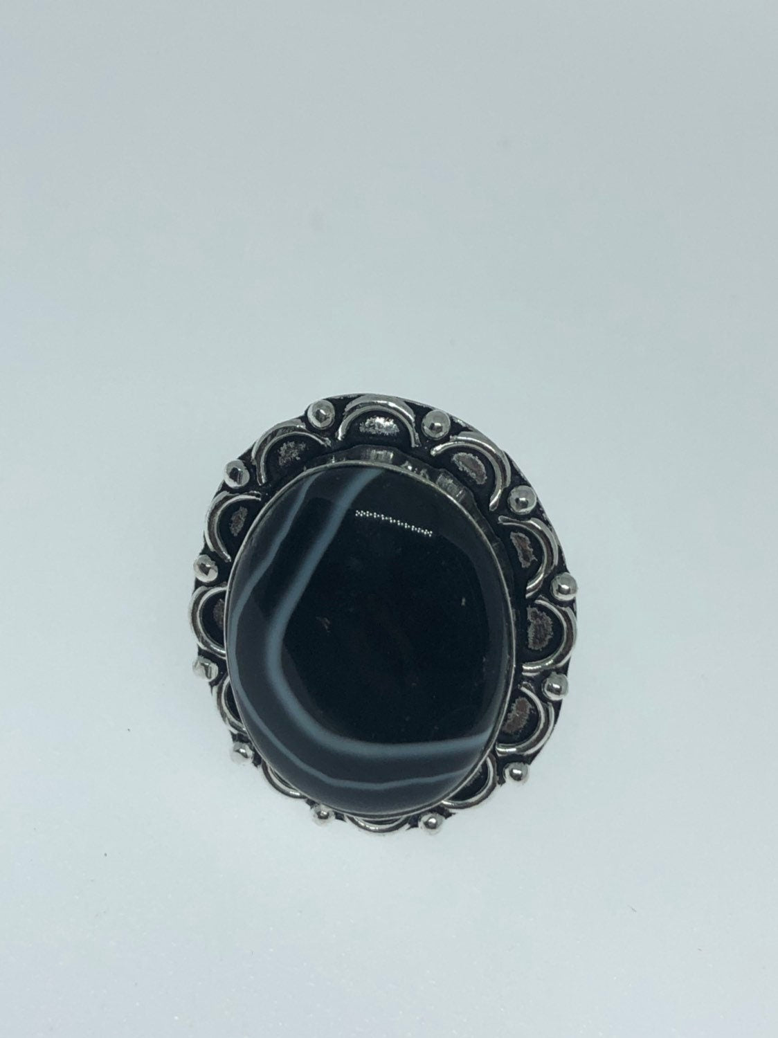 Vintage Handmade Black and White agate White Bronze Silver Gothic Ring