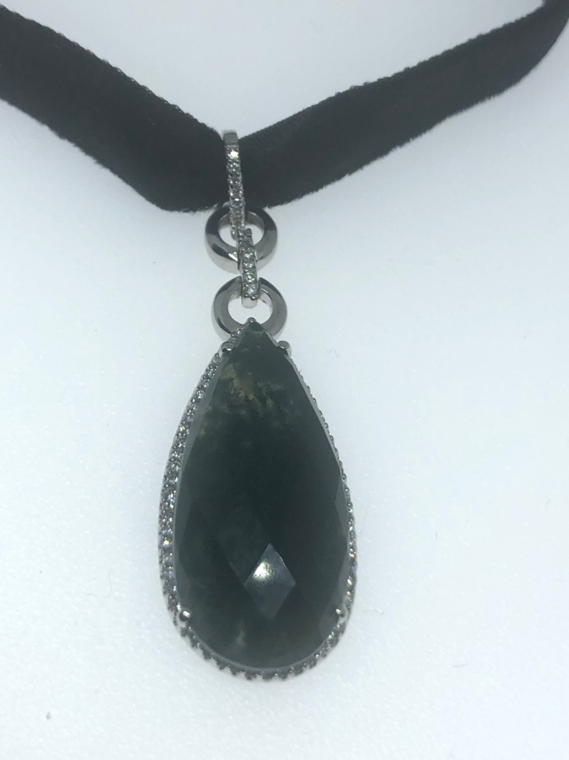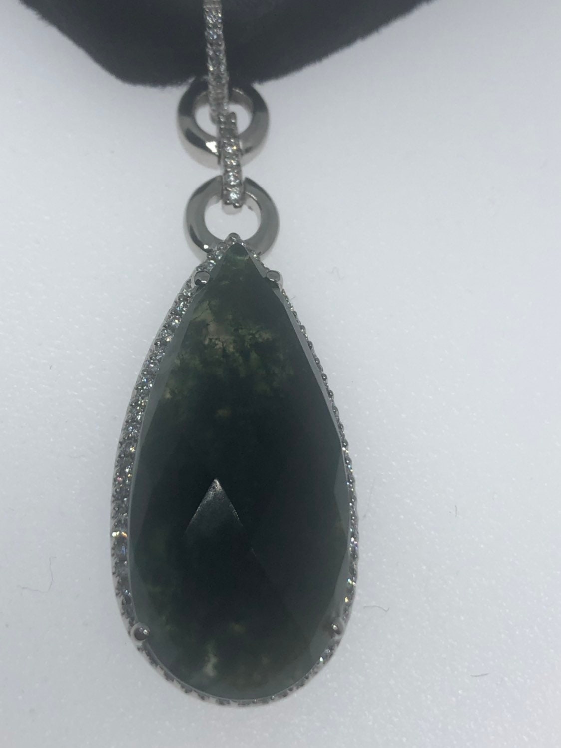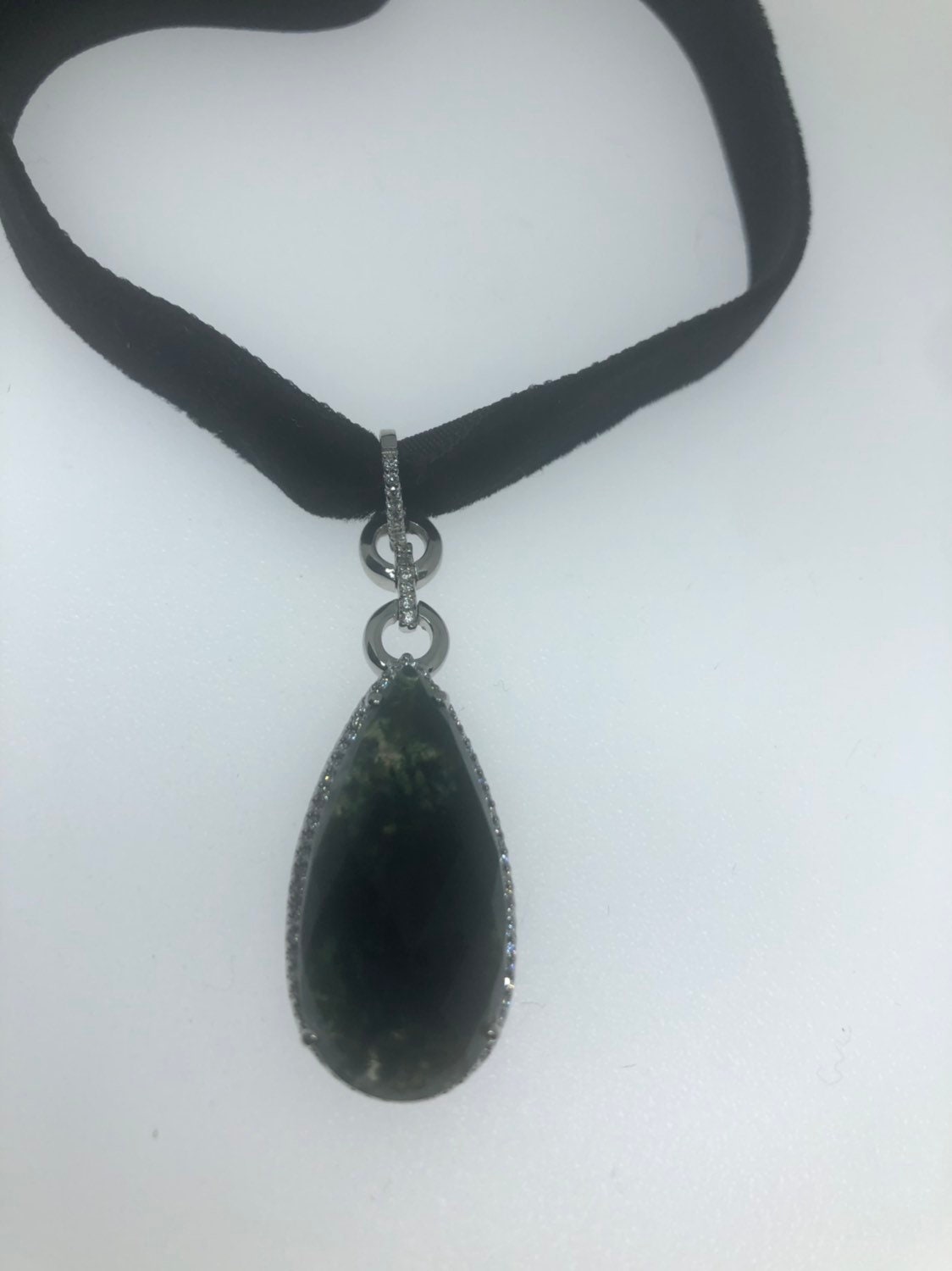 Delicate Jade pendant set in gorgeous swirls of 925 Sterling Silver surrounded by white sapphires