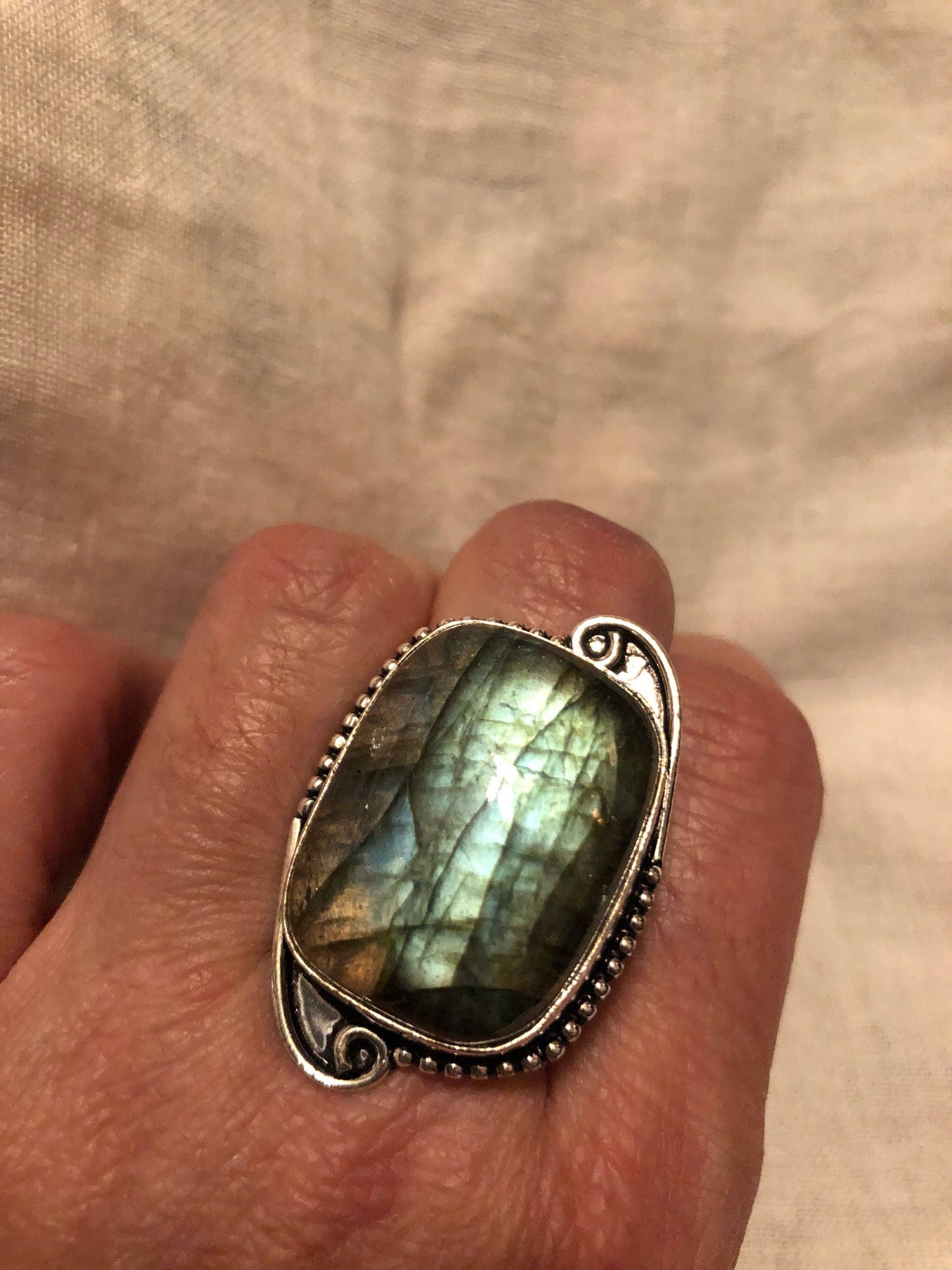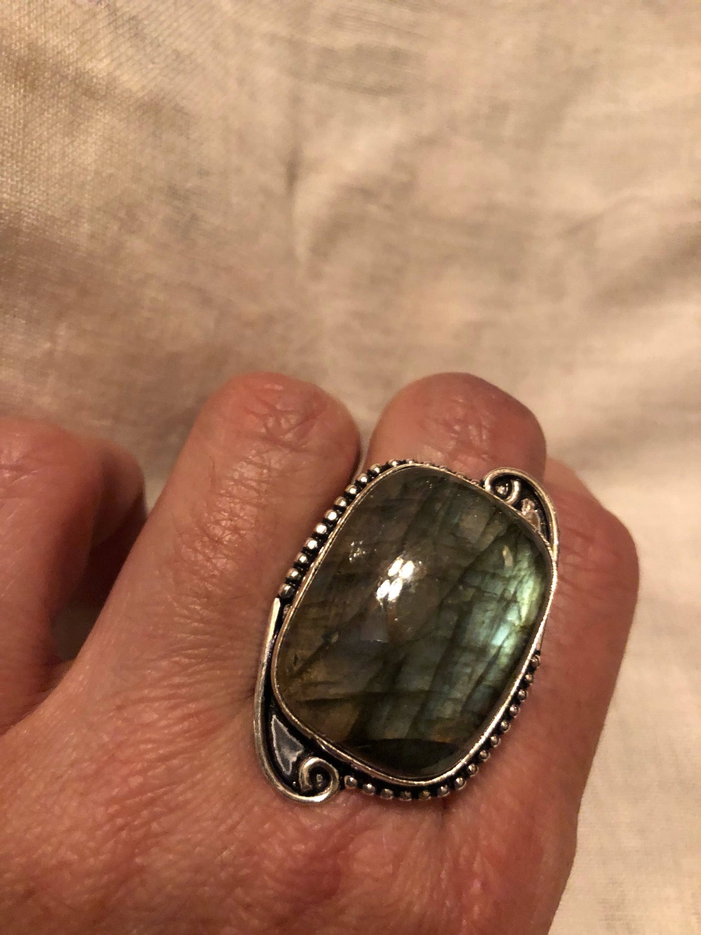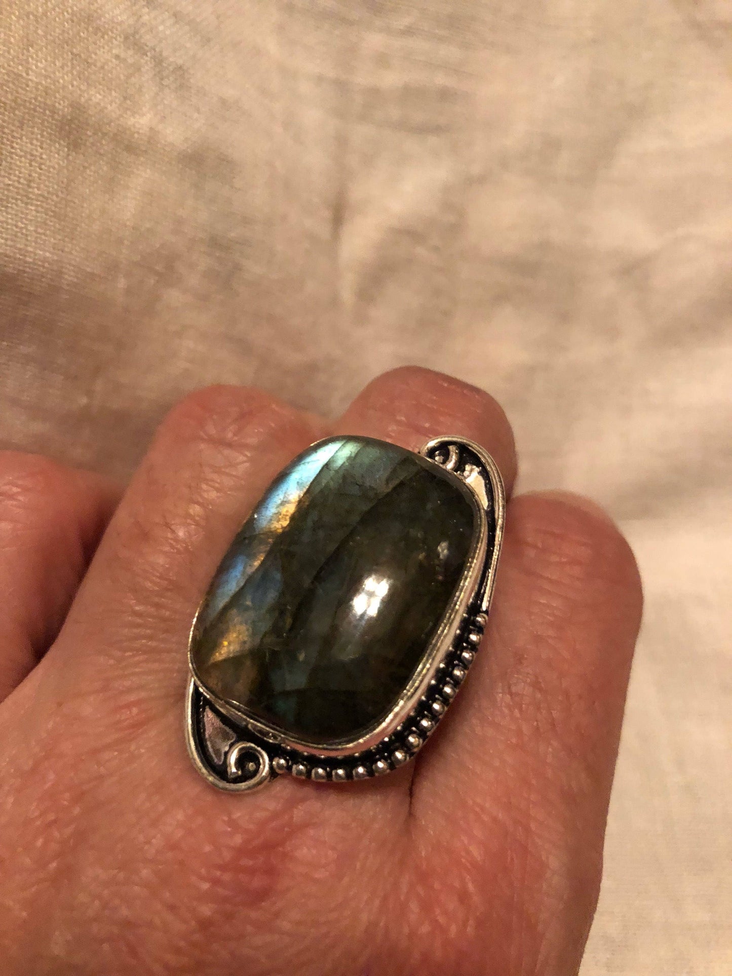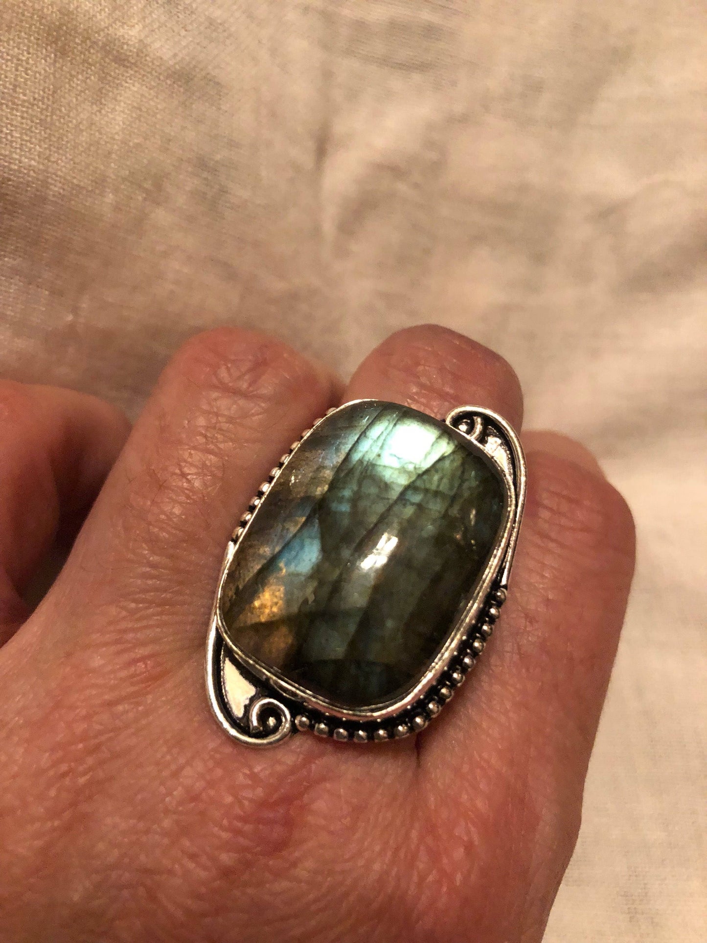 Vintage Large Blue Green Labradorite Stone Silver Ring