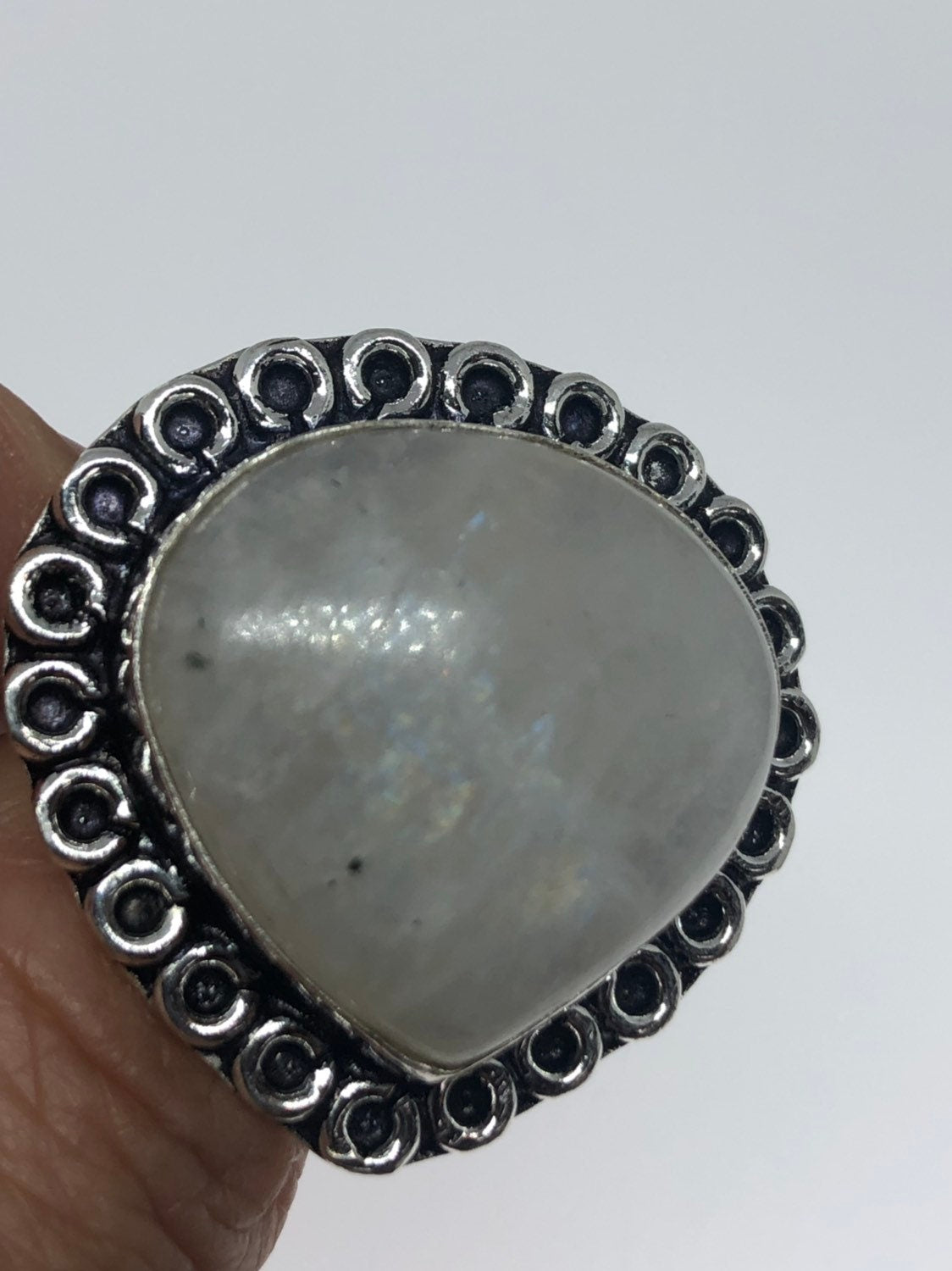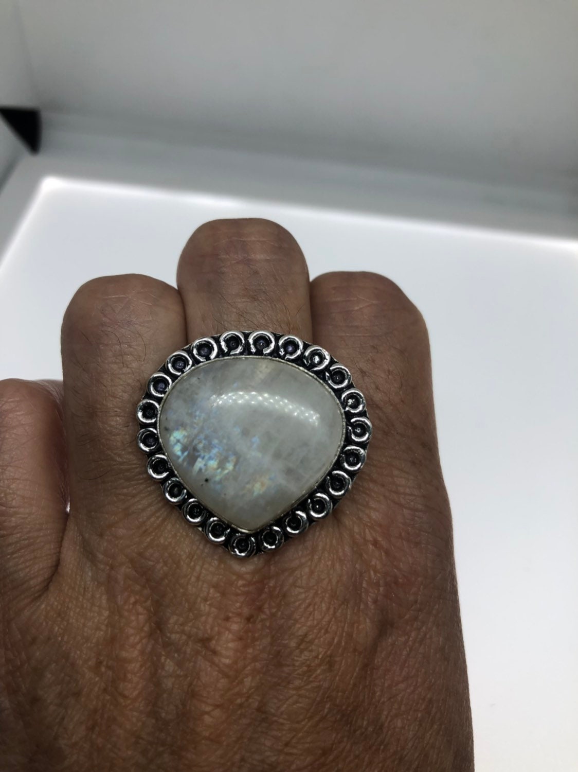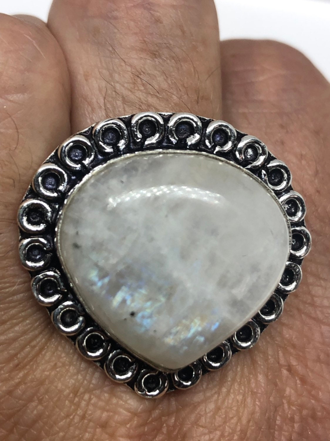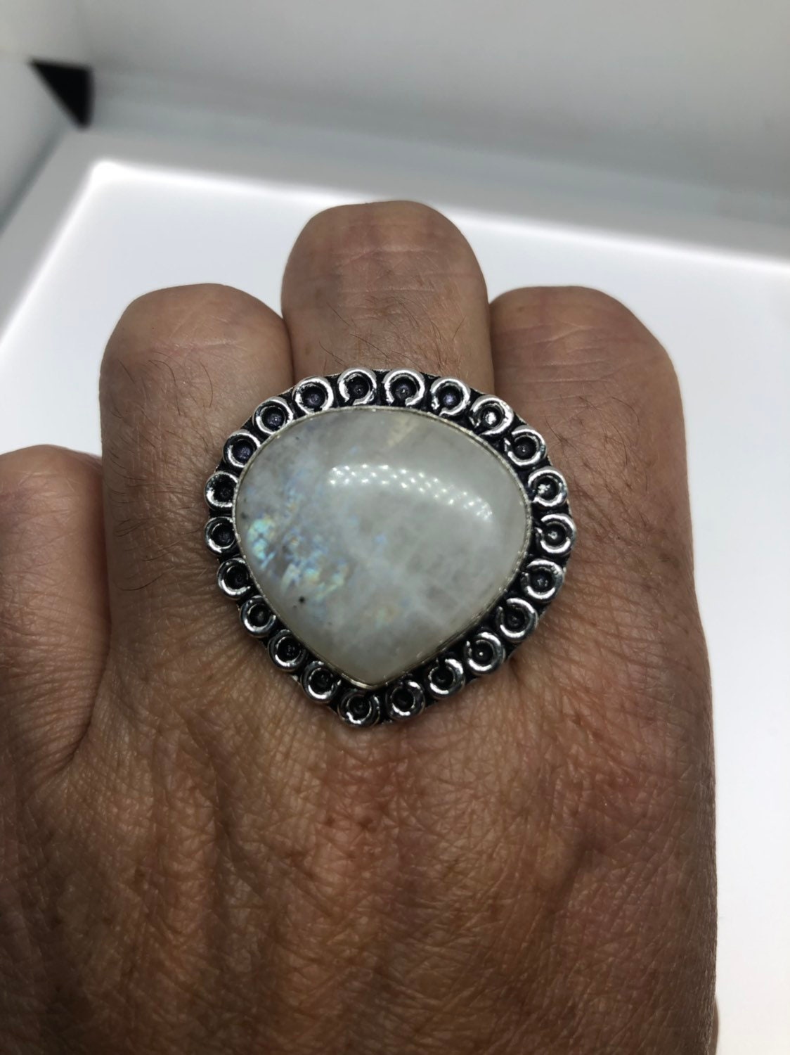 Vintage Large Blue White Rainbow Moonstone Stone Silver Ring