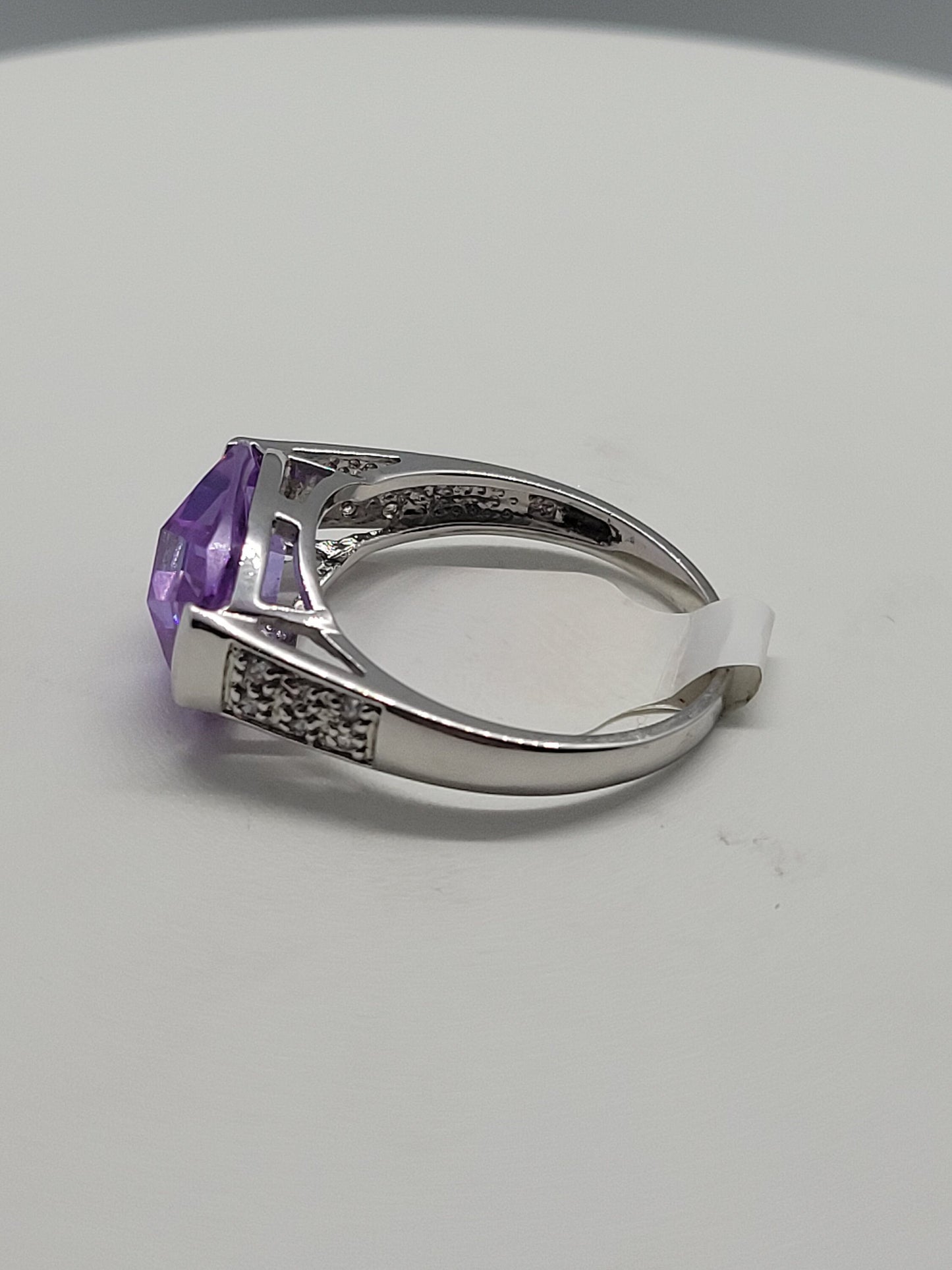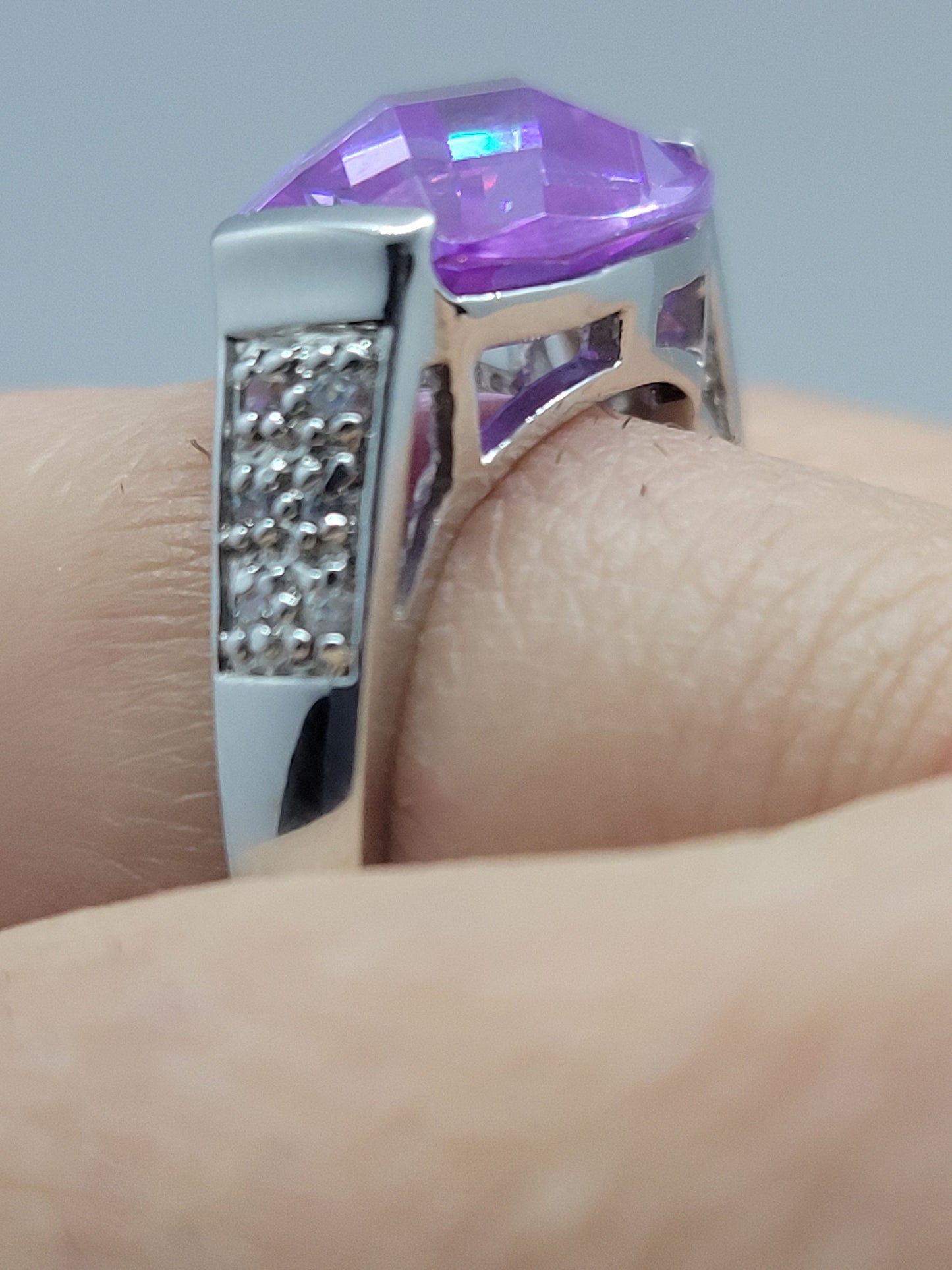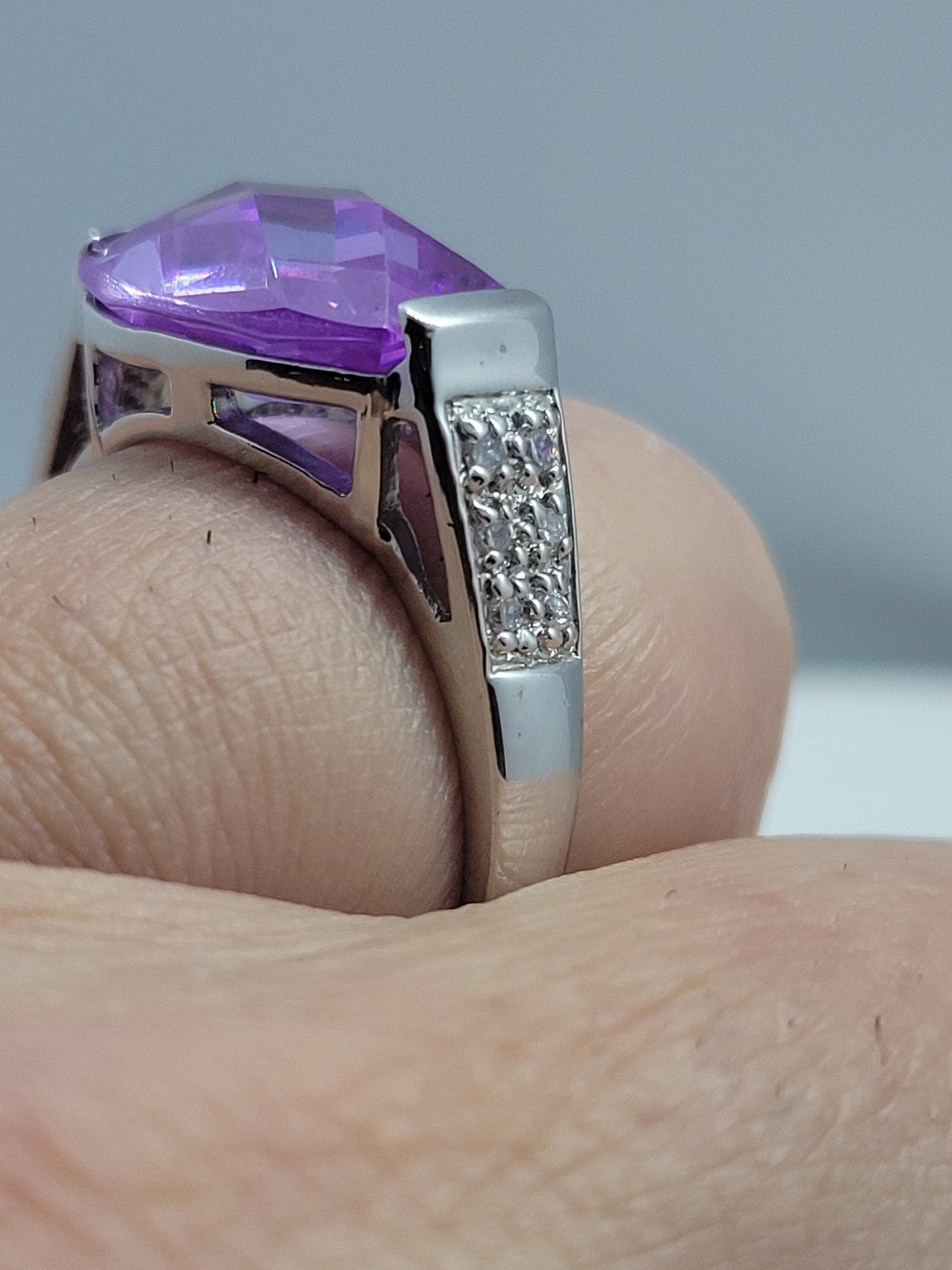 This is a vintage lavender cubic zirconia with white sapphire ring set in 925 sterling silver, with the lavender CZ fun-sized, measuring 9 mm x 12 mm.