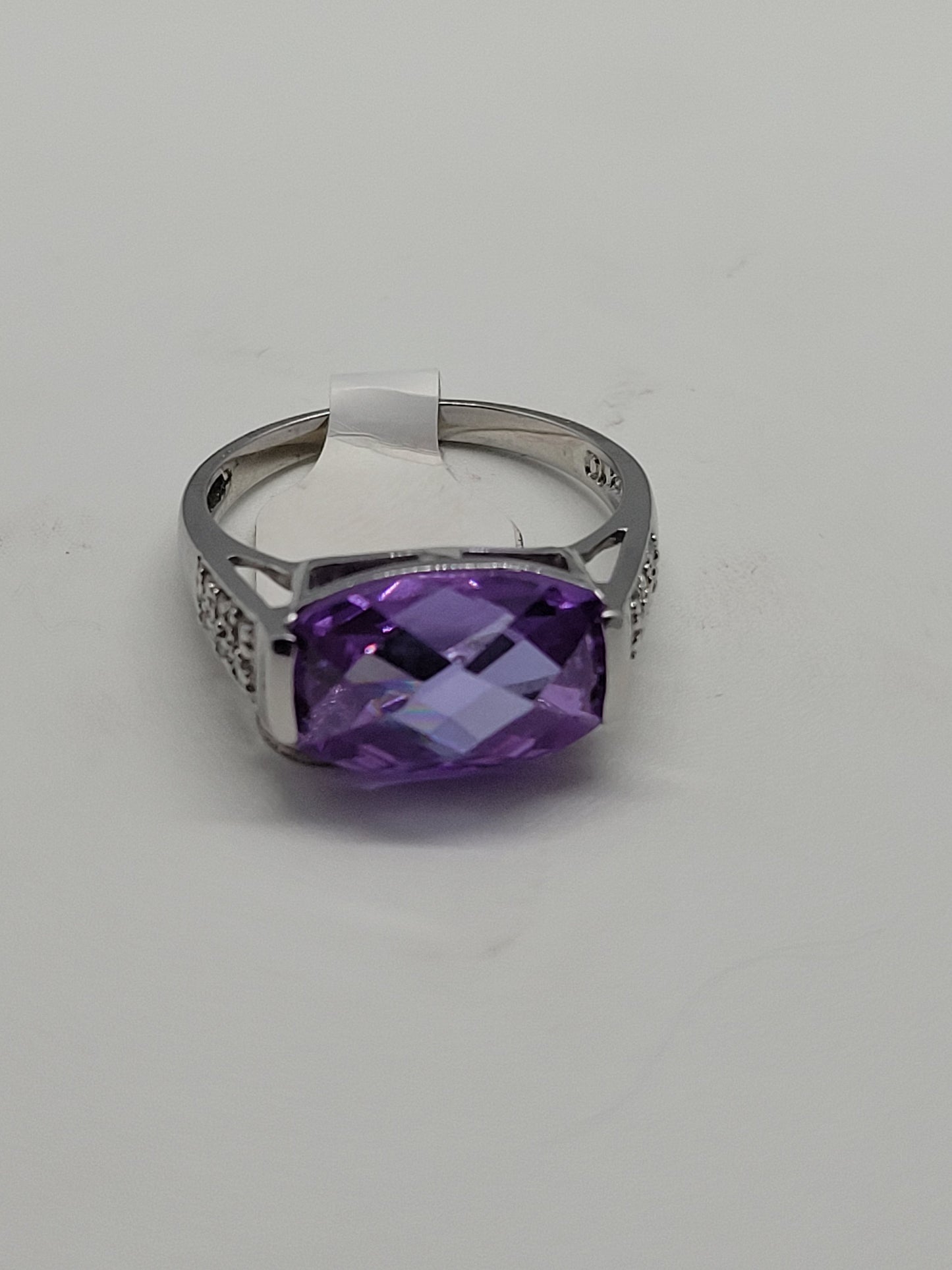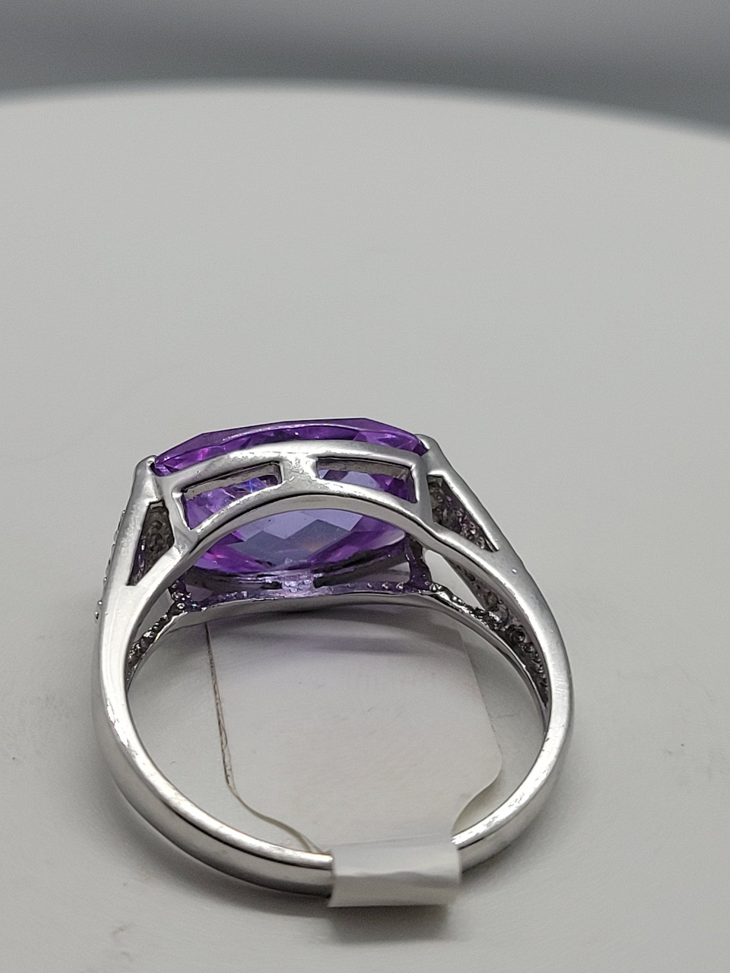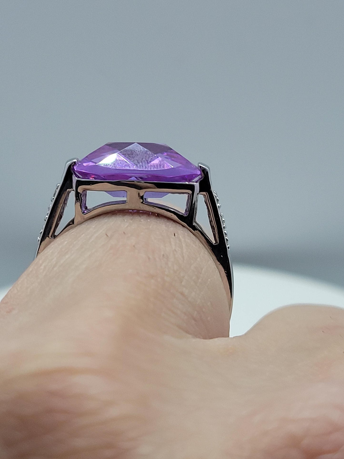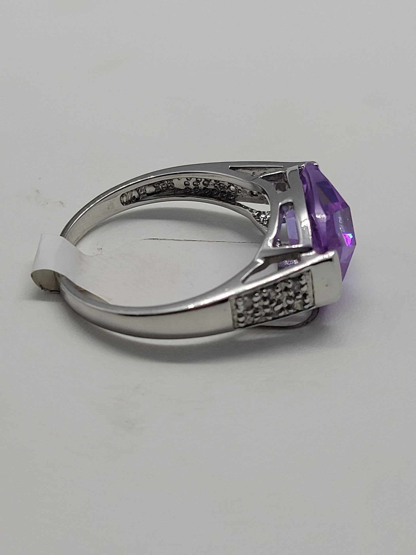 This is a vintage lavender cubic zirconia with white sapphire ring set in 925 sterling silver, with the lavender CZ fun-sized, measuring 9 mm x 12 mm.