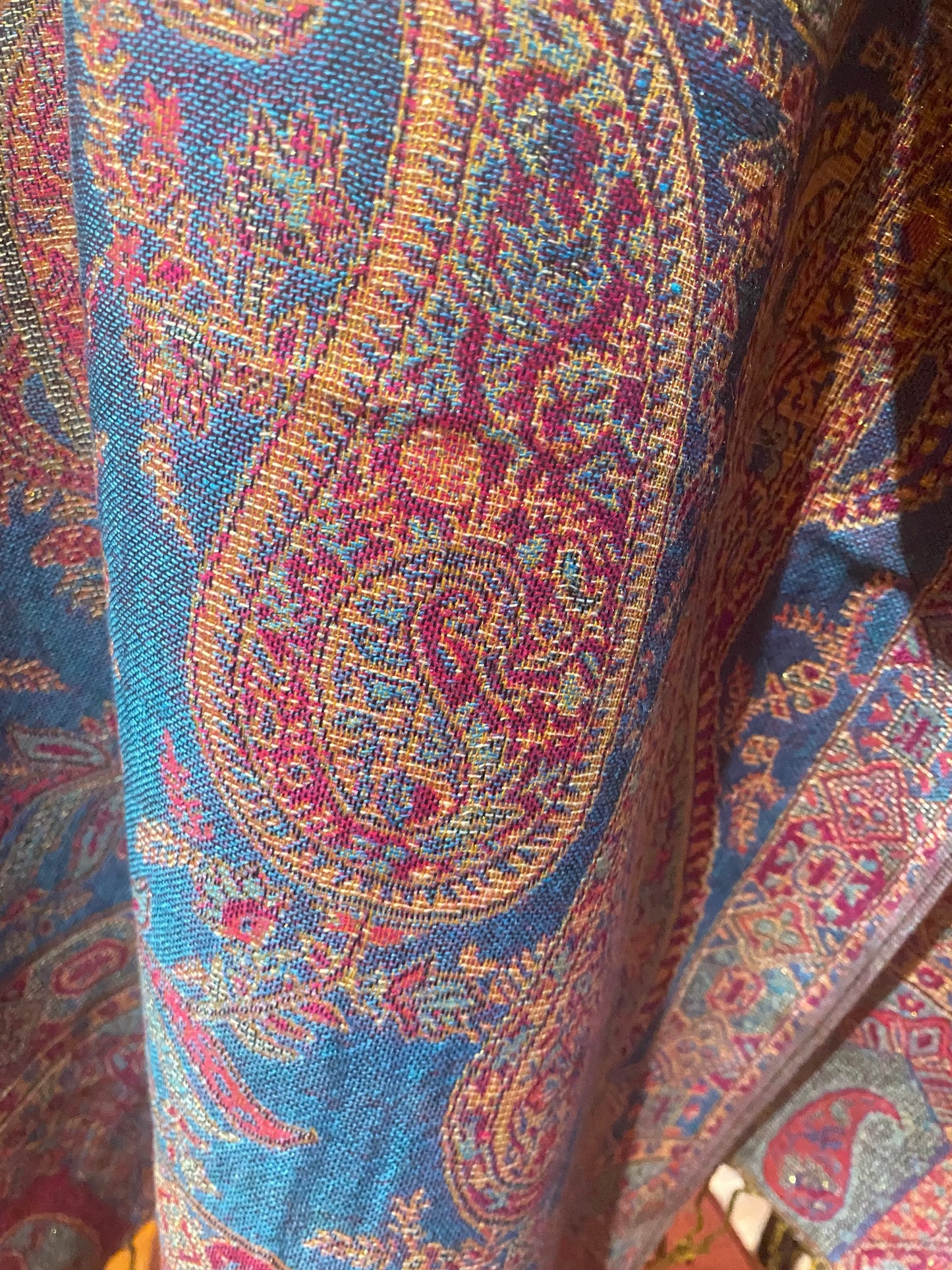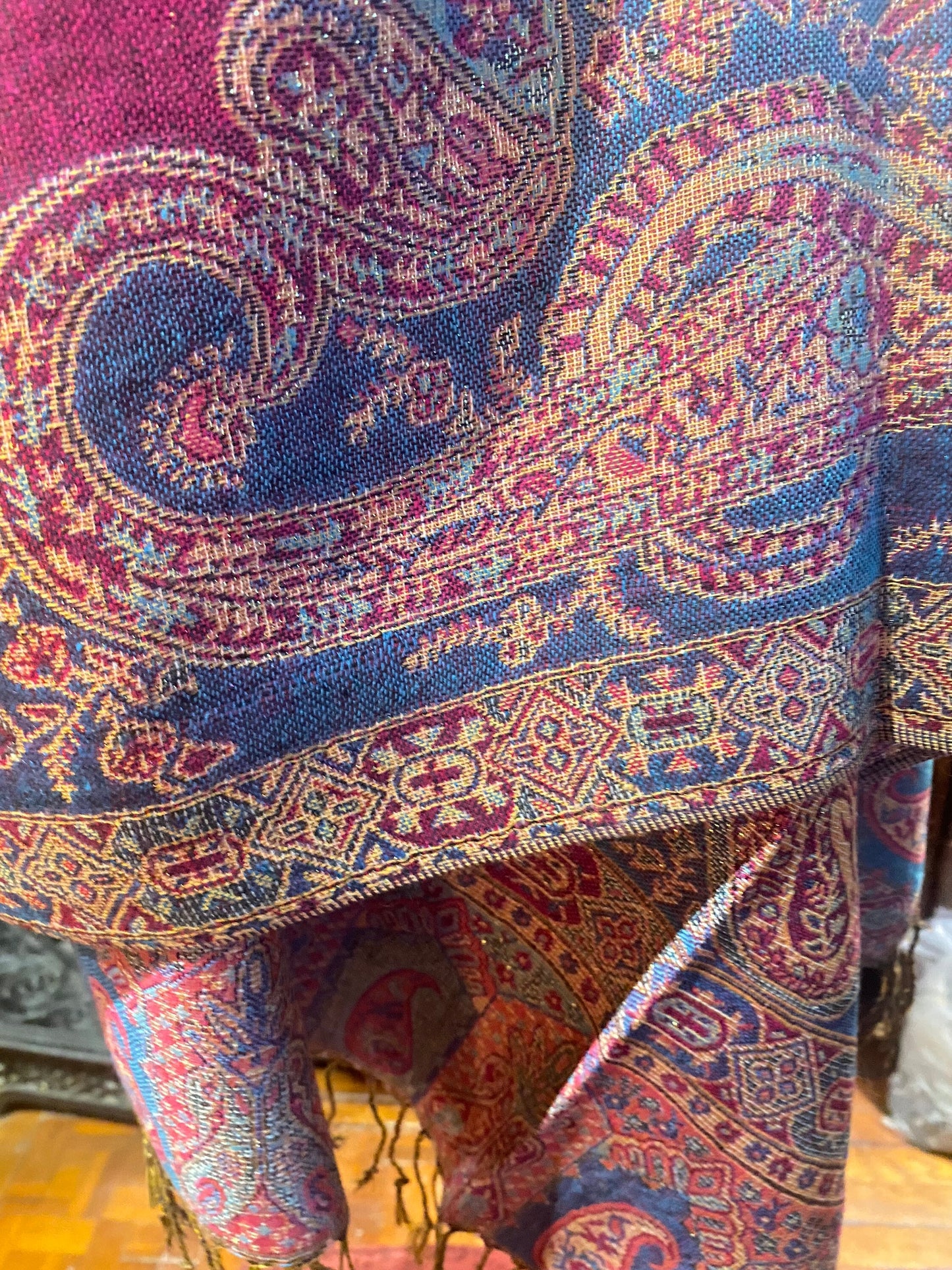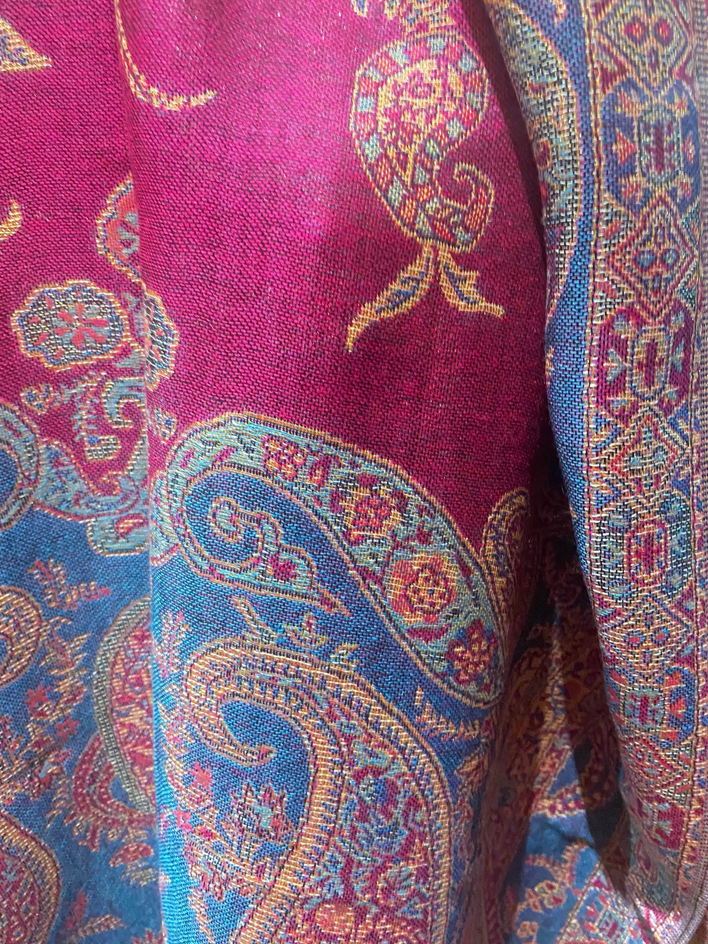 Vintage Pink Blue Gold Paisley Brocade Pashmina Scarf Wrap