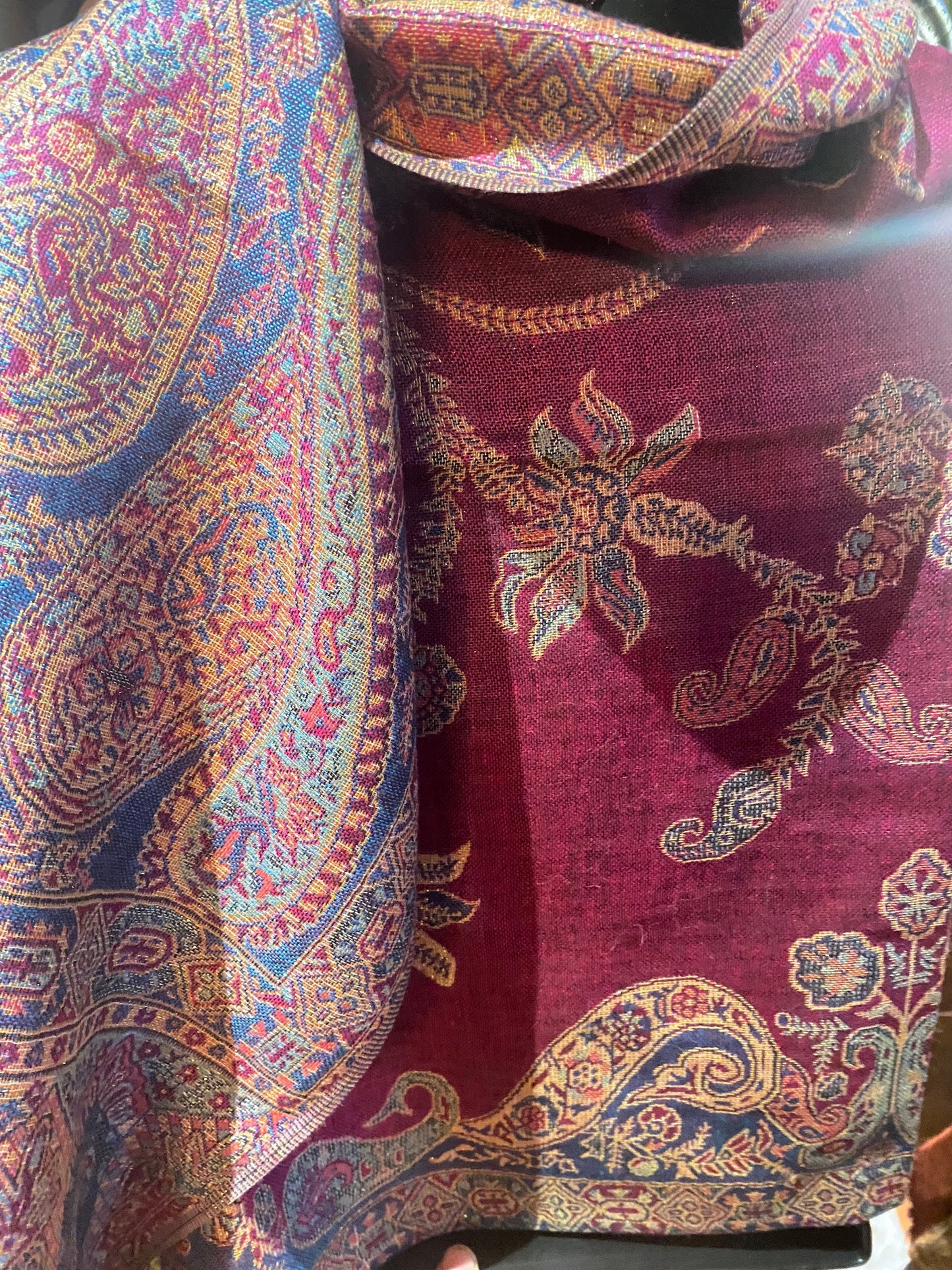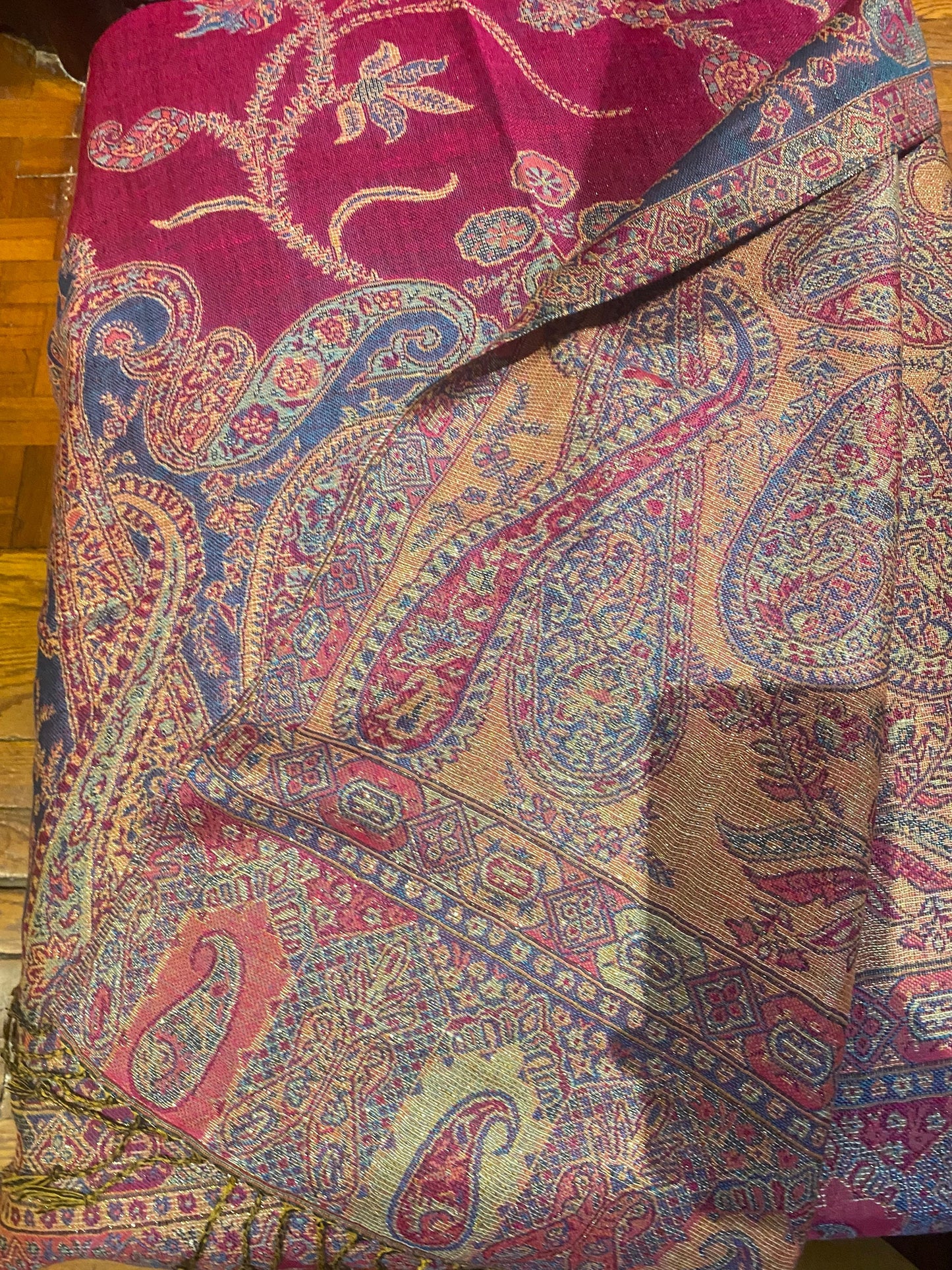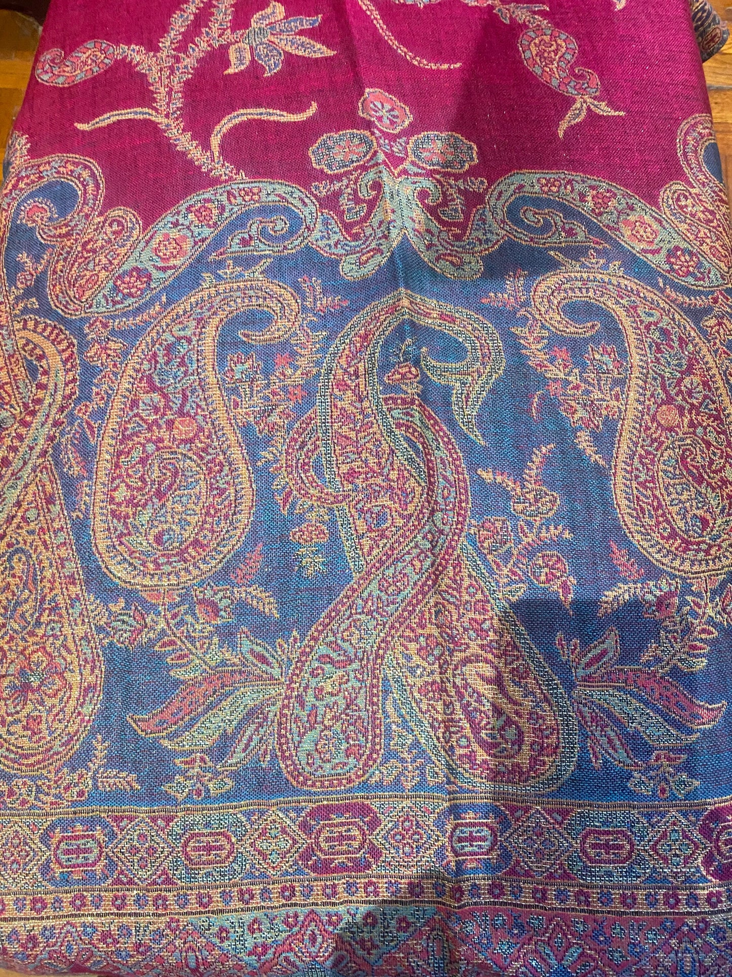 Vintage Pink Blue Gold Paisley Brocade Pashmina Scarf Wrap