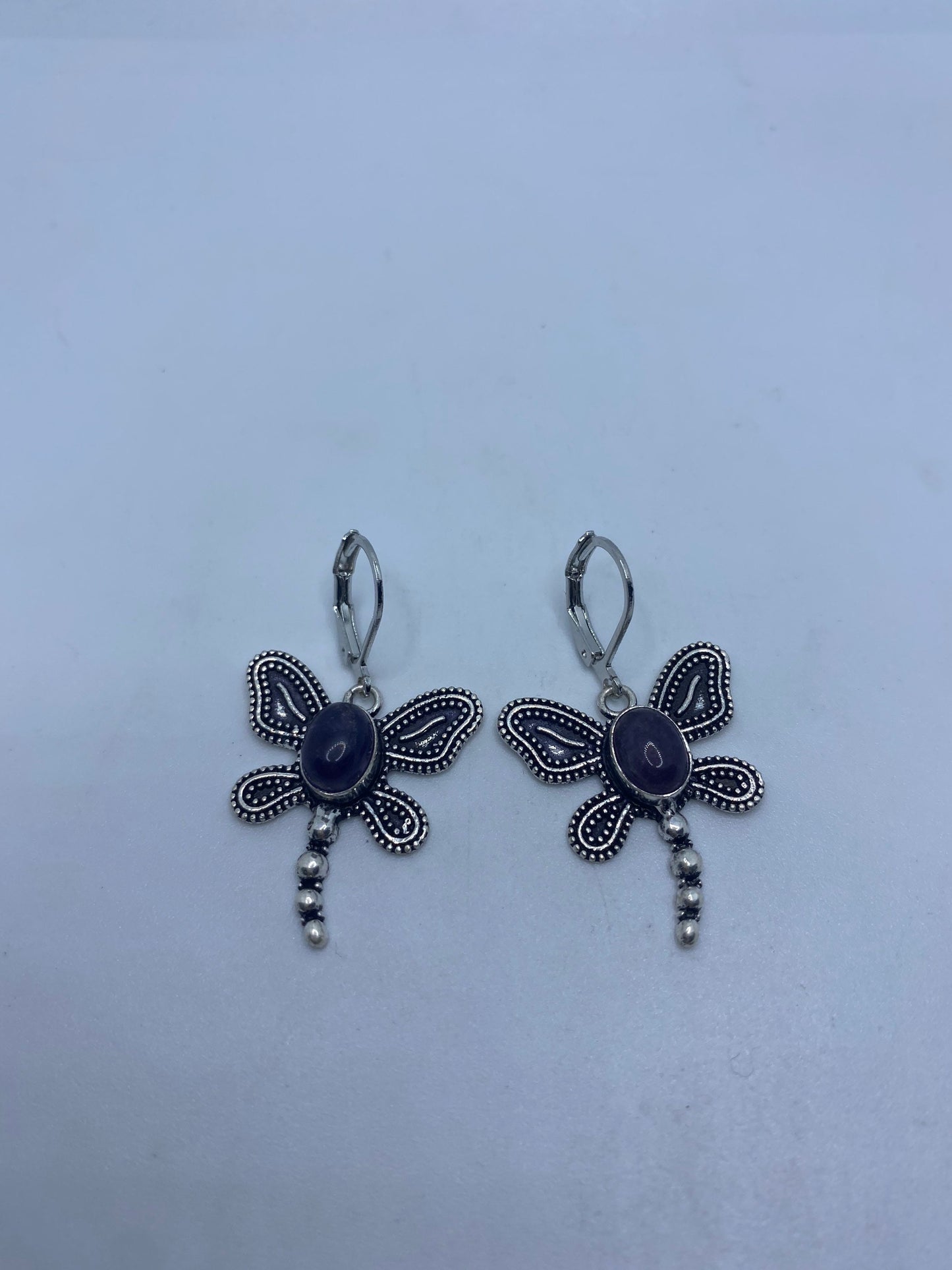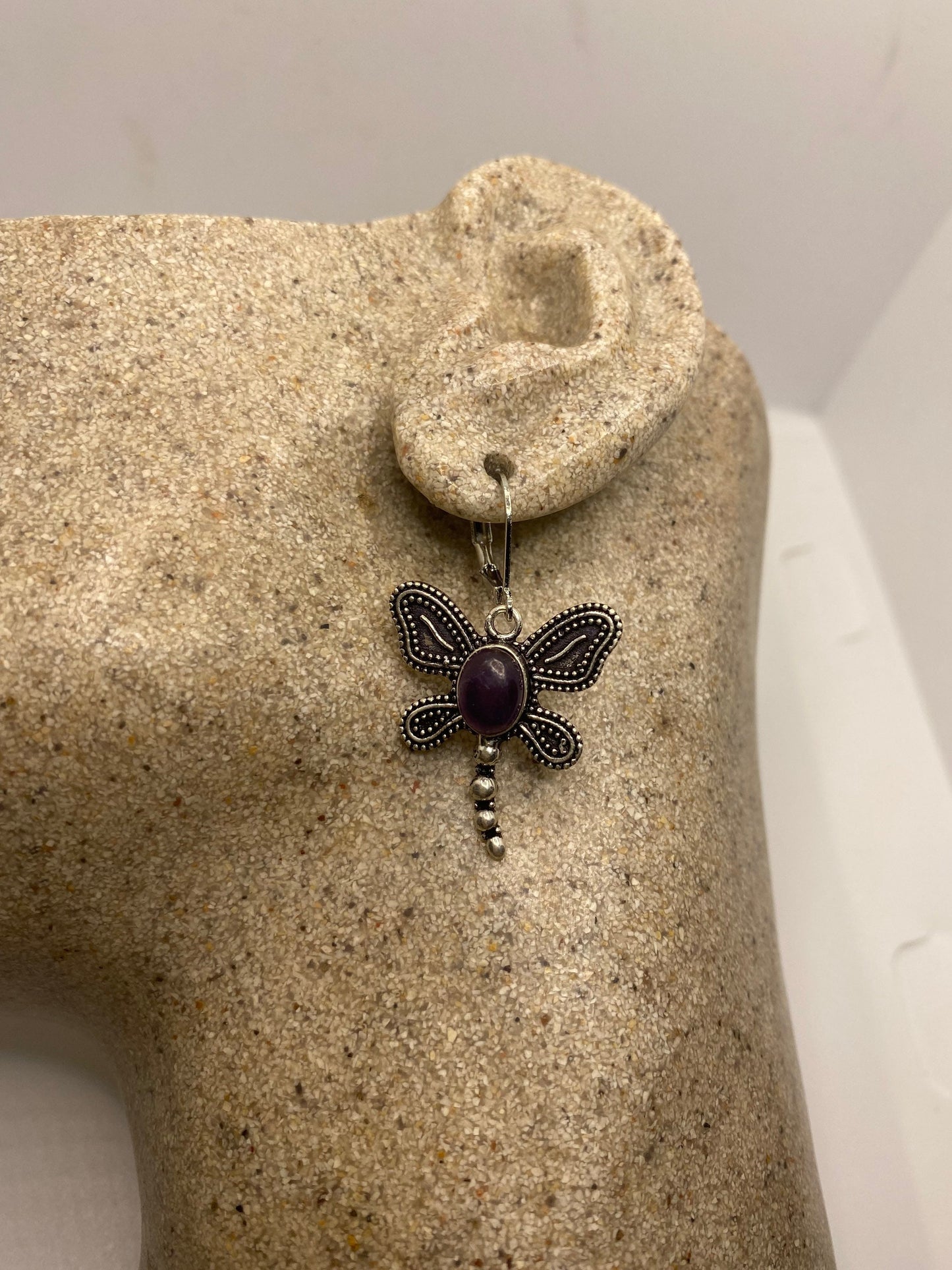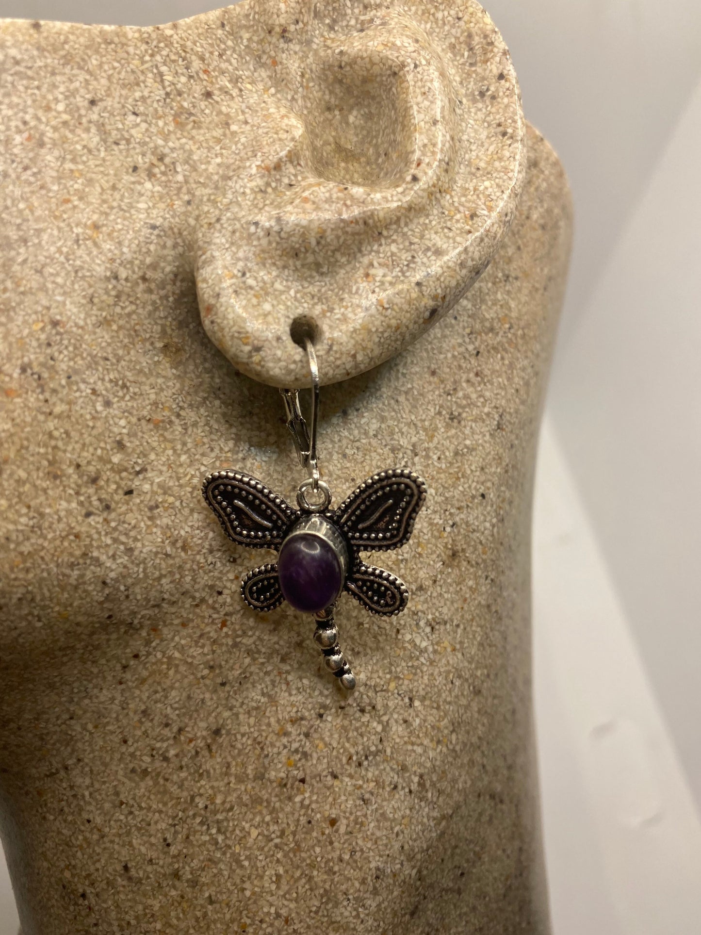 Vintage Purple Amethyst dragonfly Earrings 925 Sterling Silver Leverback Chandelier