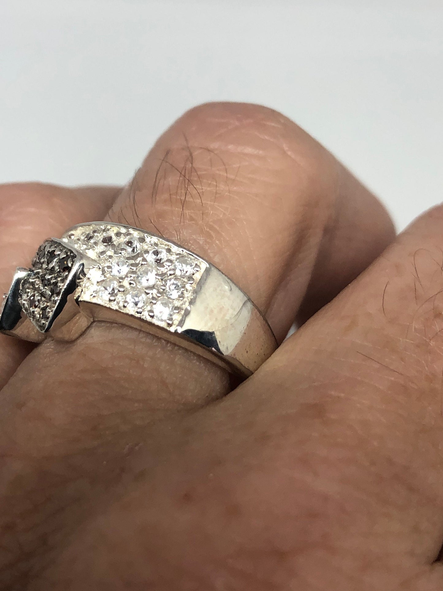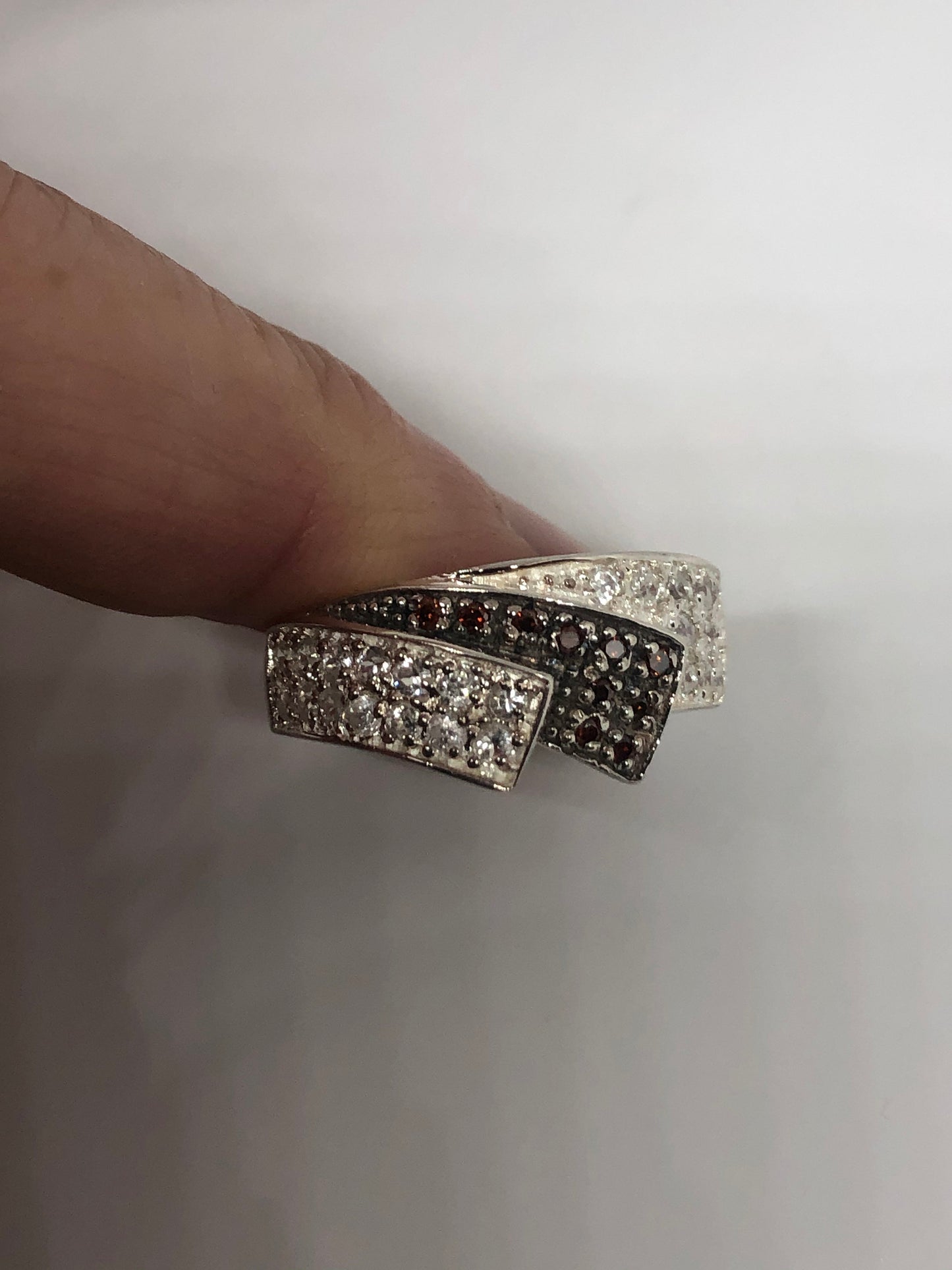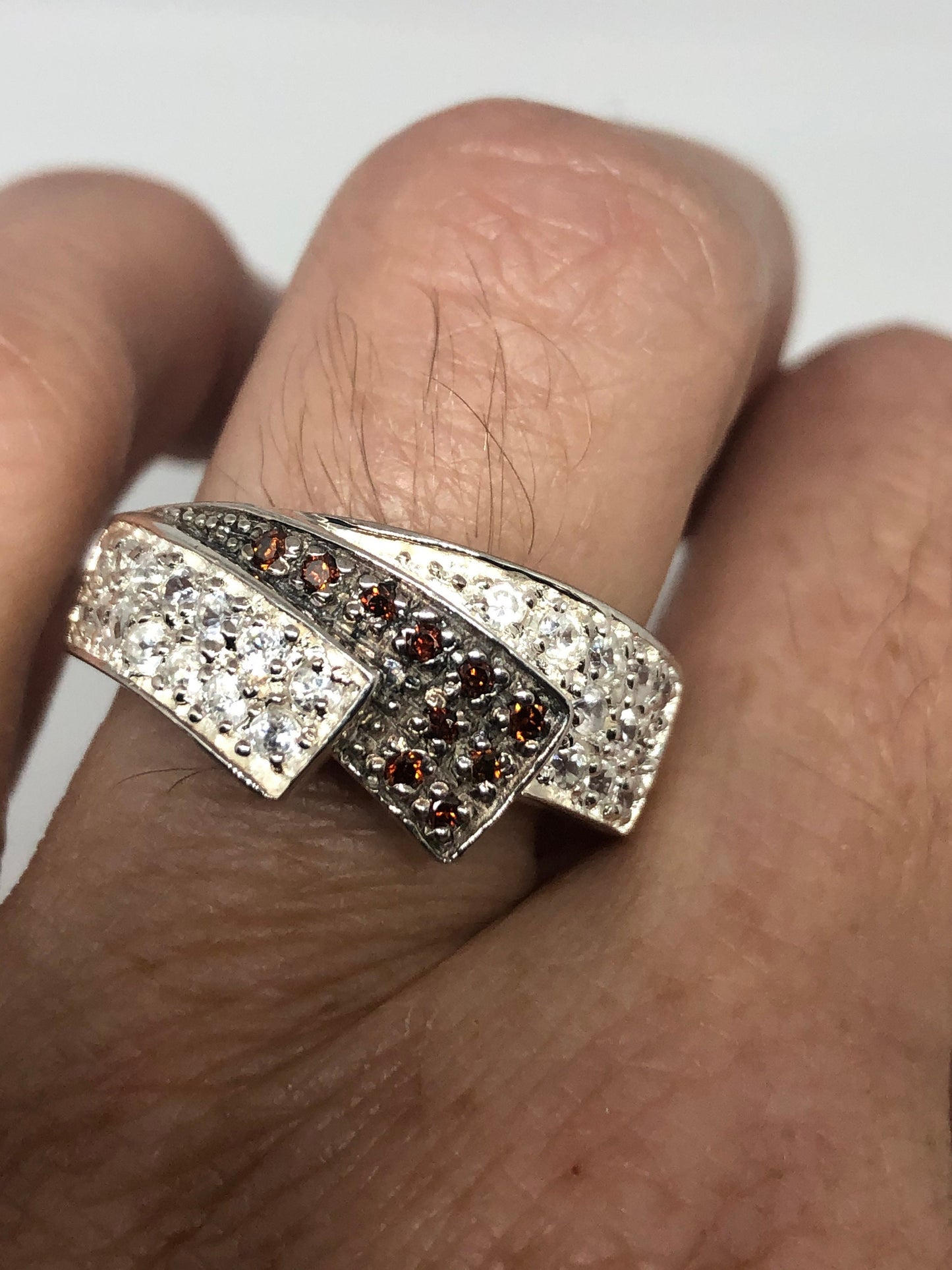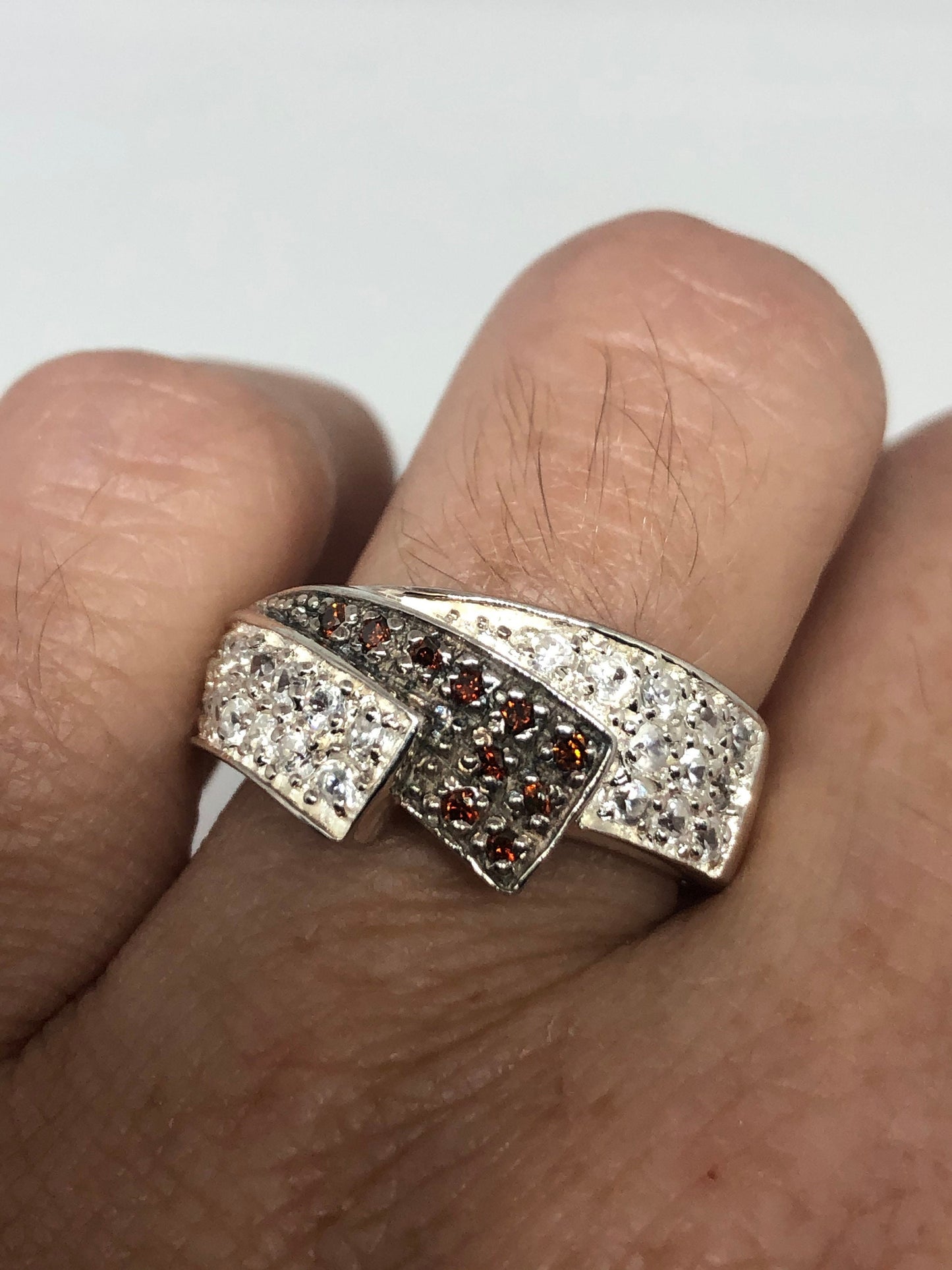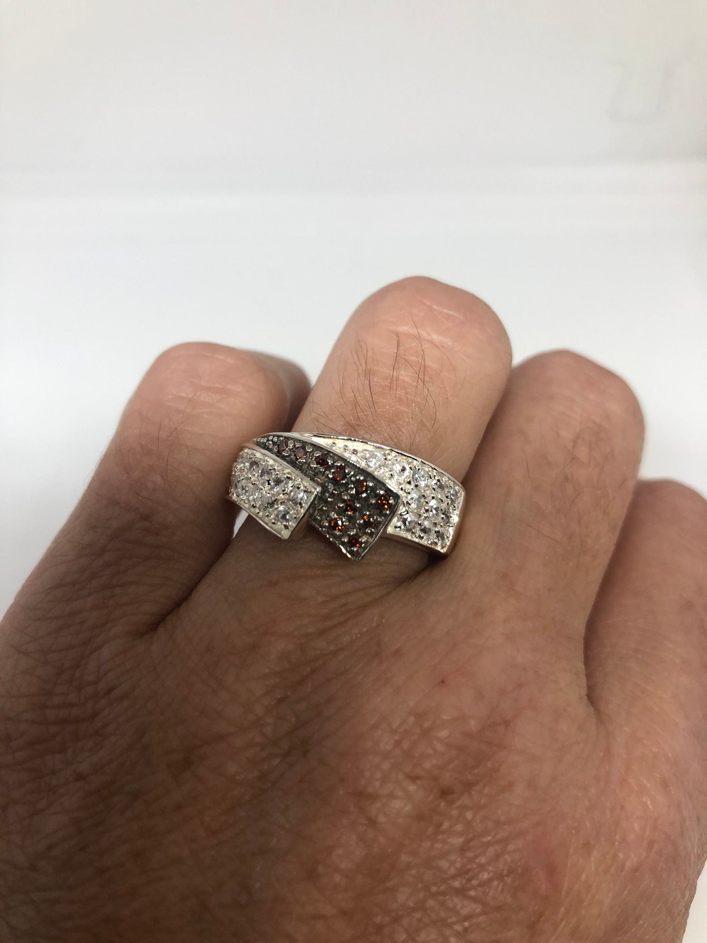 Vintage Red Bohemian Garnet Ring White Sapphire 925 Sterling Silver Cocktail Statement