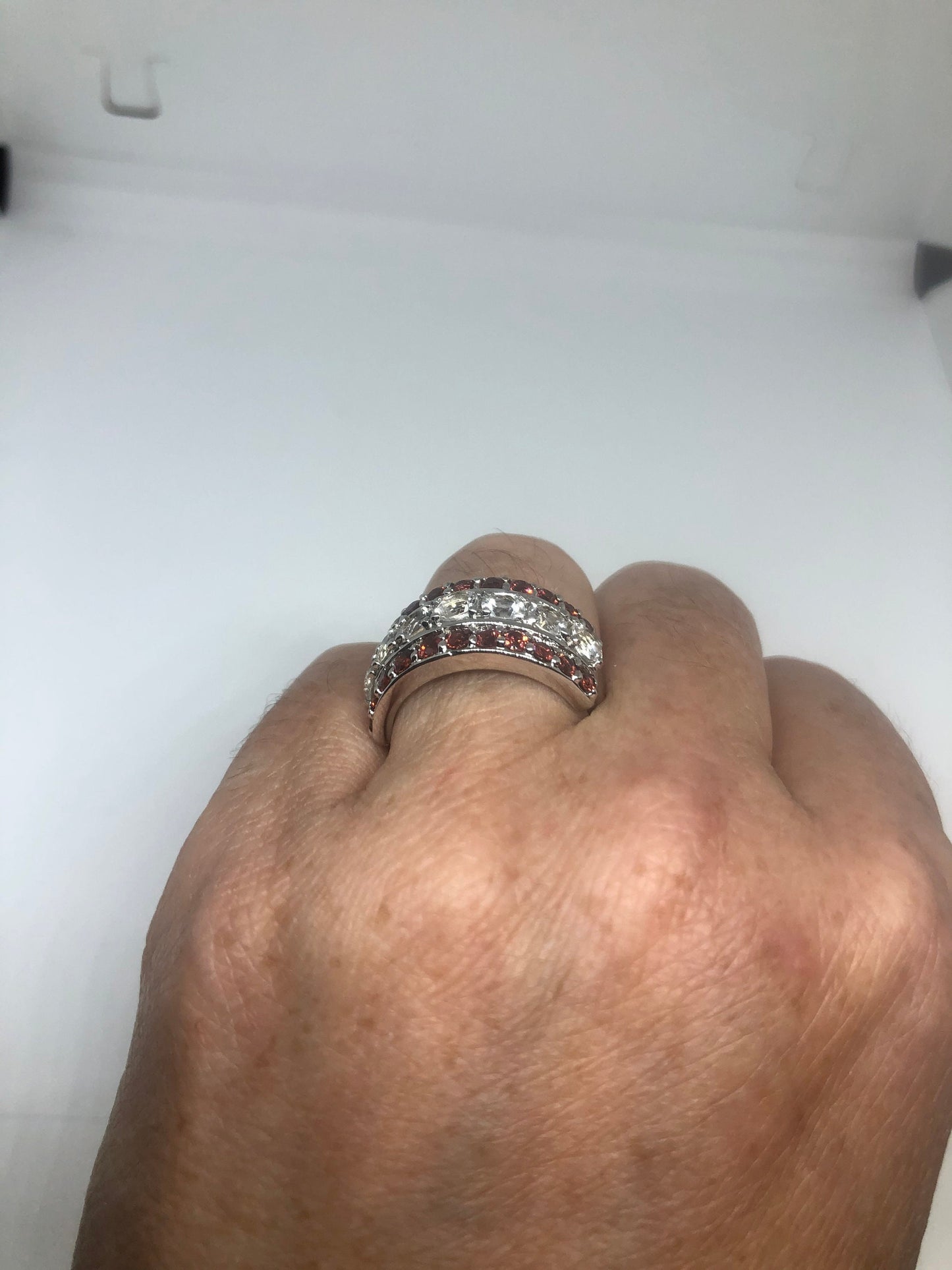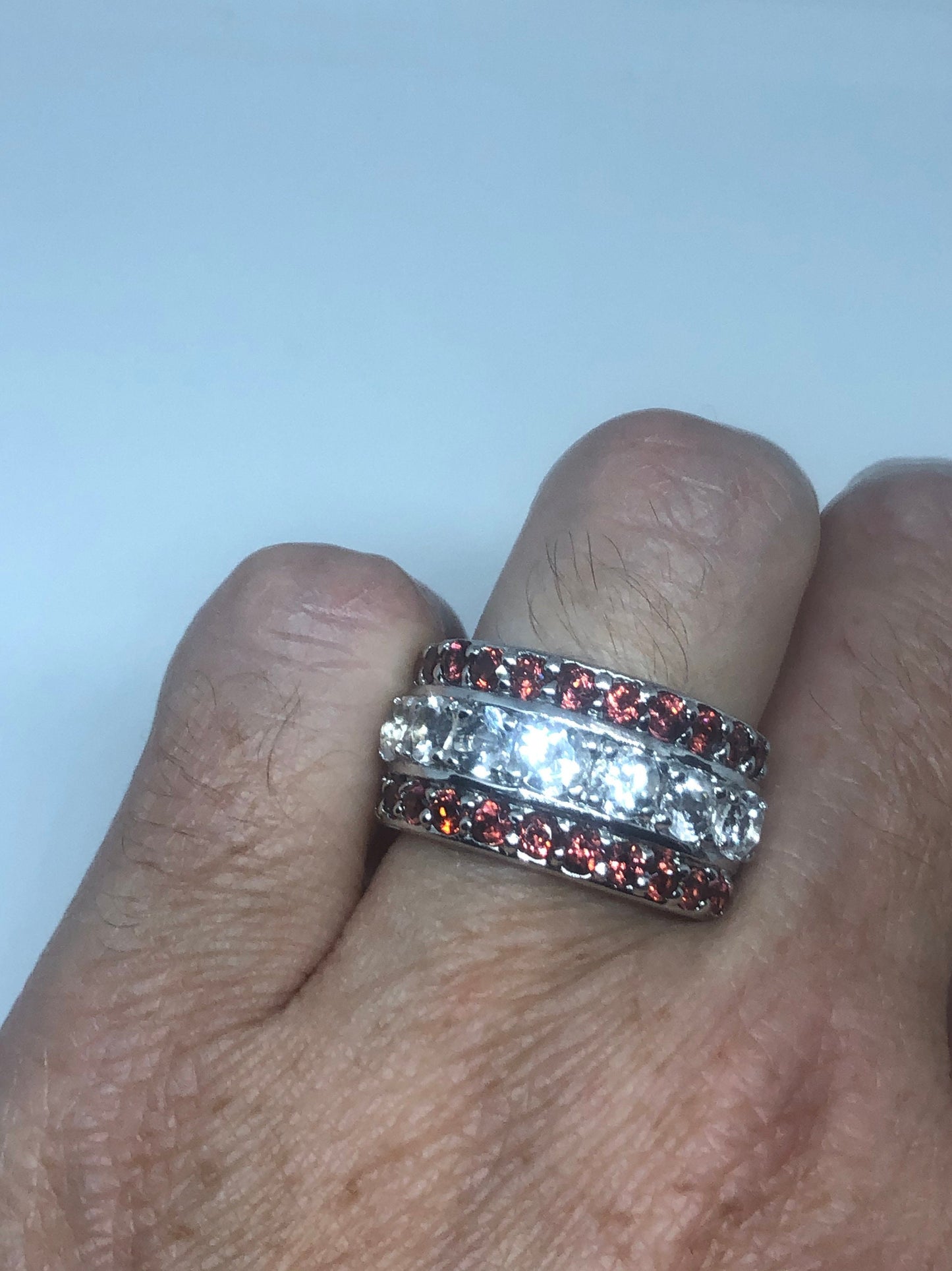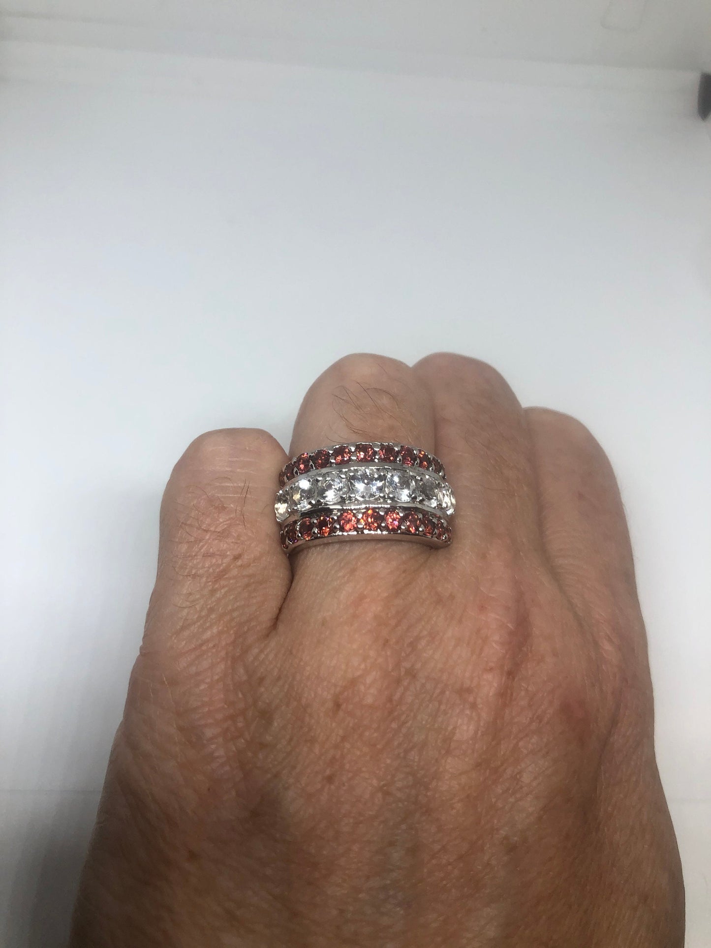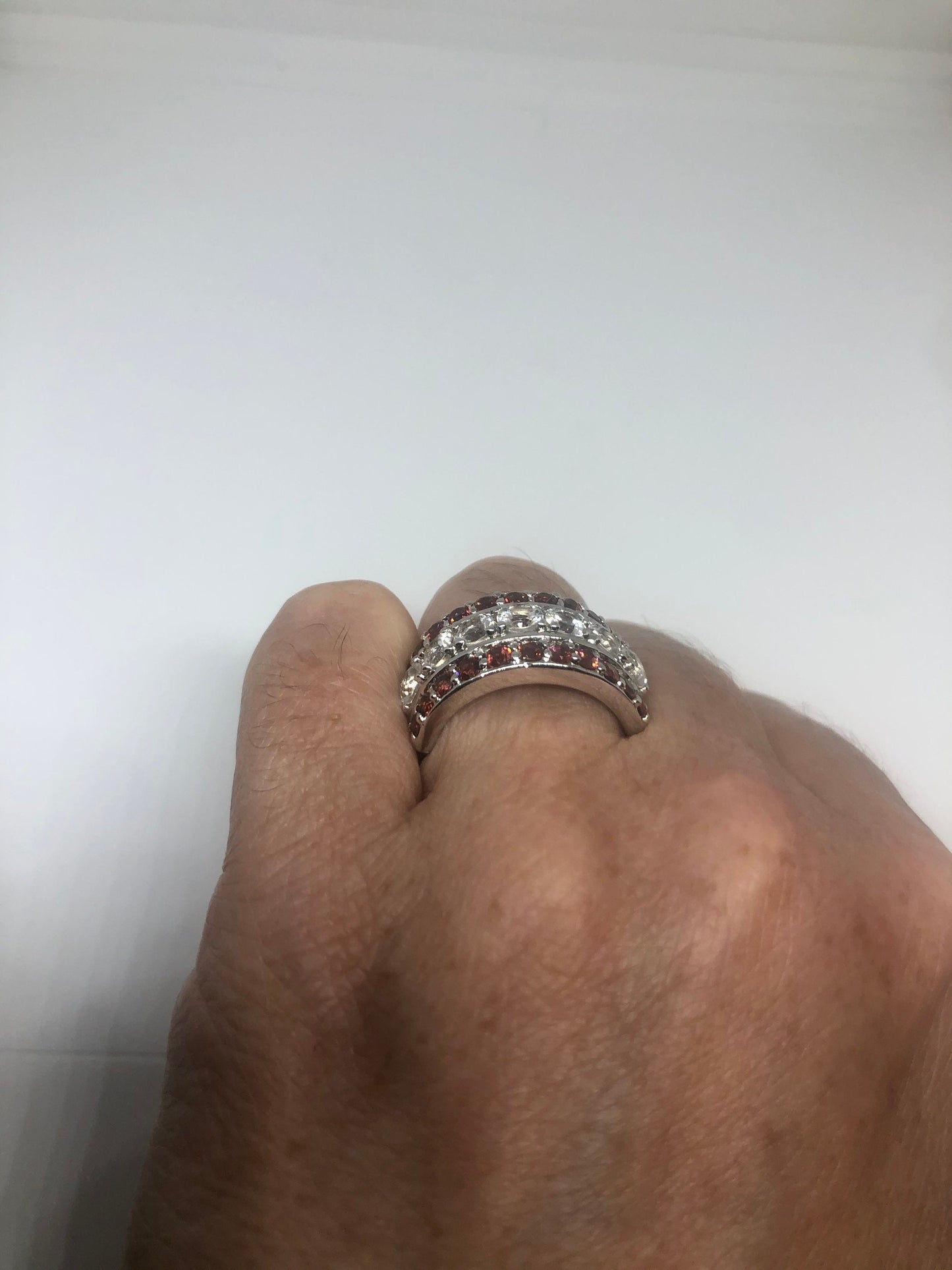 Vintage Red Bohemian Garnet Ring White Sapphire 925 Sterling Silver Cocktail Statement