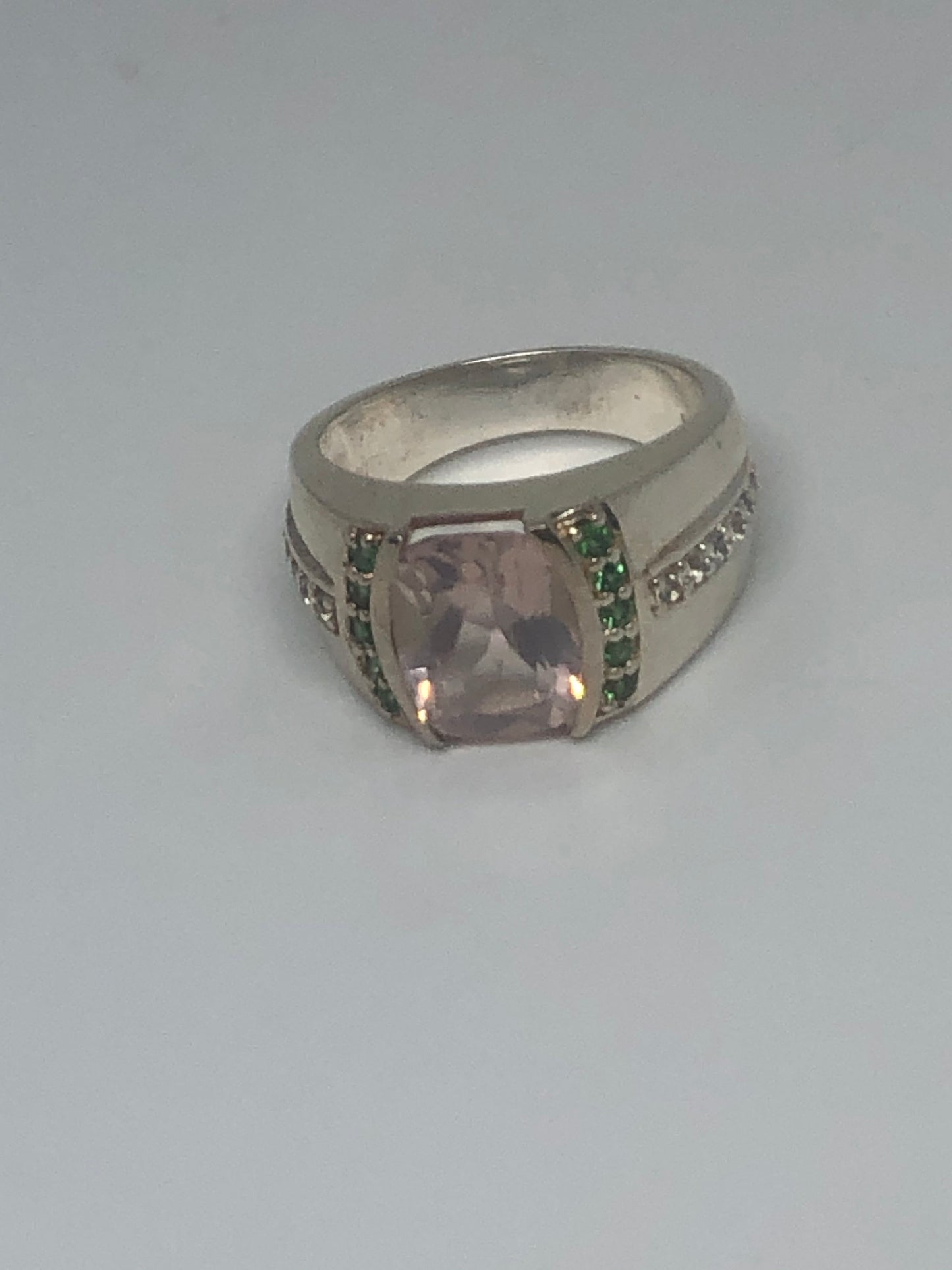 stone of Rose Quartz set with chrome diopside and white sapphire.