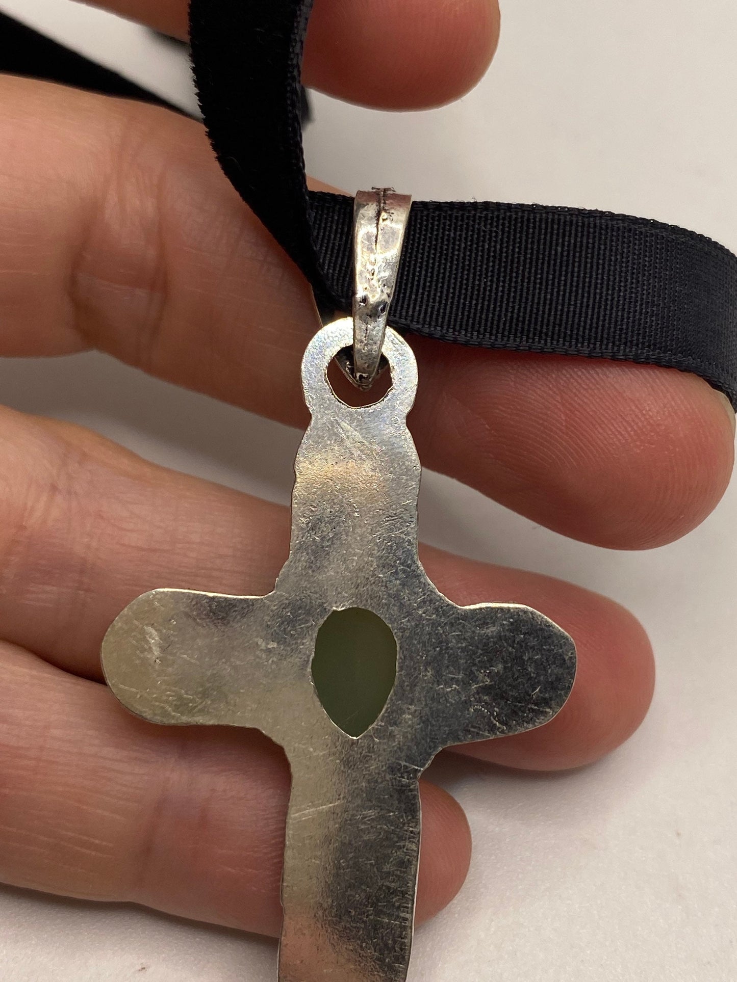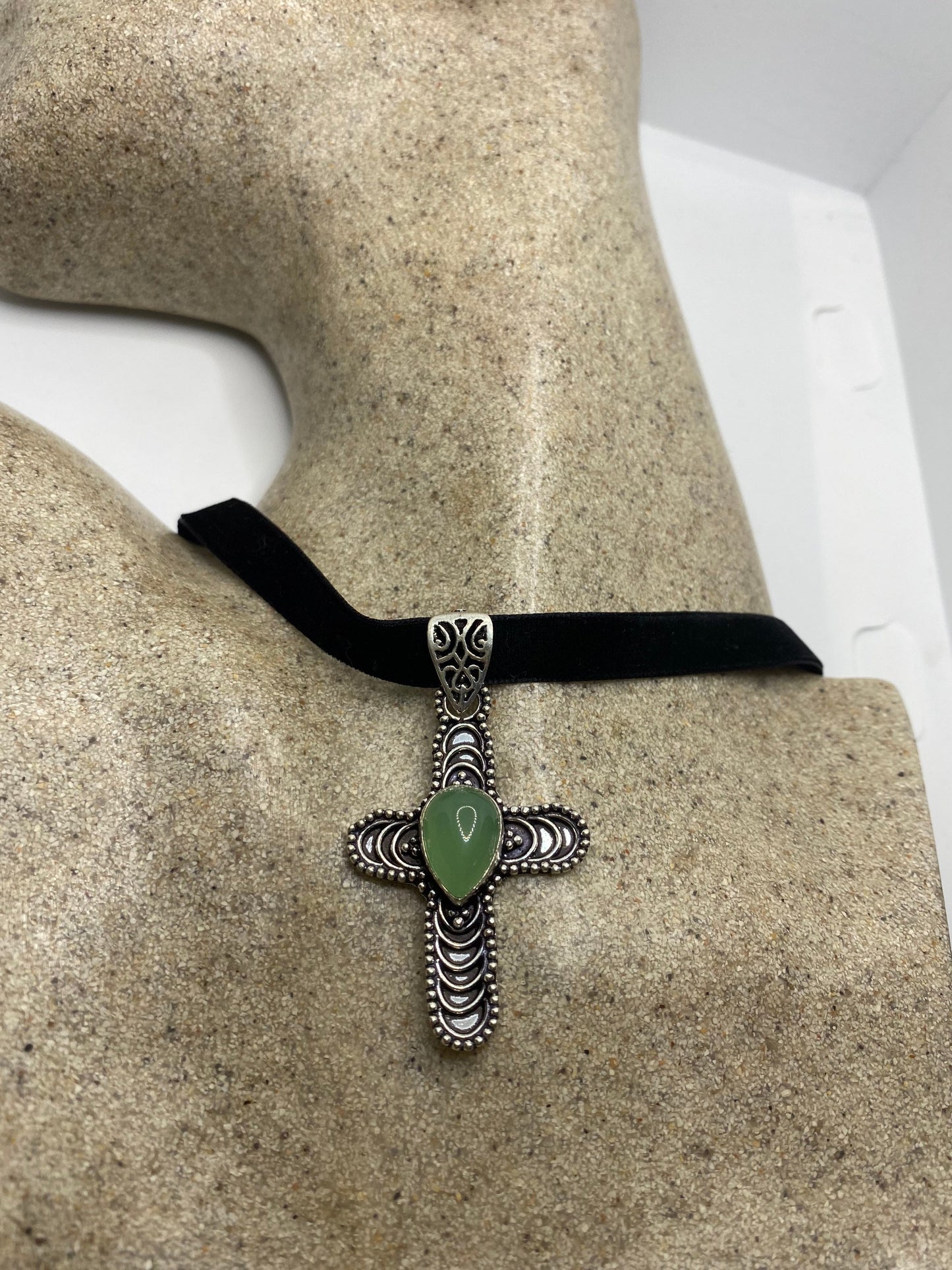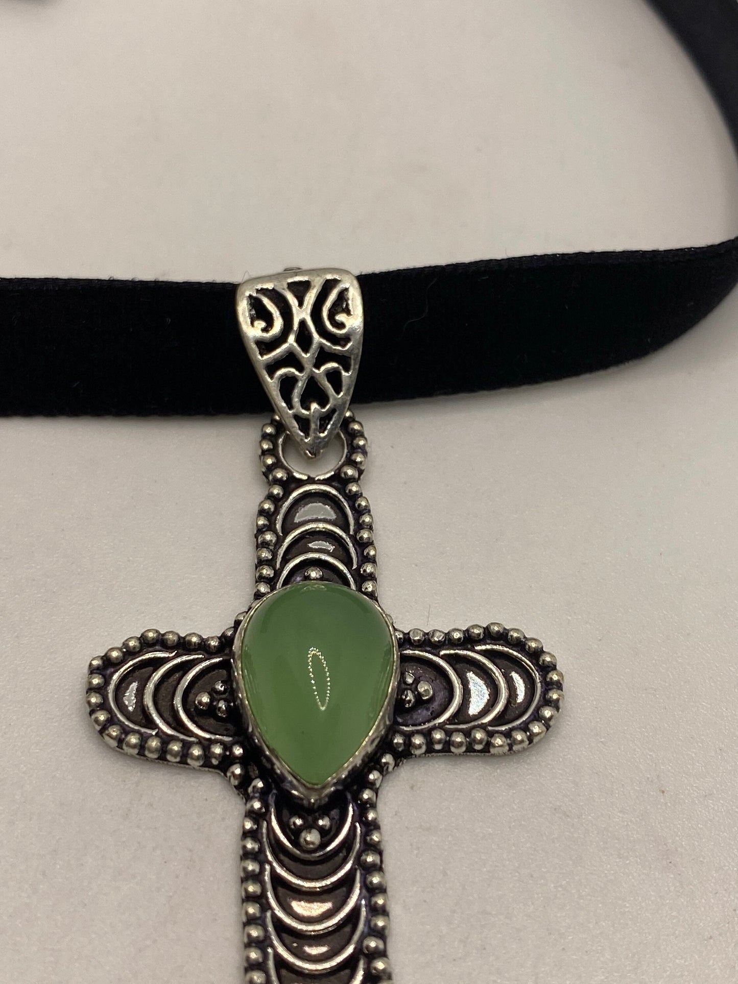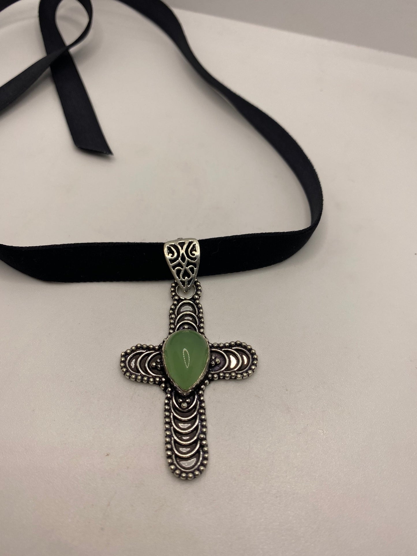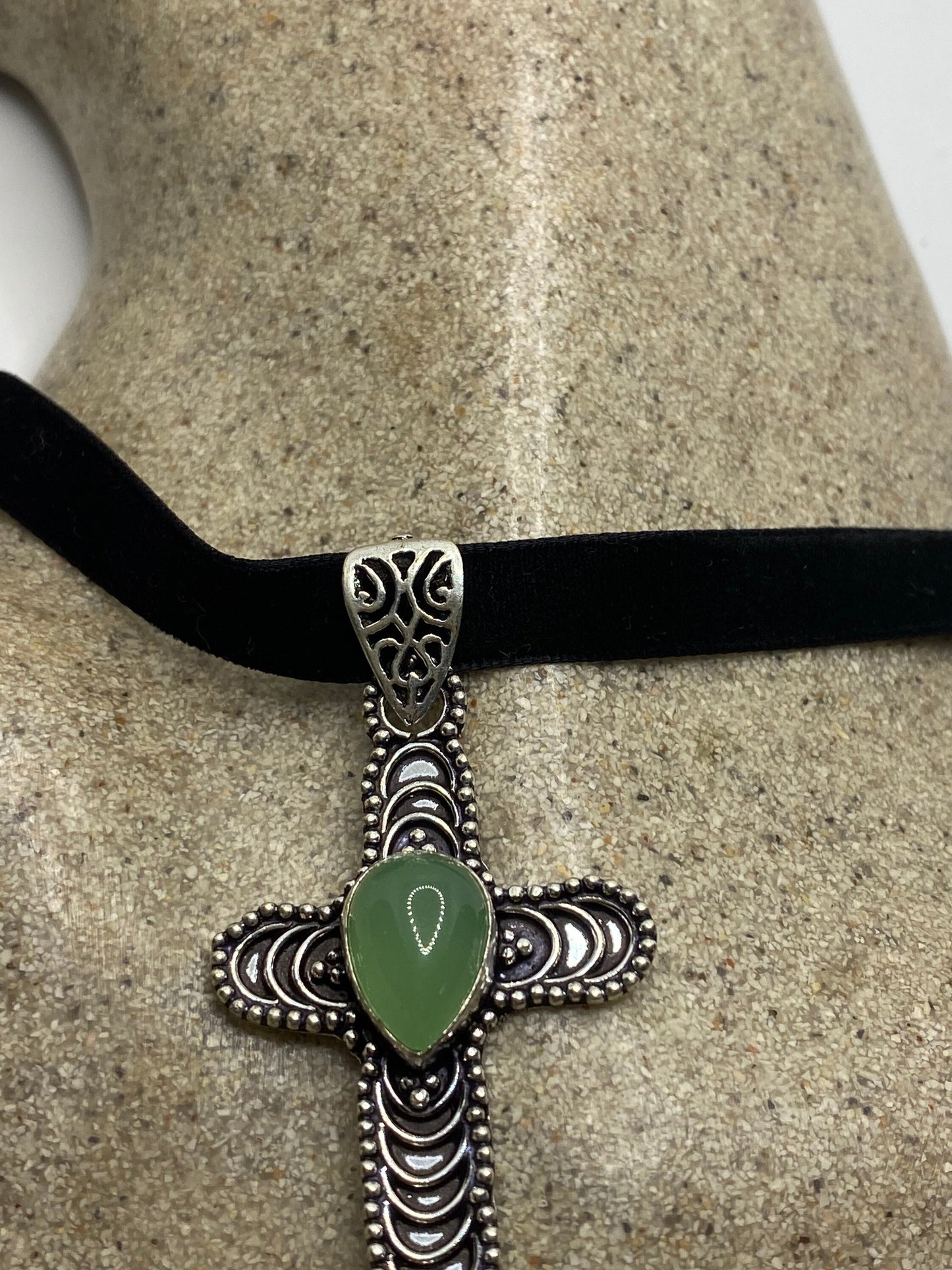 Vintage Silver Green Aventurine Cross Choker Black Velvet Necklace.