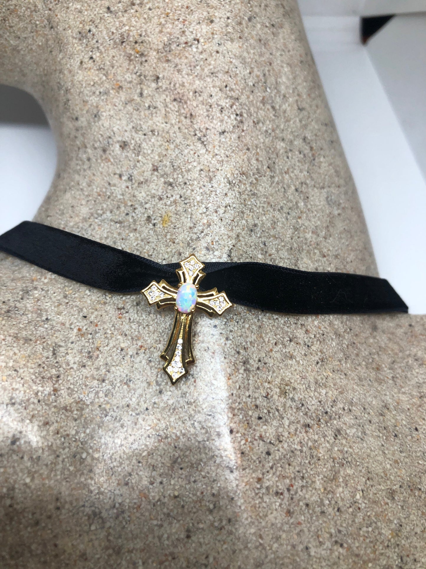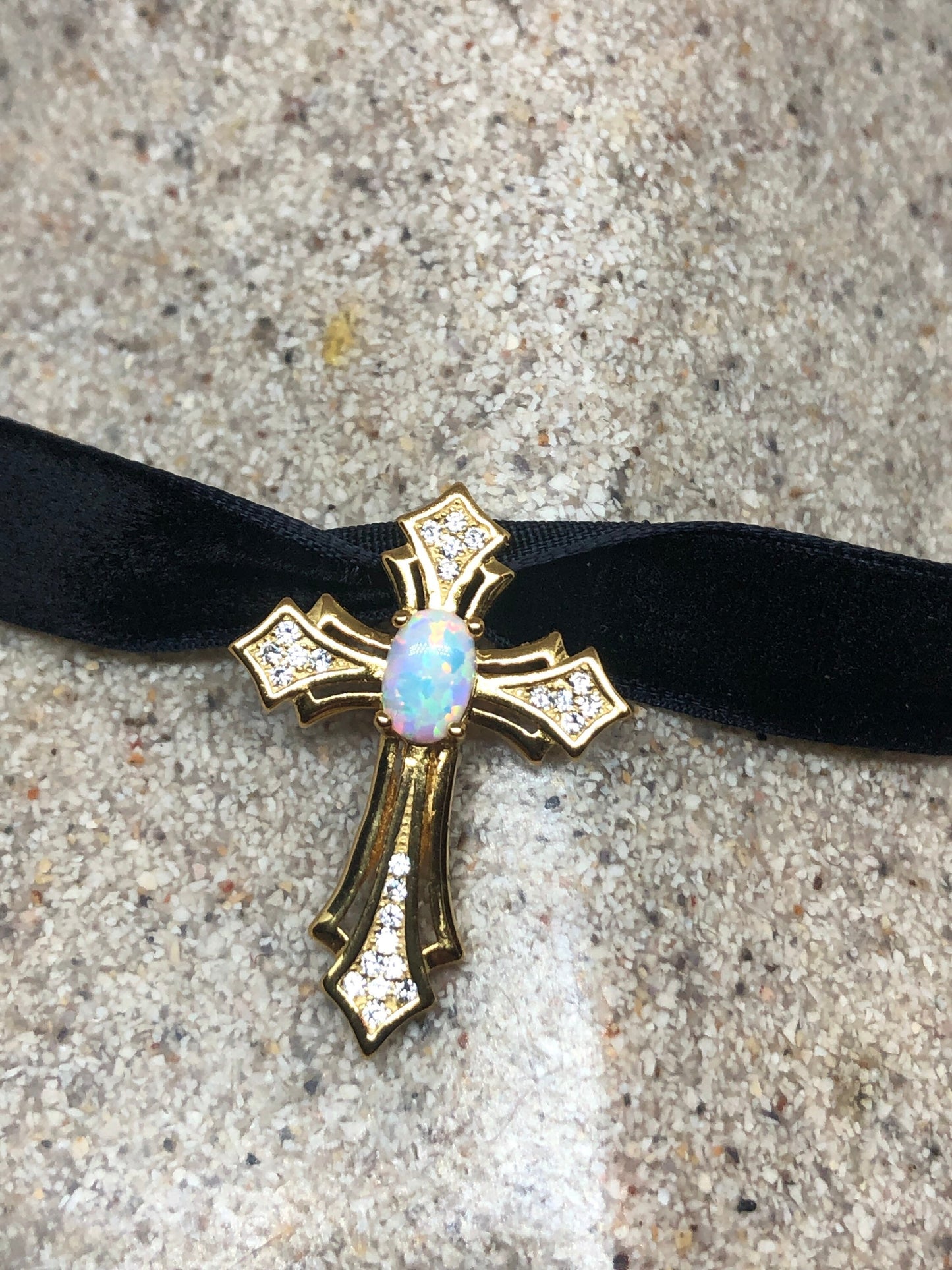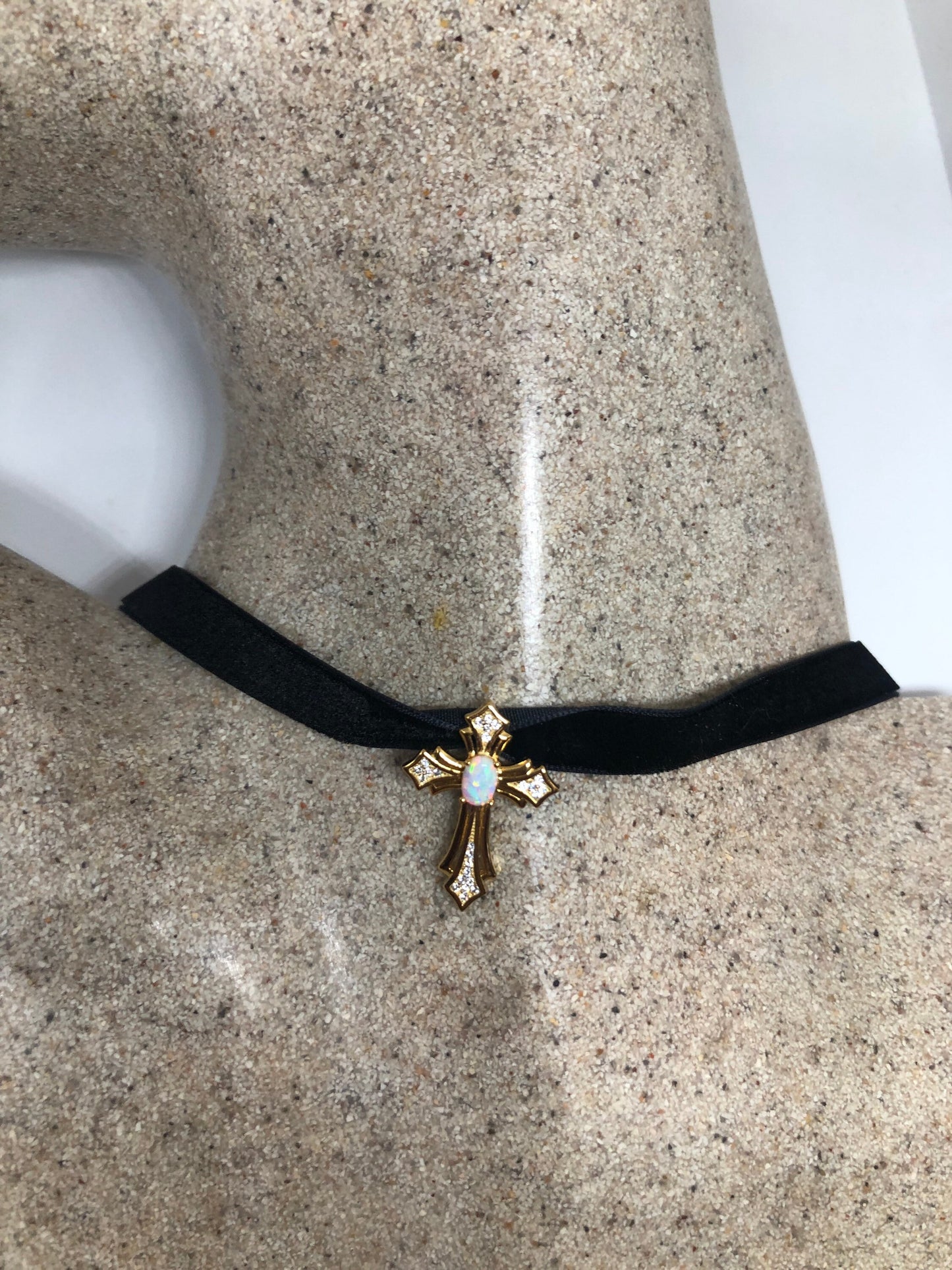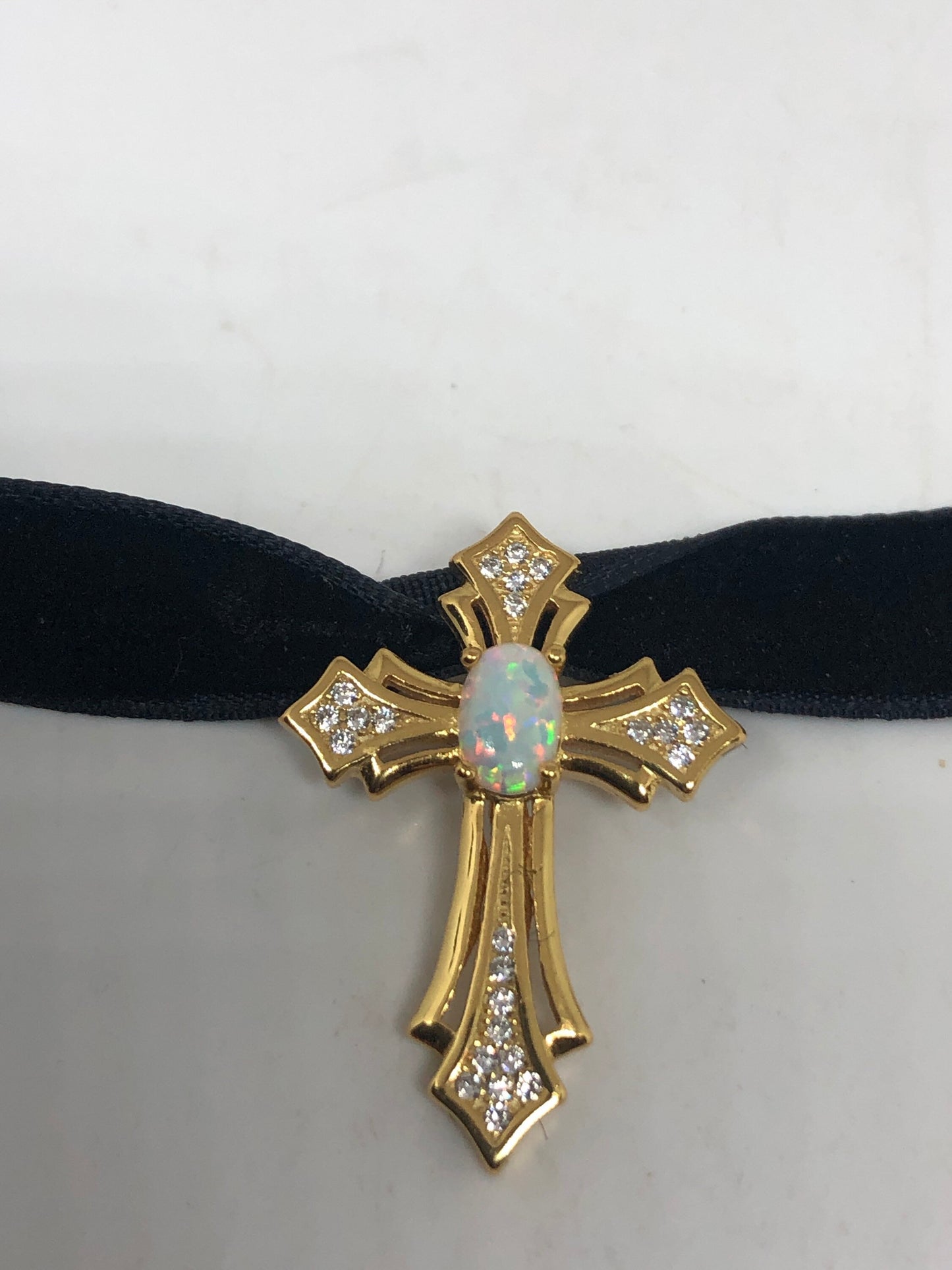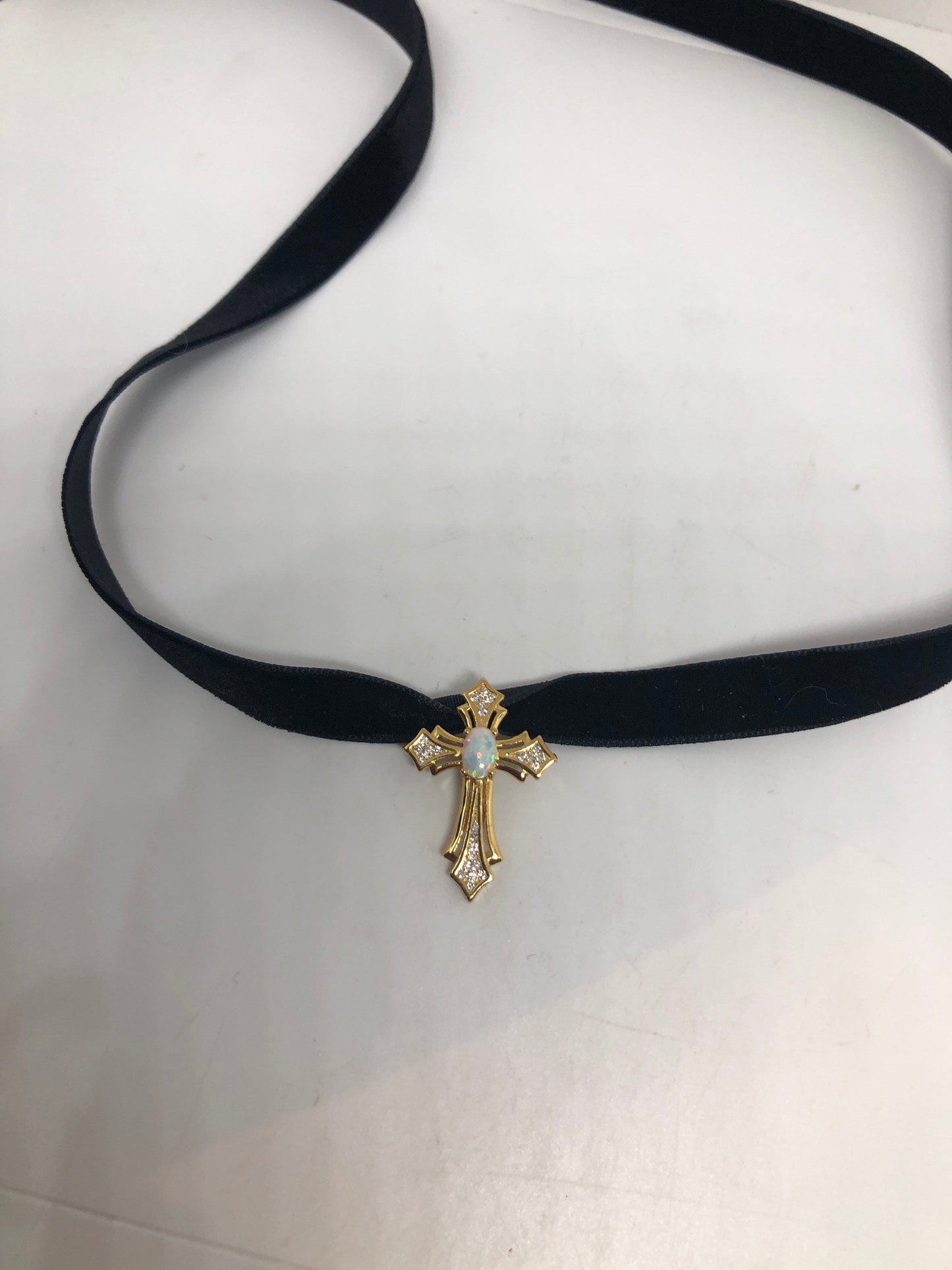 Vintage White Opal Cross Choker Golden 925 Sterling Silver Pendant Necklace