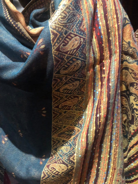 Vintage Teal Blue Paisley Brocade Pashmina Scarf Wrap Shawl