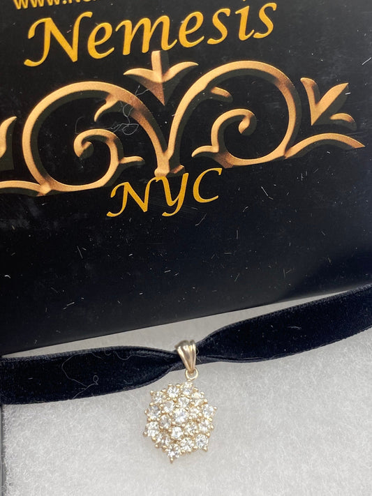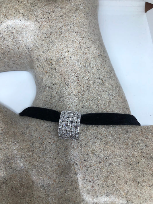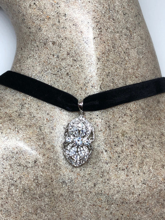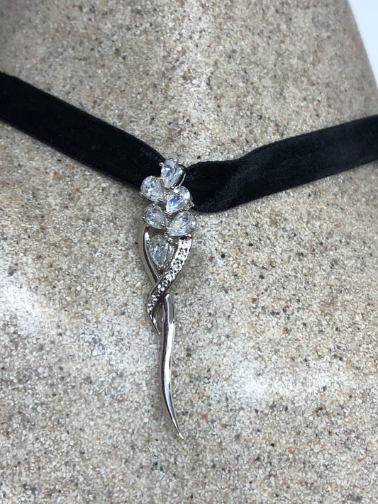 Vintage White Sapphire Choker 925 Sterling Silver Deco Pendant Necklace Velvet Ribbon Choker