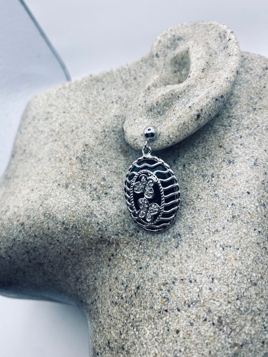 Vintage White Sapphire Butterfly 925 Sterling Silver Filligree Black Onyx Dangle Earrings