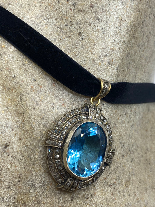 Vintage Blue Topaz Rose Cut Diamond Choker in 925 Sterling Silver
