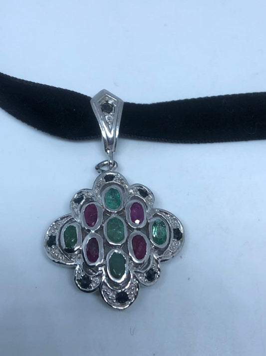 Handmade Vintage Green Emerald Ruby Sapphire 925 Sterling Filigree Pendant