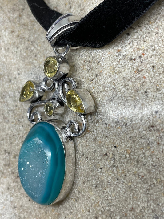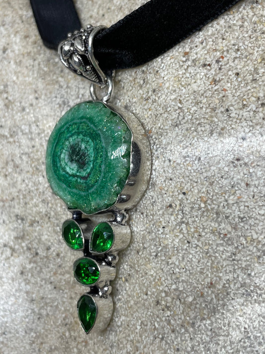 Handmade Vintage Green Chrysoprase Crystal Druzy Agate Choker Pendant