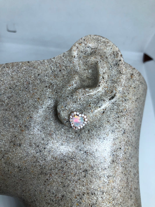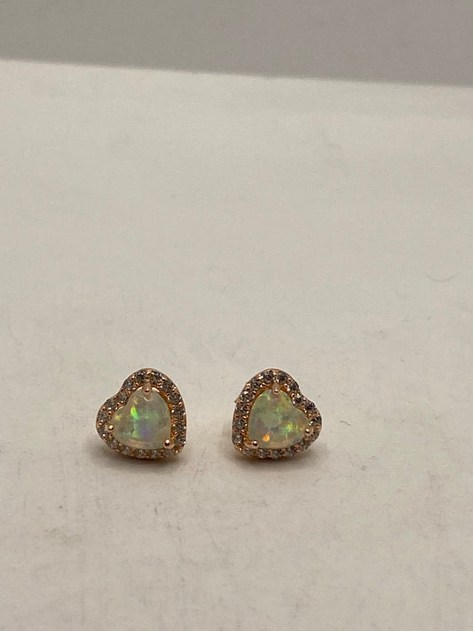 Vintage White Opal HEart Earrings Rose Golden 925 Sterling Silver Stud Button