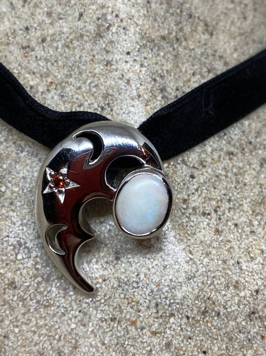 Vintage White Opal moon Choker 925 Sterling Silver Deco Pendant Necklace