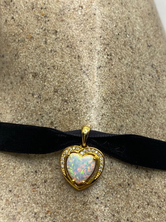 Vintage White Opal Heart Choker Golden 925 Sterling Silver Pendant Necklace