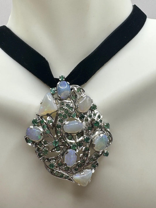 Vintage White Opal Green Emerald Choker 925 Sterling Silver Pendant Necklace Pin Brooch