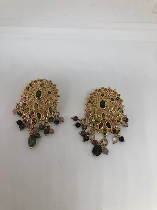 Vintage Genuine Mixed Color Tourmaline 925 Sterling Silver Golden Chandelier Dangle Earrings