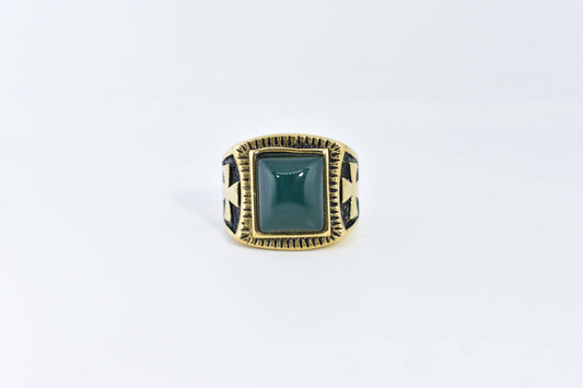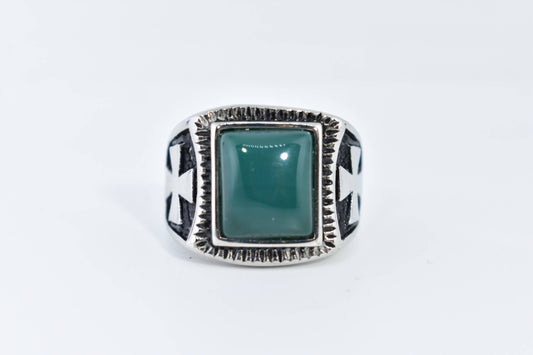 Vintage Gothic Silver Stainless Steel Genuine Green Onyx Mens Cross Ring