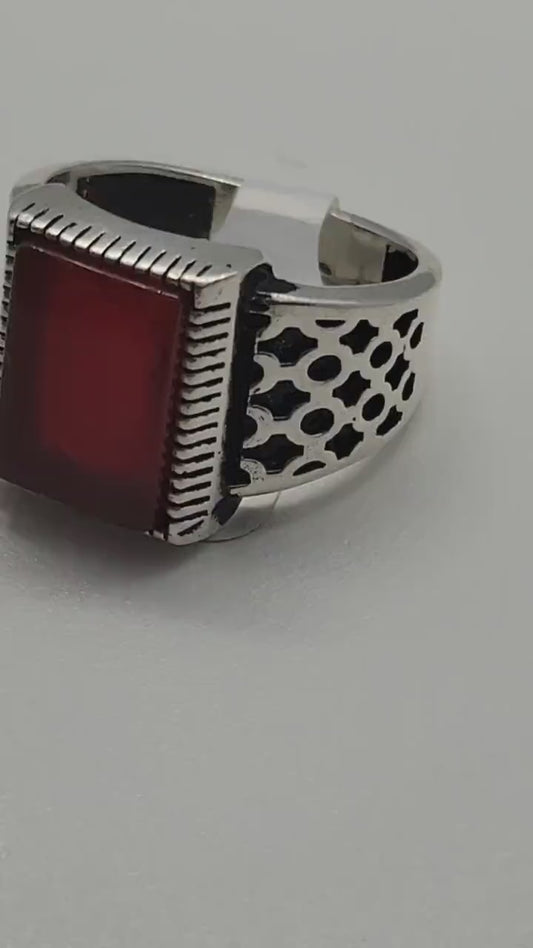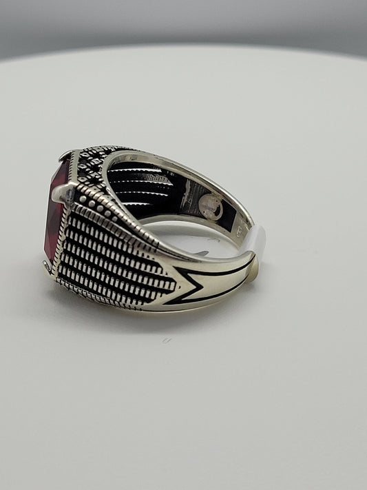 Vintage Ruby Glass Mens Ring in 925 Sterling Silver Modern Styled with Ruby Glass