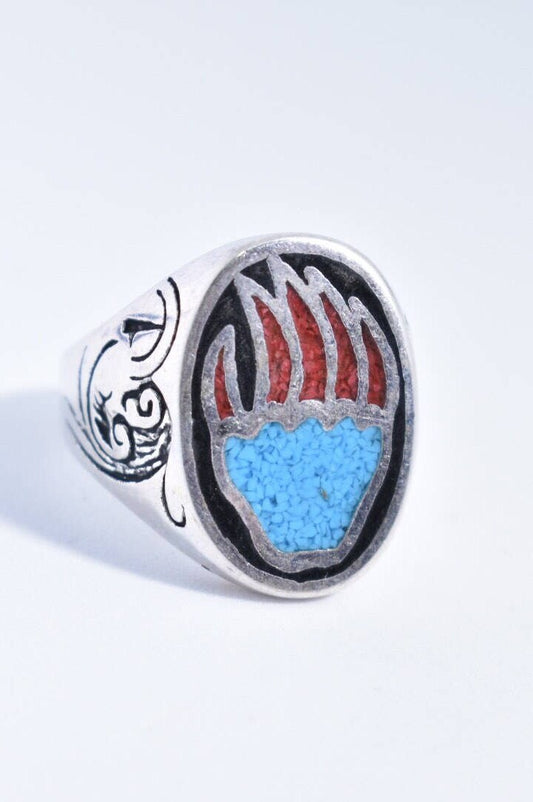 Vintage Native American Southwestern Style Turquoise Stone Inlay Mens Bear Paw Ring