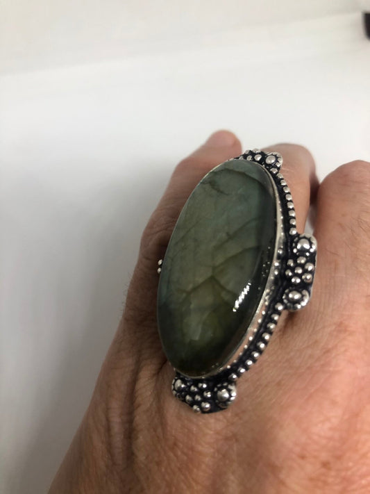 Vintage Green Labradorite Rainbow Moonstone Stone Silver Ring