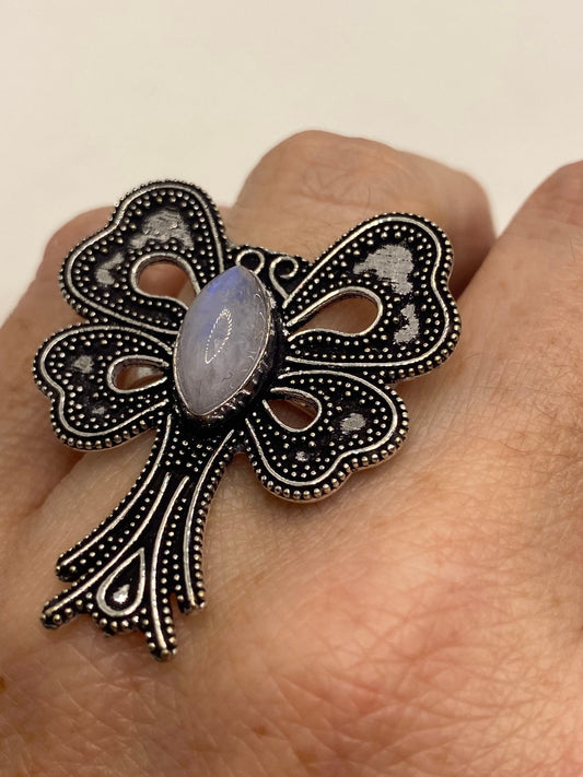 Vintage Lunar Moth Rainbow Moonstone White Bronze Silver Cocktail Ring Size 6.5
