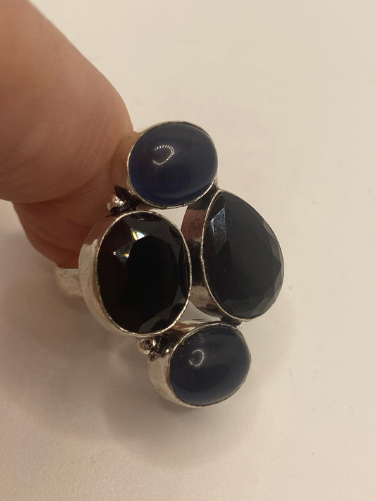 Vintage Faceted Black Onyx Cats Eye Silver Ring Size 6
