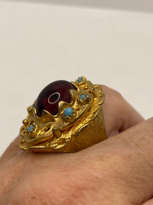 Vintage Red Ruby Glass Turquoise Golden Bronze Ring