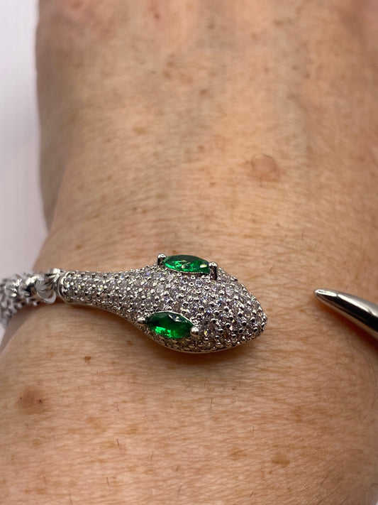 Vintage Snake Bangle Bracelet White Gold filled Green Crystal Eyes
