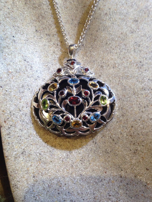 Vintage Bohemian Deep Red, Green and Yellow Gemstones 925 Sterling Silver Necklace with Filigree over Onyx