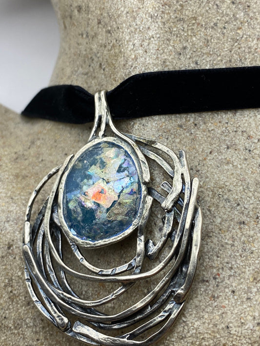 Vintage Ancient Glass 925 Sterling Silver Choker Pendant Necklace