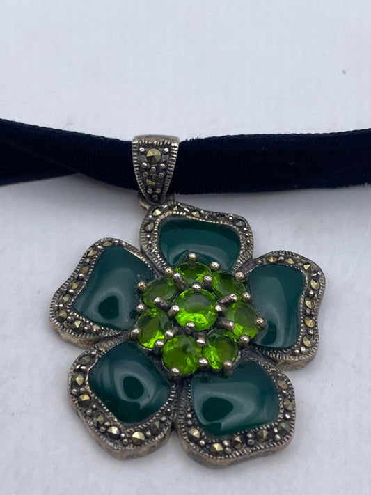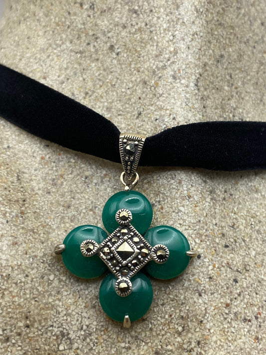 Vintage Marcasite Green Onyx Choker 925 Sterling Silver Deco Pendant Necklace
