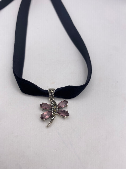 Vintage Amethyst Marcasite 925 Sterling Silver Dragonfly Dangle Pendant Necklace