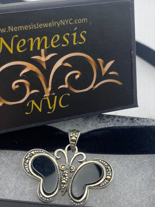 Vintage Black Onyx Marcasite 925 Sterling Silver Butterfly Pendant Necklace